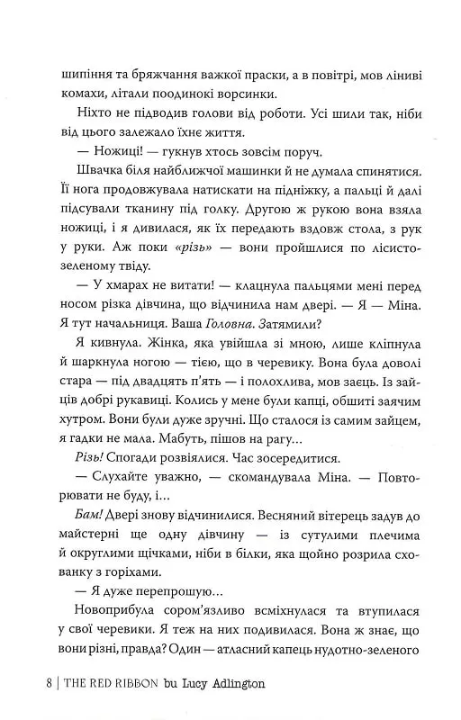 Як вижити підлітці Еллі, світ якої змінився? Війна позбавила її всього: замість дому — барак, замість одягу — смугастий мішок, замість імені — номер, замість майбутнього — дим з коминів. Проте навіть у цій жахливій безвиході концтабору дівчина будь-що прагне вижити. І ось вона вже кравчиня: шиє вбрання для наглядачок та офіцерш. А ще Елла подружилася з Роуз, яка видається беззахисною, проте навіть за колючим дротом почувається вільною.Отож у світі, де вона недолюдина, Елла щодень мусить робити вибір, ціною життя — її або чийогось. Що ж переможе: відчай та інстинкт виживання чи щира дружба і надія? А читач разом із героїнею робитиме вибір між яскравим, як червона стрічка, життям і сірою, як попіл, смертю.