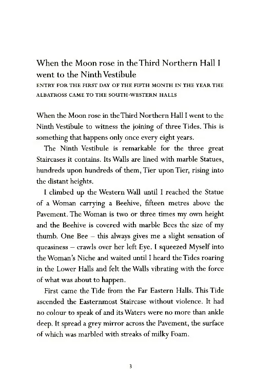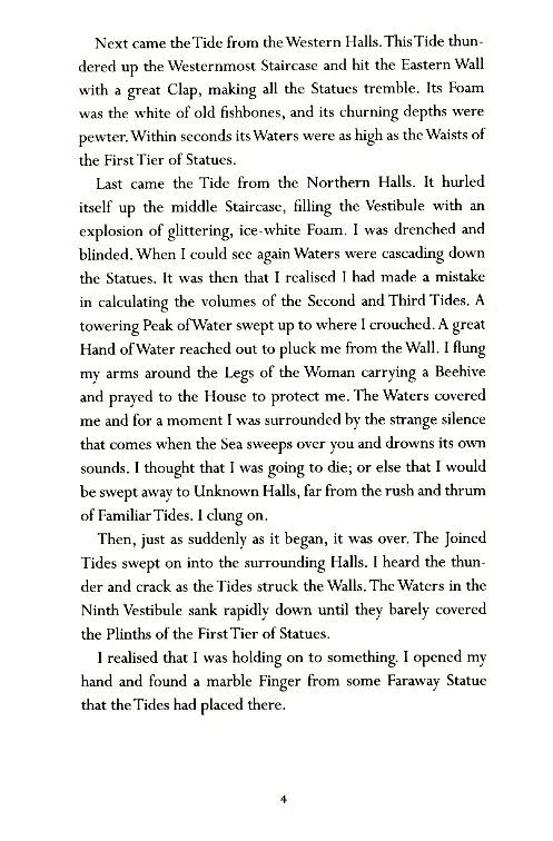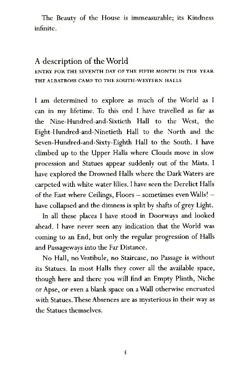 In his notebooks, day after day, he makes a clear and careful record of its wonders: the labyrinth of halls, the thousands upon thousands of statues, the tides that thunder up staircases, the clouds that move in slow procession through the upper halls. On Tuesdays and Fridays Piranesi sees his friend, the Other. At other times he brings tributes of food to the Dead. But mostly, he is alone.