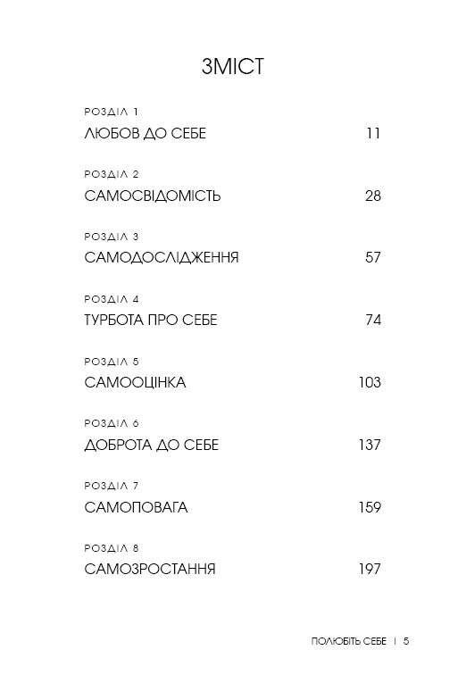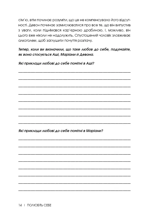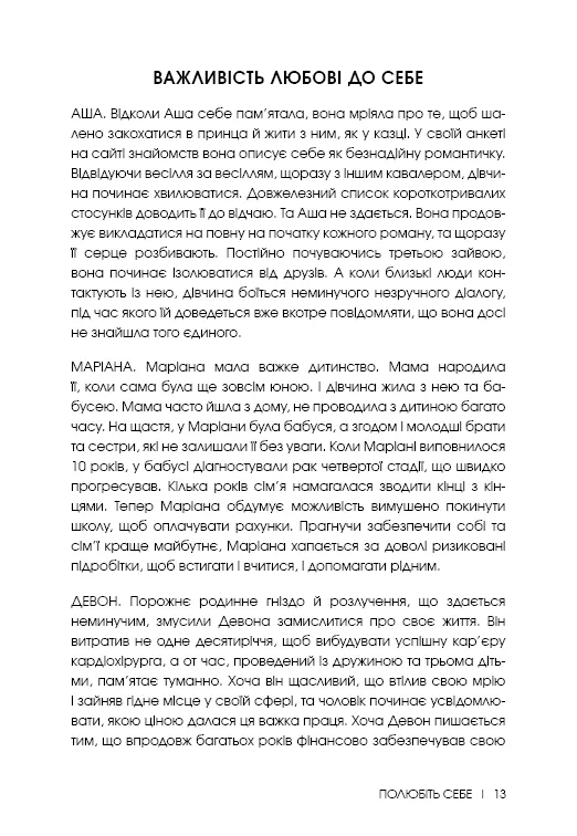 Вам потрібна любов від себе так само, як і від інших. Коли у вас низька самооцінка, низька впевненість або навіть ненависть до себе, неможливо жити повним життям. Настав час розвинути любов до себе й змінити своє ставлення, емоції та загальний погляд на життя! Цей корисний практичний зошит дасть вам змогу усвідомити свої унікальні потреби та цілі, а також дізнатися, як прийняти й полюбити себе. Він містить різноманітні конструктивні й дієві підказки та вправи, на виконання яких не потрібно багато часу, однак які змінять ваше життя на ліпше.