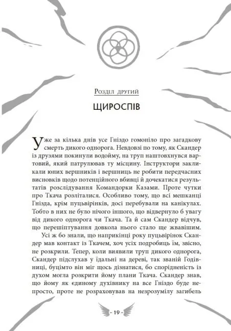 Скандер з друзями розуміють, що ці убивства — частина якогось злостивого задуму. Здається, що сам Острів мститься за нищення безсмертних руйнівними стихійними лихами. Чи до снаги квартету малечі зупинити смерті? Чи вдасться врятувати Острів? А ще б не вилетіти з другого курсу й залишитися в Гнізді на наступний рік!Дивно, що бодай хтось стає на бік Скандера, якщо, звісно, найславетнішу родину сідлярів чи Спільноту Сапсана, найкрутіше з товариств Гнізда, можна вважати «кимось». Попереду навчання й тренування, які мають завершитися лицарським турніром малечі, за результатами якого шістьох найслабших виженуть з Гнізда. А диких продовжують убивати…ГЕРОЇ ТА ОДНОРОГИ, ЯКИХ ВИ НІКОЛИ РАНІШЕ НЕ БАЧИЛИ По гриві й хвосту чорного звіра прокотилися електричні розряди… Здавалося, ніби вершник осідлав блискавицю, бо сам одноріг перетворився на стихію! Талан Пройдисвіта іржав у тріумфі, й у вирі електричних розрядів годі було розгледіти щелепи однорога! ЕПІЧНА ПРИГОДА ТРИВАЄ...