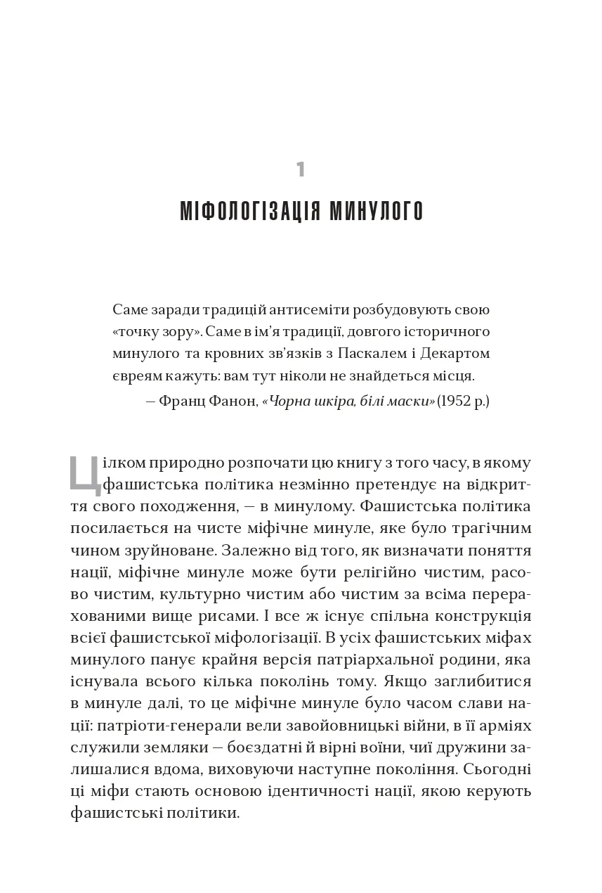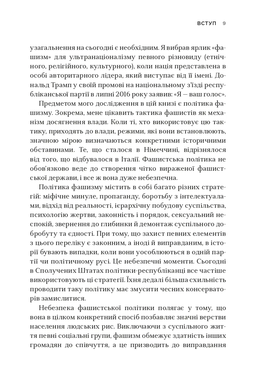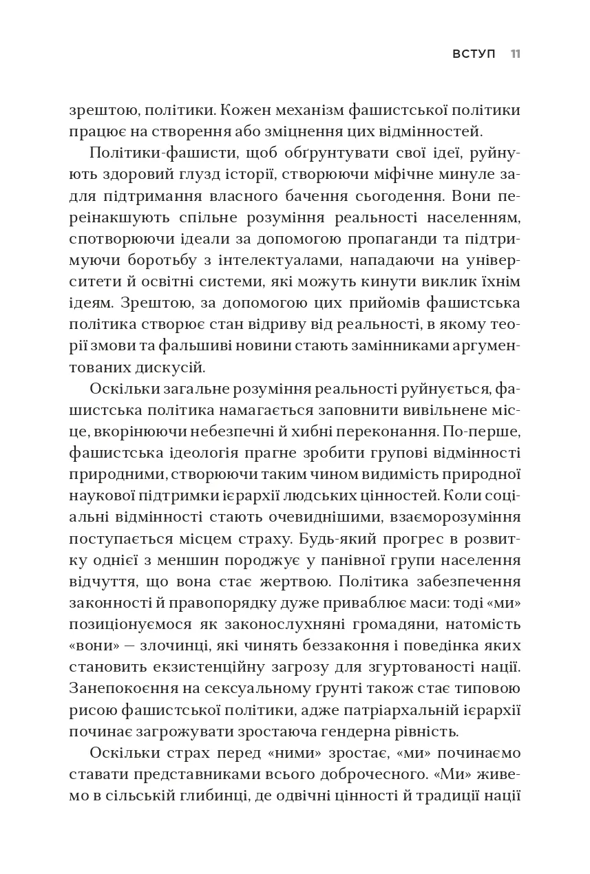 Незважаючи на значний поступ демократії в усьому світі, останніми роками спостерігається підвищення інтересу до застосування методів фашистської політики навіть у найрозвиненіших демократичних країнах. Чим викликані такі тенденції і як їх розпізнати? Чому фашизм піднімає голову на теренах Європи й Америки? Філософ з Єльського університету Джейсон Стенлі визначає ознаки, що дають змогу простежити скочування країн до елементів фашизму: вигадування «славетного» минулого на противагу реальним історичним подіям, боротьба з інтелектуалами, спроби ієрархічної побудови суспільства, використання сучасних ЗМІ як засобів пропаганди на користь однієї суспільної групи чи політичної партії тощо. Дослідник пояснює, як фашистські політики намагаються збурювати в суспільстві паніку, нав’язувати свої стереотипи та применшувати здобутки ліберальної демократії, на якій побудована сучасна західна цивілізація, а також вказує на загрози, які принесе з собою демагогічна риторика і практика неофашистів у США, Угорщині та деяких інших країнах, якщо їх вчасно не виявити та не зупинити.Книга призначена для філософів, соціологів та широкого кола читачів, які цікавляться сучасними тенденціями світової політики.