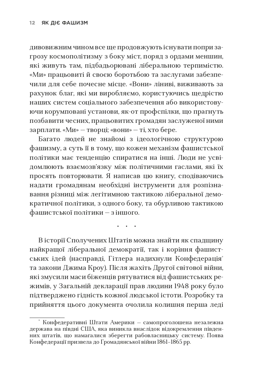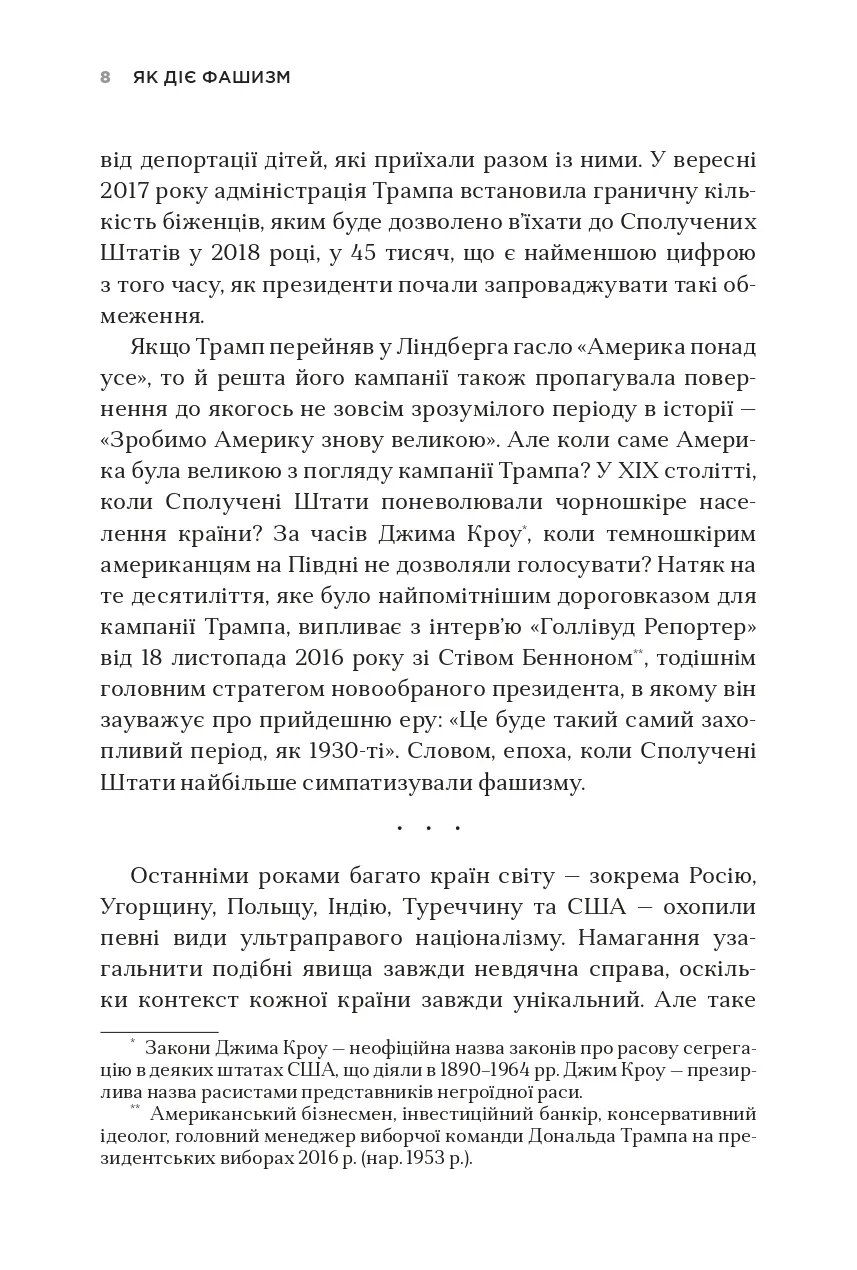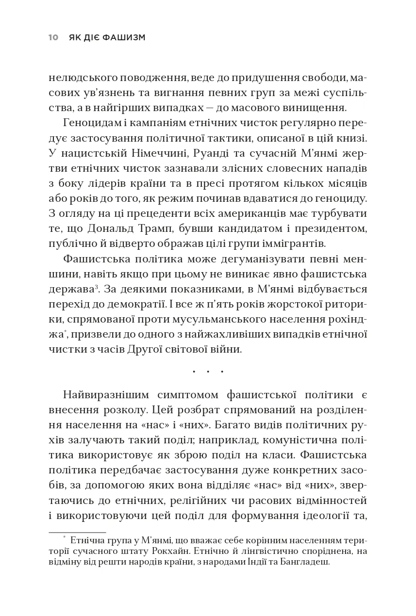 Незважаючи на значний поступ демократії в усьому світі, останніми роками спостерігається підвищення інтересу до застосування методів фашистської політики навіть у найрозвиненіших демократичних країнах. Чим викликані такі тенденції і як їх розпізнати? Чому фашизм піднімає голову на теренах Європи й Америки? Філософ з Єльського університету Джейсон Стенлі визначає ознаки, що дають змогу простежити скочування країн до елементів фашизму: вигадування «славетного» минулого на противагу реальним історичним подіям, боротьба з інтелектуалами, спроби ієрархічної побудови суспільства, використання сучасних ЗМІ як засобів пропаганди на користь однієї суспільної групи чи політичної партії тощо. Дослідник пояснює, як фашистські політики намагаються збурювати в суспільстві паніку, нав’язувати свої стереотипи та применшувати здобутки ліберальної демократії, на якій побудована сучасна західна цивілізація, а також вказує на загрози, які принесе з собою демагогічна риторика і практика неофашистів у США, Угорщині та деяких інших країнах, якщо їх вчасно не виявити та не зупинити.Книга призначена для філософів, соціологів та широкого кола читачів, які цікавляться сучасними тенденціями світової політики.
