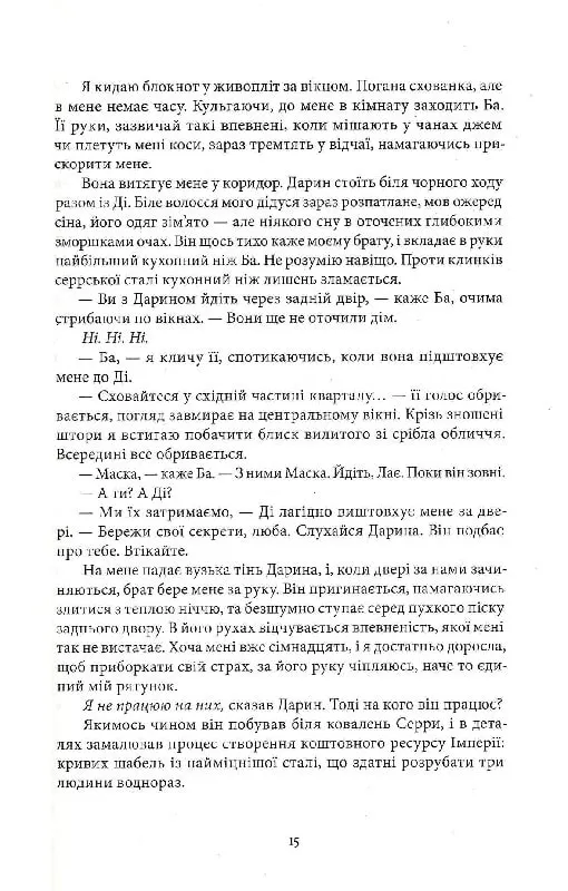 Вістря клинка — його чернець. Моя молитва в танку ран. Моя свобода — чийсь кінець. Імперія з її тиранічним і безжальним правлінням, жорстоким рабством Просвітників, елітними та холодними солдатами-Масками, які живуть лише для того, щоб служити та вбивати для Імперії, які винищують сім'ї та руйнують надії — це не те місце, де полум'я Опору може зробити навіть подих, перш ніж його загасять і поховають.
