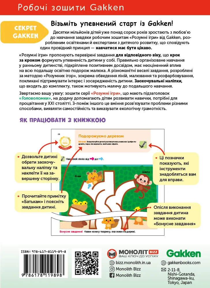 Важливою складовою підготовки малюка до початкової школи є побудова базових навичок, як-от самостійності й наполегливості, уміння спілкуватися й співпрацювати, критично мислити та розв’язувати проблеми під час їх появи, творчо підходити до завдань, фантазувати. У віці від двох до чотирьох років закладаються основи самостійності й успіху дитини в майбутньому.Саме на це націлена книжка «Gakken. Розумні ігри. Побудова навичок. Головоломки. 2-4 роки». Вона входить до серії книжок «Розумні ігри», що забезпечує дітей комплексними знаннями та навичками та сприяє гармонійному розвитку малечі в цілому.Виконуючи веселі вправи, з яких складається книжка, малюк бавитиметься і водночас набуватиме неоціненний досвід.