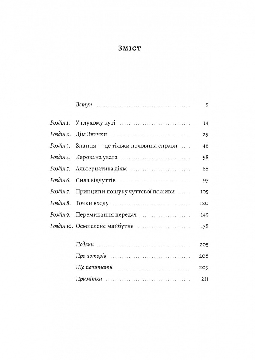 Для багатьох із нас повсякденне життя втратило сенс. Високоефективні механізми, які колись полегшували життя, тепер виснажують нас. Шаблони суджень і негативне мислення призводять до розкручування емоційної спіралі. Для декого життя просто втратило свою іскру. Коли ми боремося з проблемою чи шкідливою звичкою, то вважаємо, що потрібно бути стійкими, все витримати і докласти більше зусиль. Але коли ми так робимо, то мозок подвоює шаблони мислення, через які ми і застрягли. На щастя, наука про відчуття дає ключ до розв'язання цієї проблеми.
