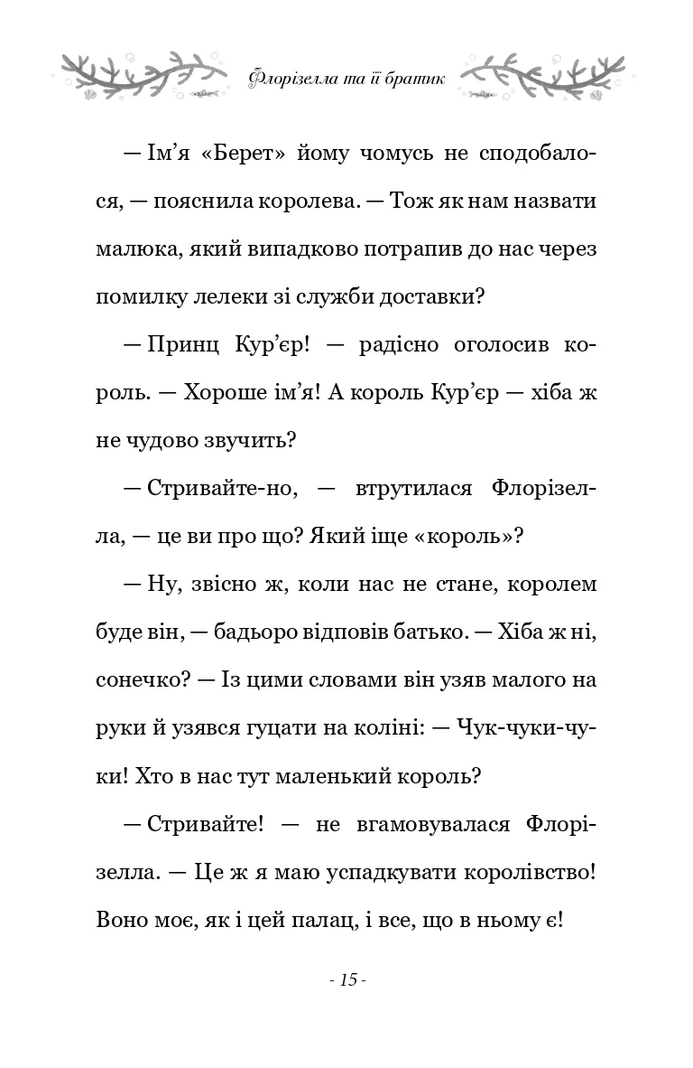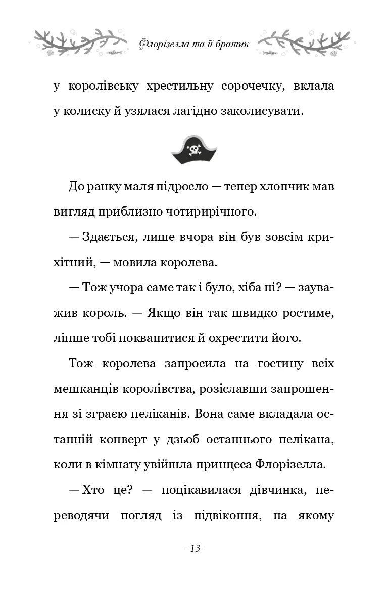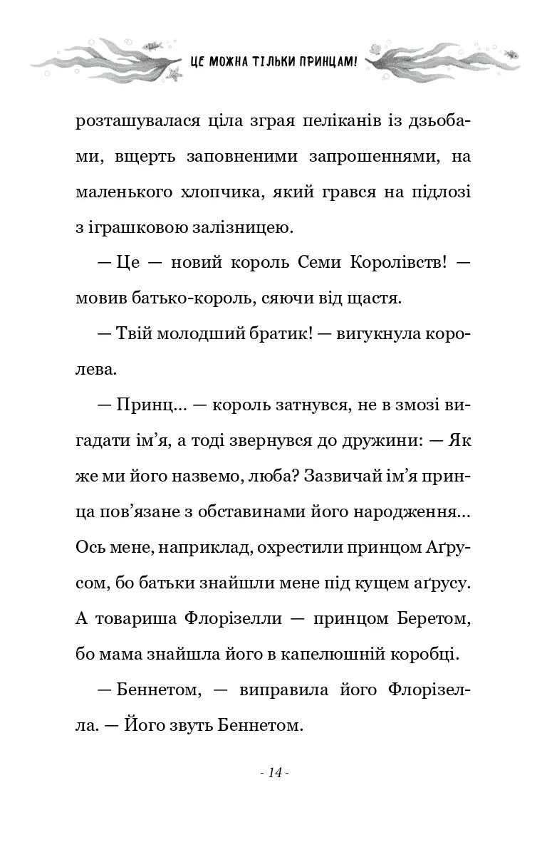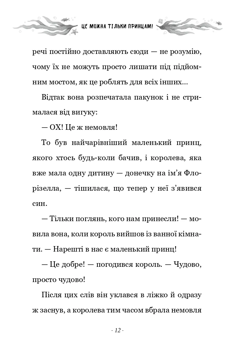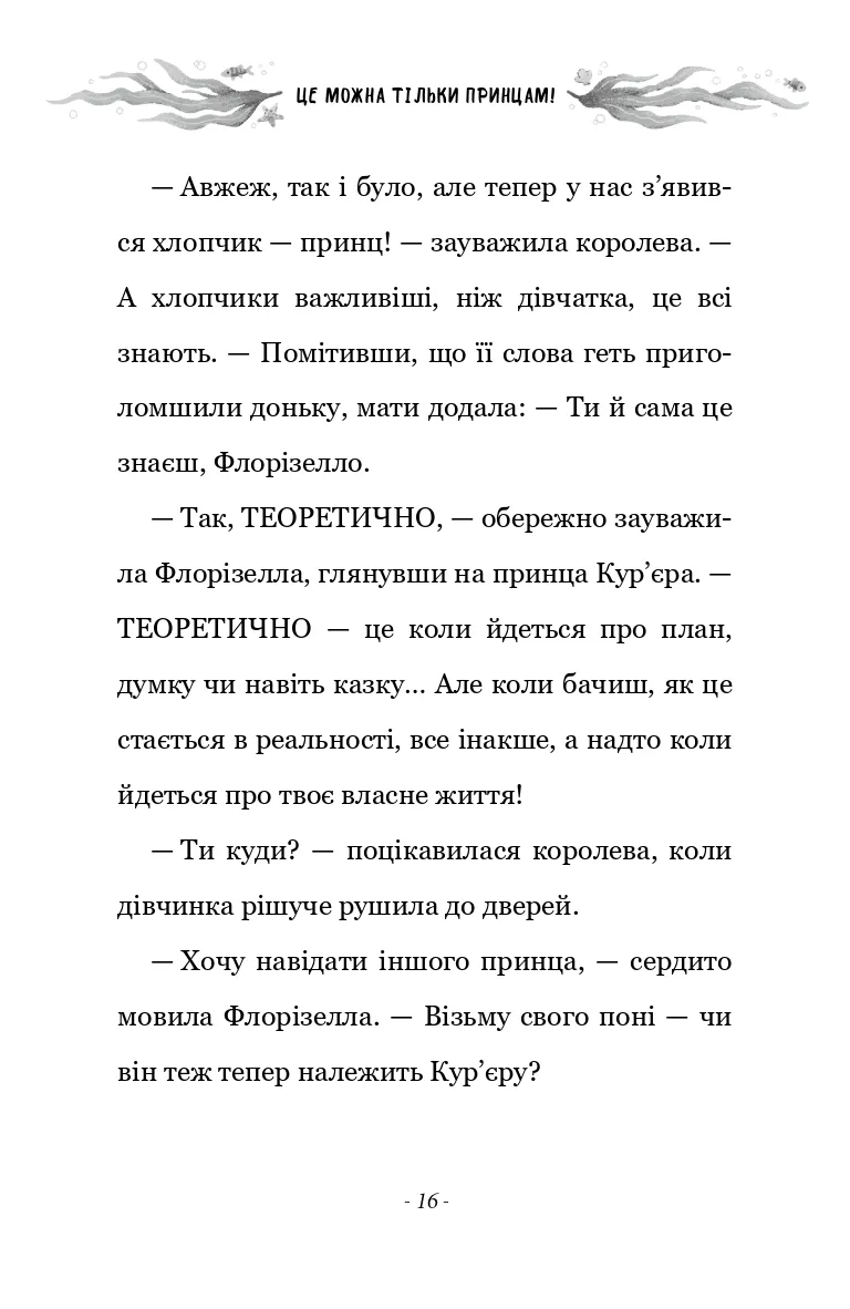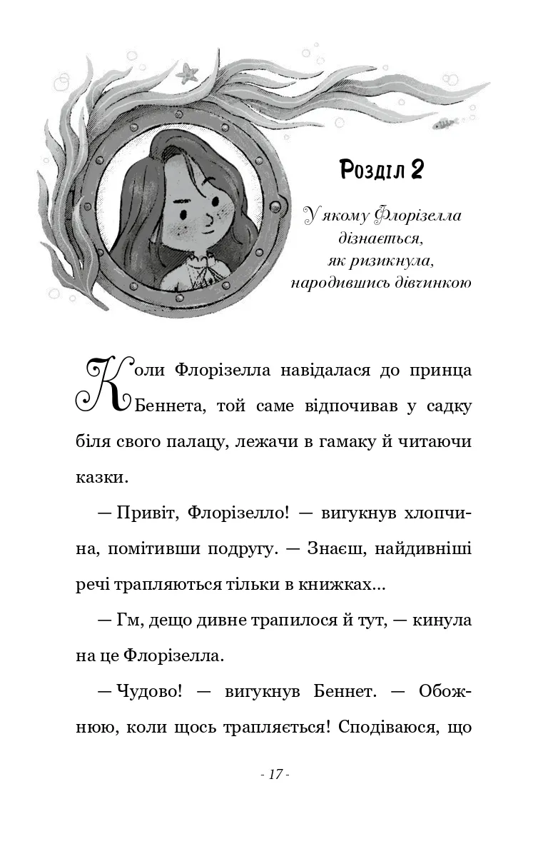 Разом із вірним другом принцом Беннетом їм утрьох доведеться мати справу з піратами, боротися з морським змієм, а ще пощастить познайомитися з милим волохатим мамонтом. То чи зможе Флорізелла довести, що встановлені для дівчат правила, а для хлопців — дозволи, варто порушувати? І що принци та принцеси, дівчата та хлопчики можуть самі обирати, ким вони хочуть бути… Для дітей молодшого та середнього шкільного віку.
