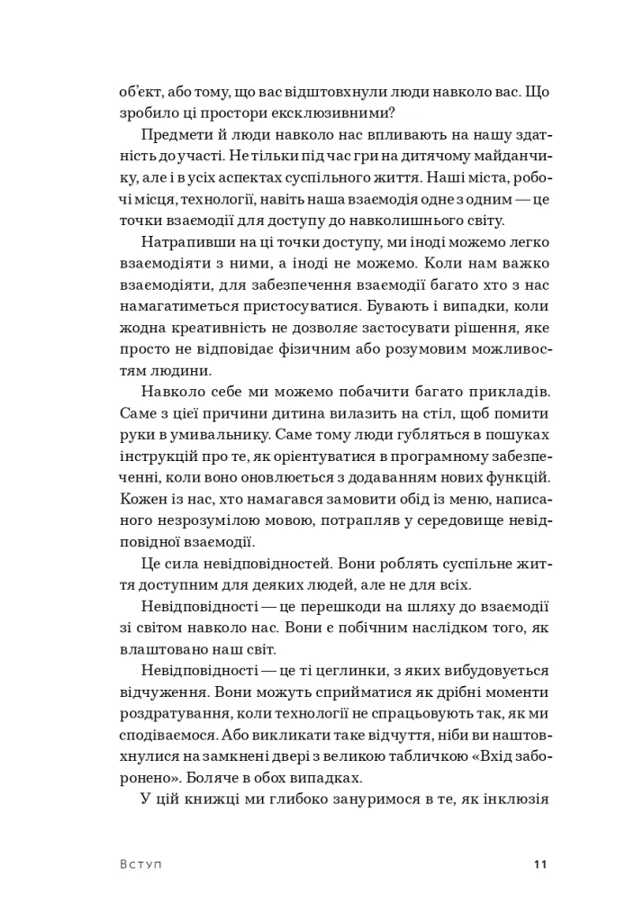 Предмети й люди навколо нас впливають на нашу здатність до участі в усіх аспектах суспільного життя. Наші міста, робочі місця, технології, навіть наша взаємодія одне з одним — це точки взаємодії для доступу до навколишнього світу. Натрапивши на ці точки доступу, ми іноді можемо легко взаємодіяти з ними, а іноді не можемо. Коли взаємодіяти важко, багато хто з нас намагатиметься пристосуватися. Але часом жодна креативність не дозволяє застосувати рішення, бо воно просто не відповідає фізичним або розумовим можливостям людини.