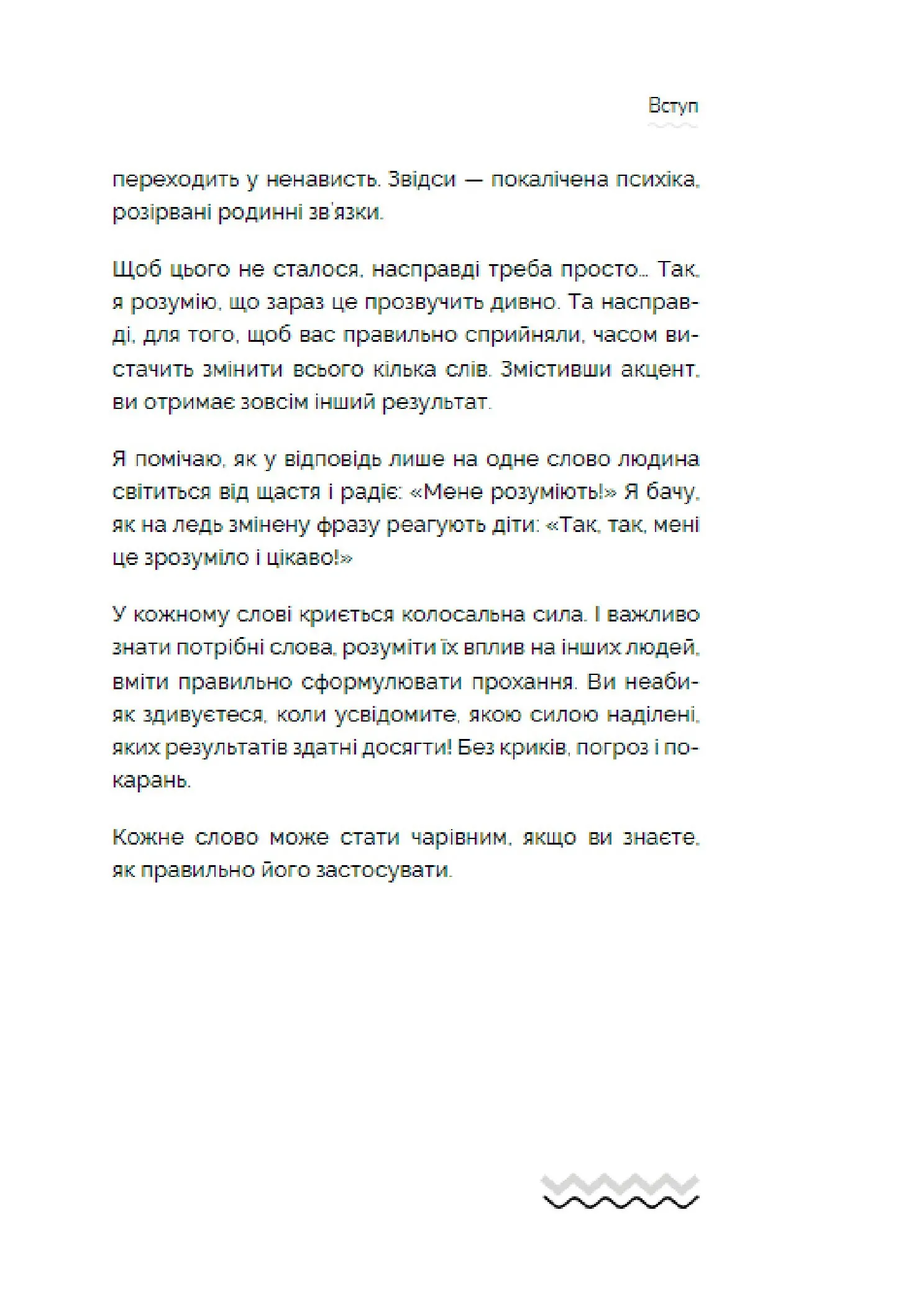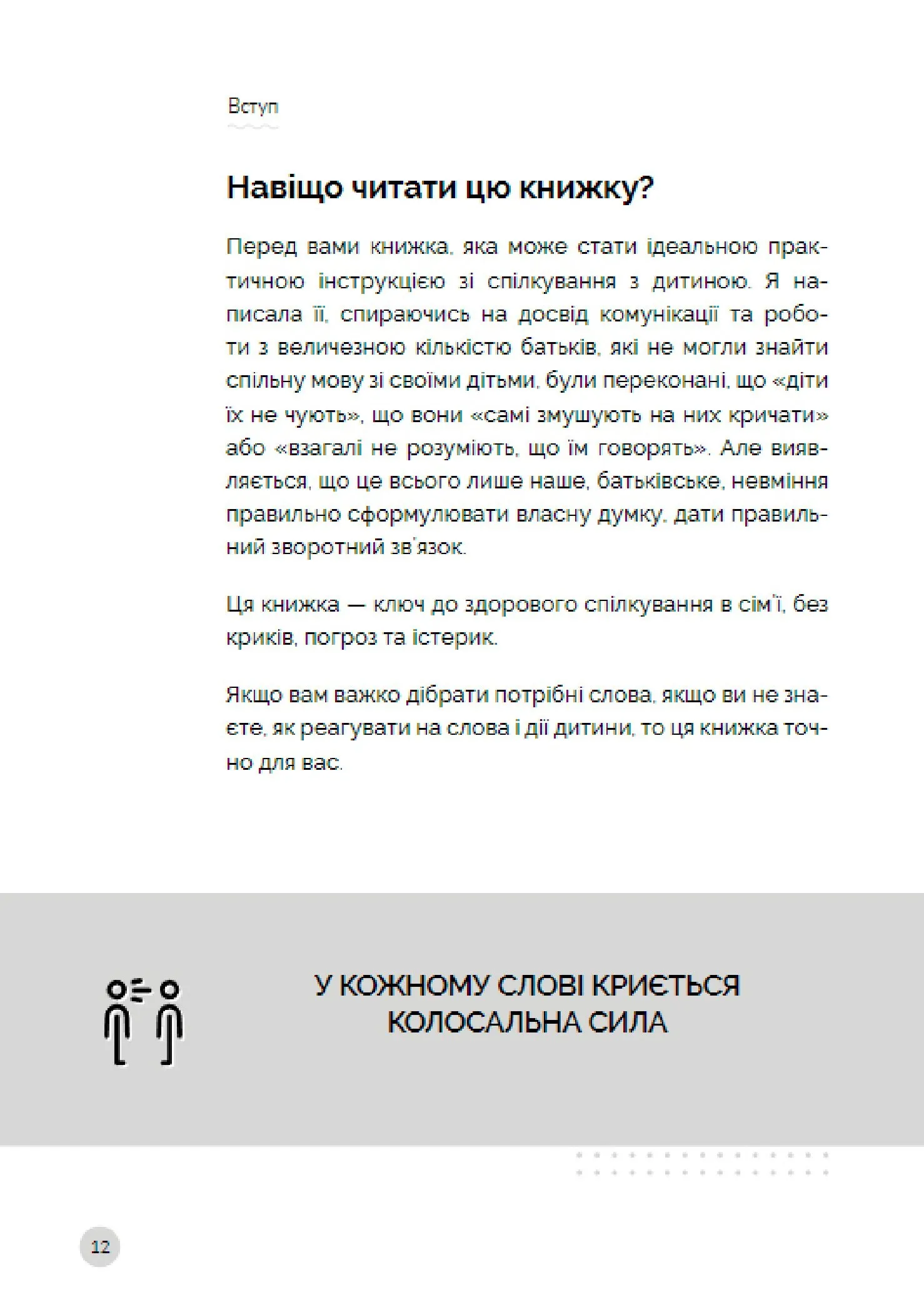 Книга пропонує альтернативні методи вирішення конфліктів без криків та сварок. Читачі навчаться зосереджуватися на коректних і ефективних способах вербального і невербального впливу. Батьки дізнаються, як ефективно формулювати свої думки і доносити їх додитини, щоб вона могла краще розуміти та сприймати інформацію.