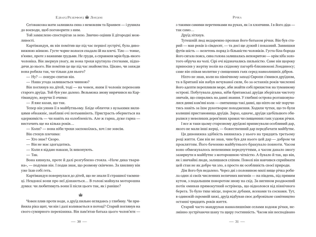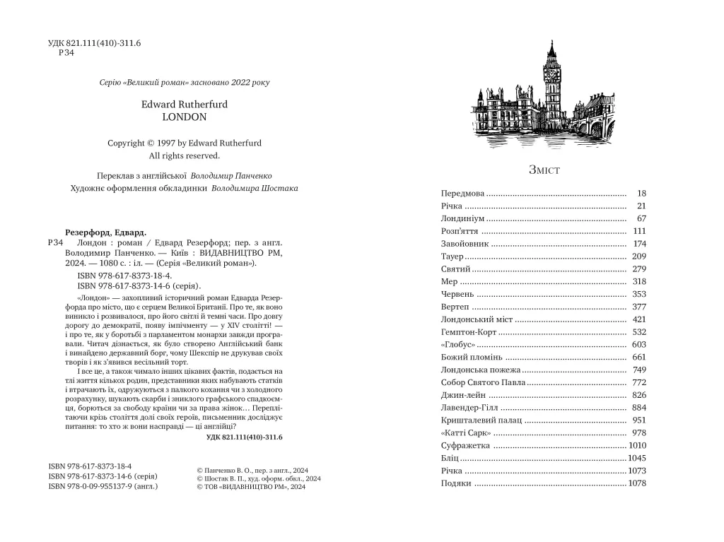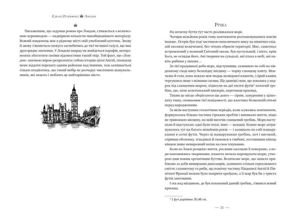 «Лондон» — захопливий історичний роман Едварда Резерфорда про місто, що є серцем Великої Британії. Про те, як воно виникло і розвивалося, про його світлі й темні часи. Про довгу дорогу до демократії, появу імпічменту — у XIV столітті! — і про те, як у боротьбі з парламентом монархи завжди програвали. Читач дізнається, як було створено Англійський банк і винайдено державний борг, чому Шекспір не друкував своїх творів і як з’явився весільний торт.