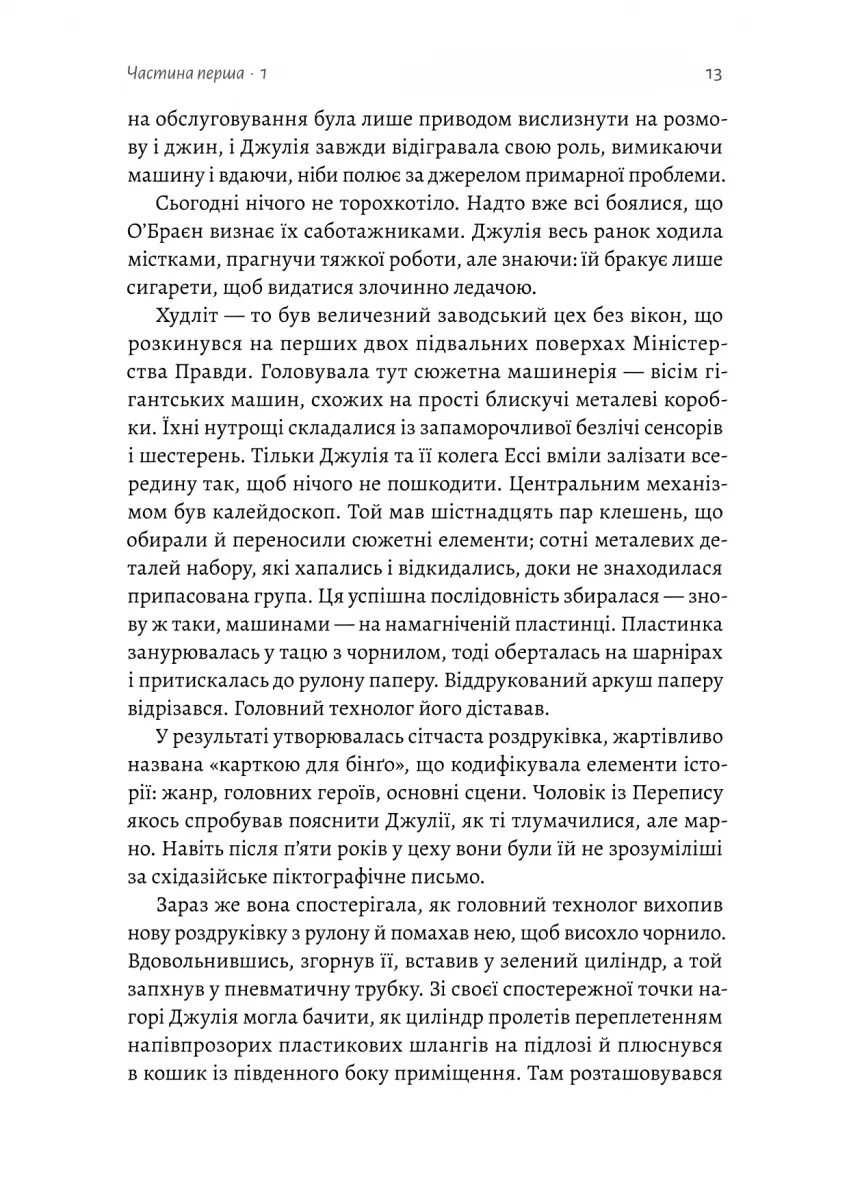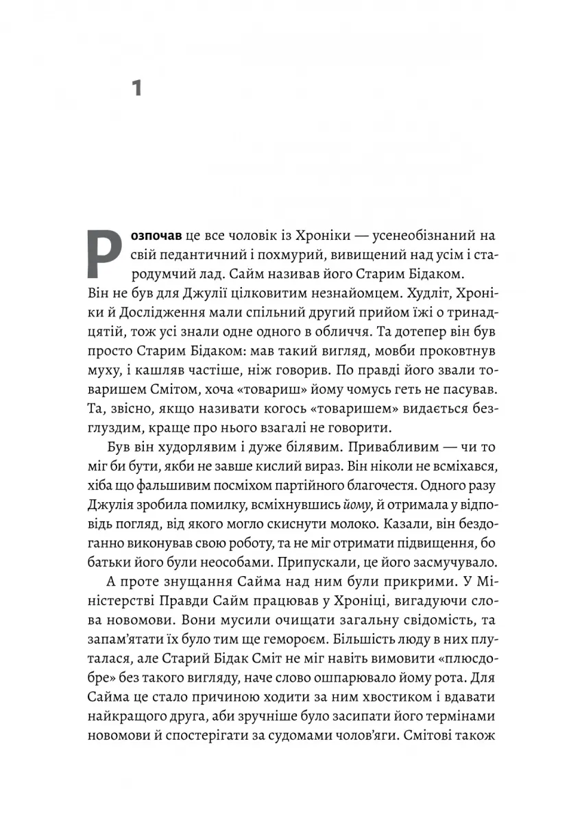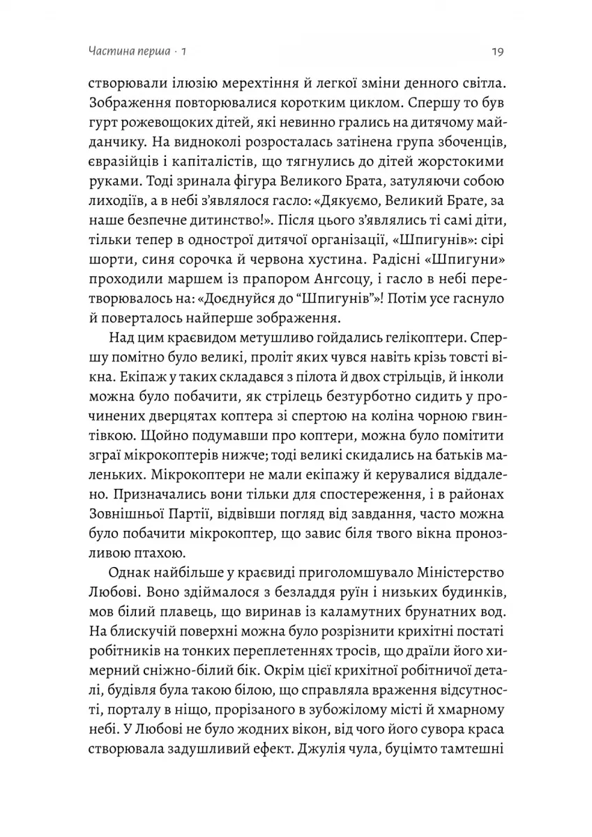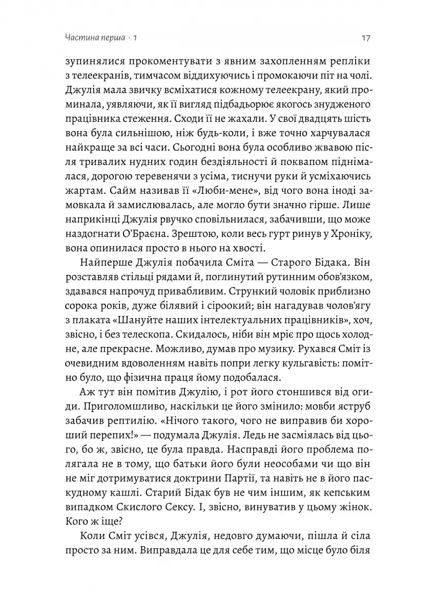 Вона кохала його, бо це було заборонено. Кохала, щоби бути безстрашною • A PEOPLE Magazine Must-Read Book for Fall 2023. An Esquire Best Book of Fall 2023. A Guardian Biggest New Book of 2023. Найочікуваніша книжка 2023 року за версією LitHub • Це провокативний, зловтішний і захопливий погляд ізсередини орвеллівського світу Лондон — головне місто Злітної смуги Один, третьої за чисельністю населення провінції Океанії. 1984 рік, Джулія Вортінг працює механікинею, яка лагодить машини для написання романів у відділі Худліту в Міністерстві Правди. Згідно з ідеологією Ангсоцу, правління партії та її лідера Великого Брата, Джулія є зразковою громадянкою — життєрадісно-цинічною, ні в що не вірить і зовсім не переймається політикою. Вона регулярно порушує правила, але також співпрацює з режимом, коли це необхідно. Джулію люблять усі, бо вона знає, як вижити у світі постійного нагляду Поліції Думок, дітей-шпигунів і чорних ринків пролетарських районів. Вона дуже добре вміє виживати. Але Джулію починає інтригувати Вінстон Сміт — колега з відділу записів і працівник середньої ланки Зовнішньої Партії. Одного дня вона імпульсивно підсовує йому записку і усвідомлює, що втрачає контроль і більше не може почуватися у безпеці в цьому світі.