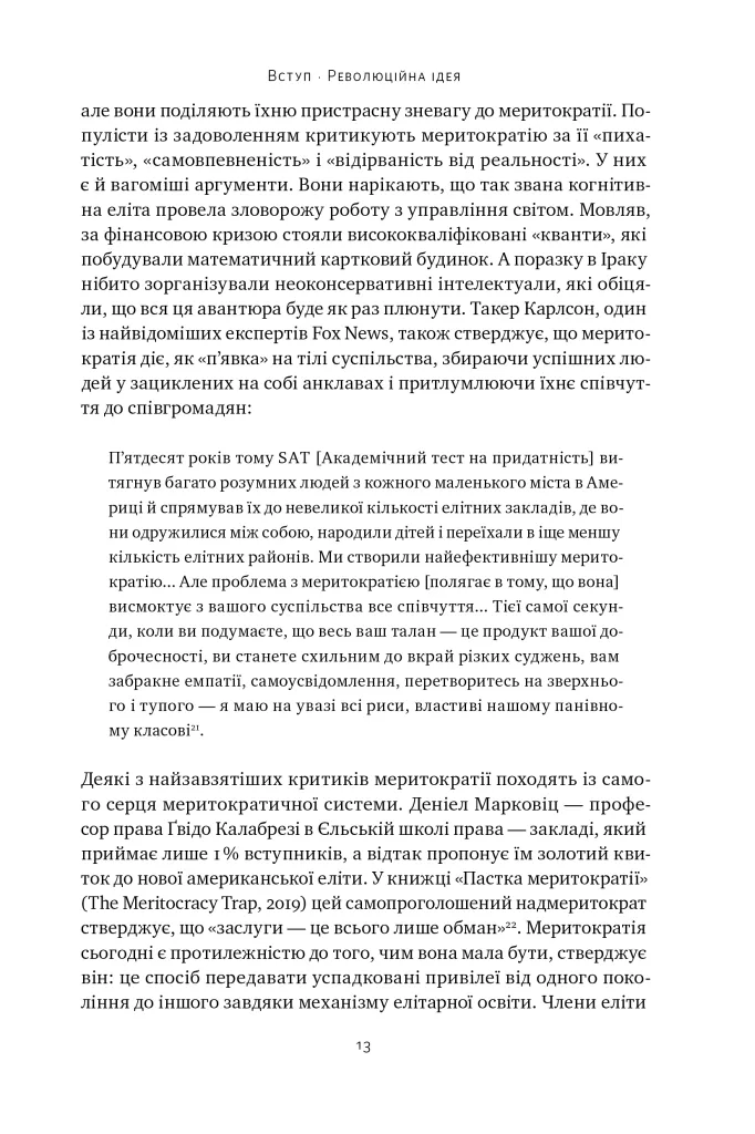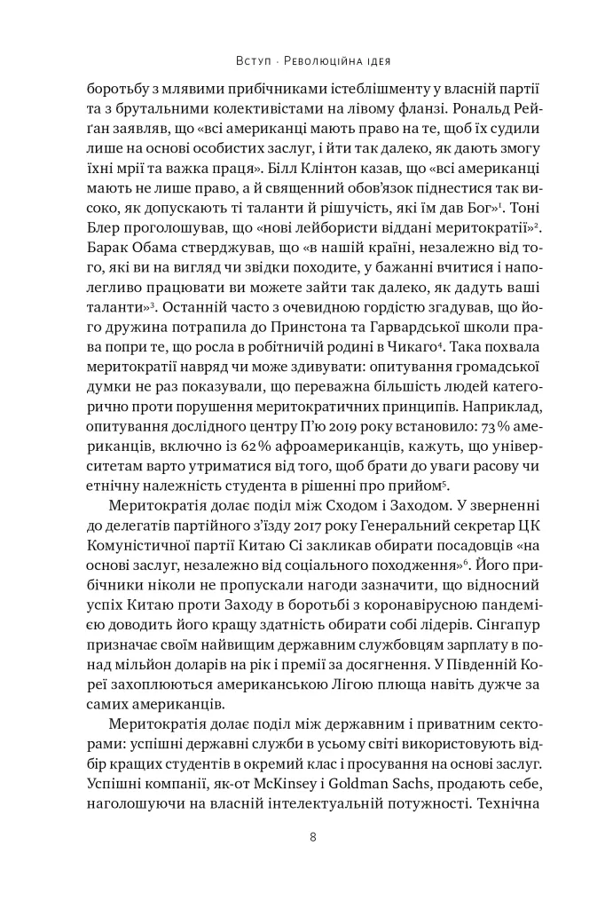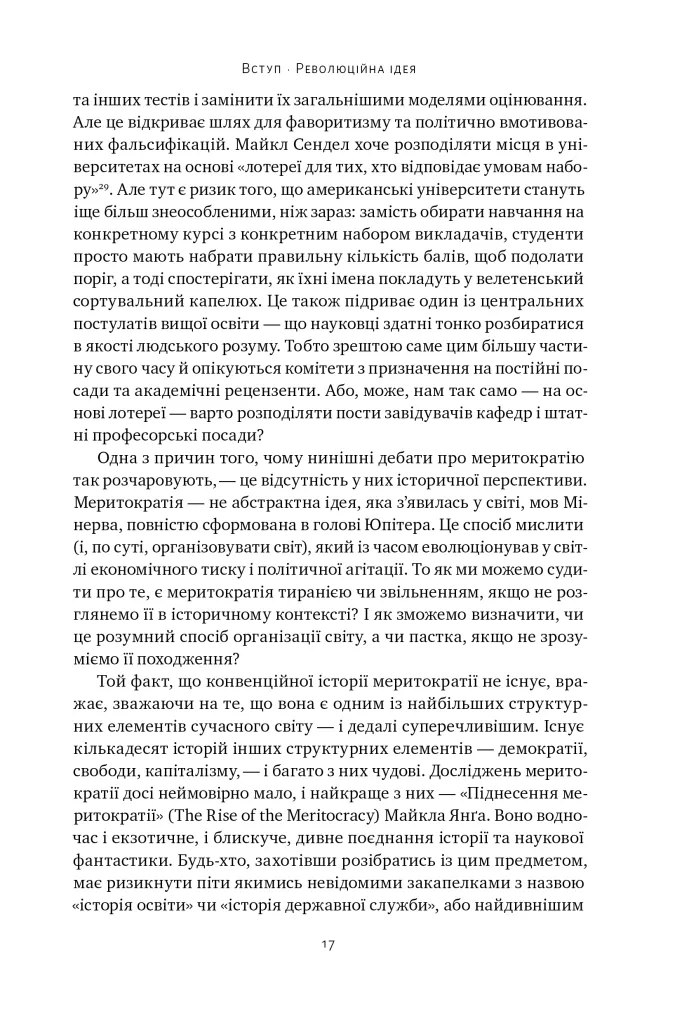 Що дає змогу найкраще визначити, чи гідна людина обіймати важливі посади? Тест на IQ, як вважало чимало британських і американських науковців ХІХ і початку ХХ століття? Чи, може, кількаденний іспит, учасники якого мали подолати фізичні й розумові перепони, як упродовж століть було в Китаї? У різний час і в різних місцях правителі й цілі суспільства винаходили та випробовували найрізноманітніші варіанти, щоб досконало втілити принципи меритократії — влади найкращих, влади гідних. Автор простежує історію меритократії від часів винайдення в Стародавні часи і до її сьогоднішньої кризи, щоб врешті поставити ключові питання — яке в неї майбутнє і чи є їй адекватні альтернативи?
