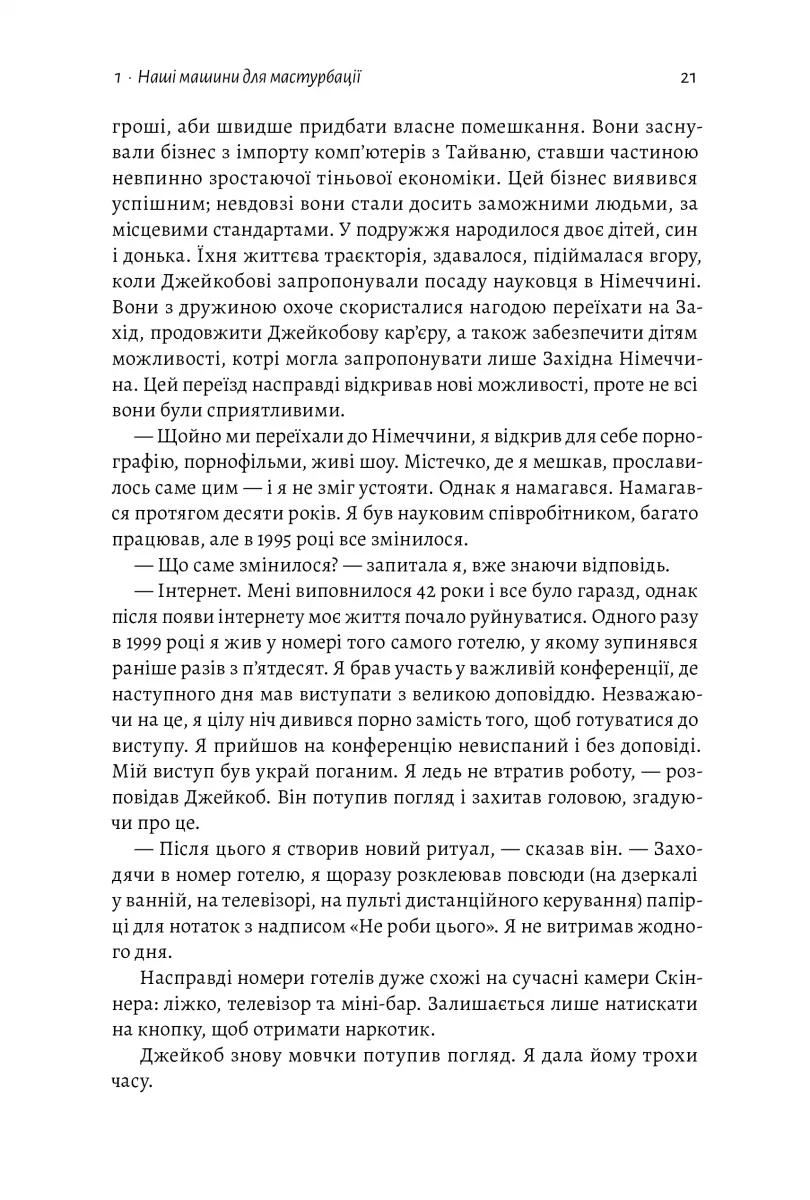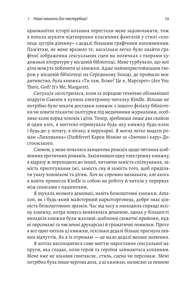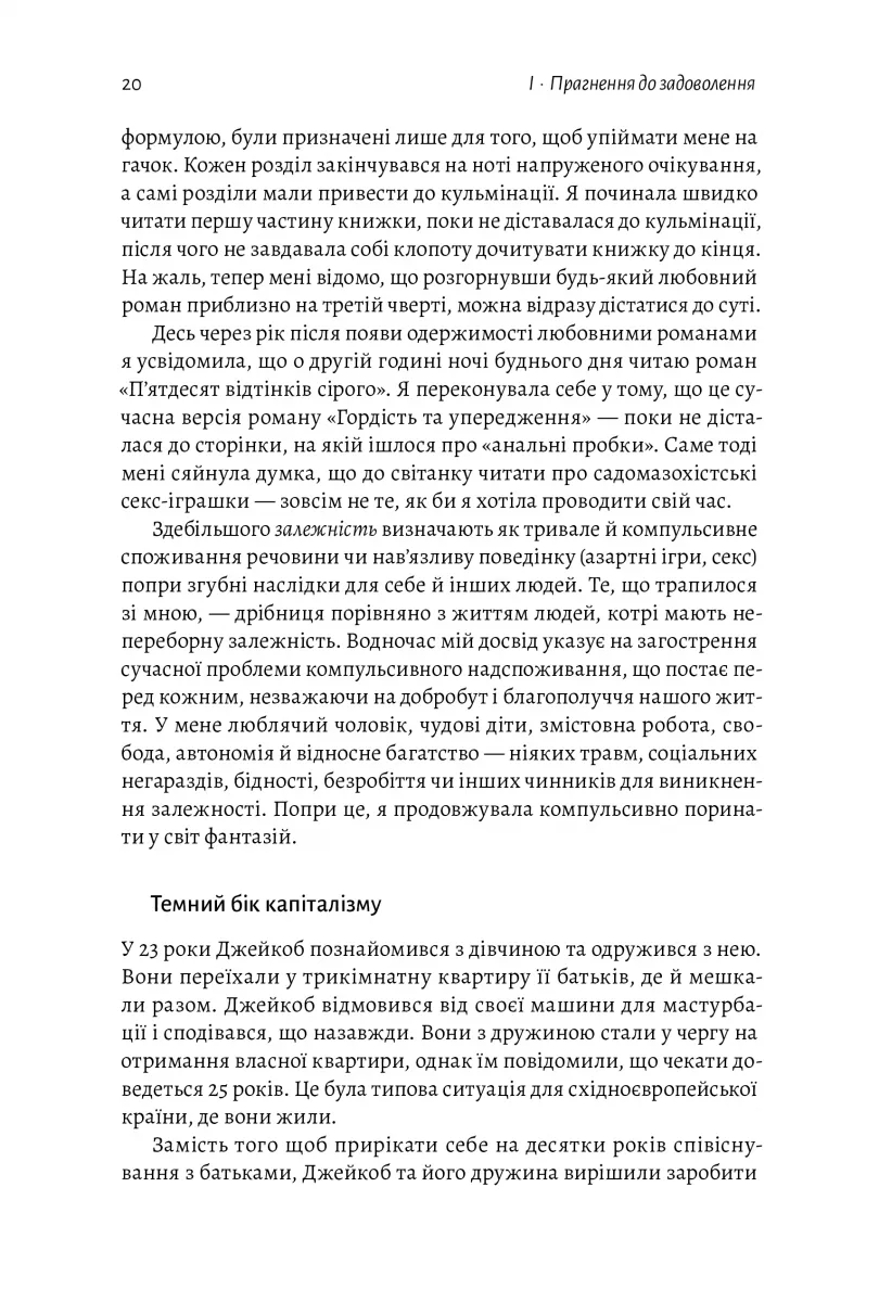 Книжка розповідає про залежності від вивільнення дофаміну: чому вони виникають, які вони бувають, який механізм їхньої дії та як їх позбутися. Авторка — на основі реальних випадків людей, які приходять до неї на терапію, та теоретичних знань — обґрунтовує, чому сучасним людям так просто стати залежними від чогось. Основна ідея, яку пропагує книжка, — збільшення рівня дофаміну внаслідок звички, яка приносять надзвичайне задоволення, є просто втечею від болю. Тому одна з її порад — не боятися болю, звикнути, змінити своє ставлення до нього, а не впадати у вир насолод. Однак сучасній людині це зробити важче: ми всі залежні, хто від ігор на телефоні, хто від сексу, хто від наркотиків, а хто — від ліків, які мали б допомагати нам і без яких неможливе адекватне функціонування.