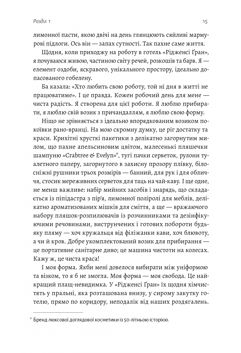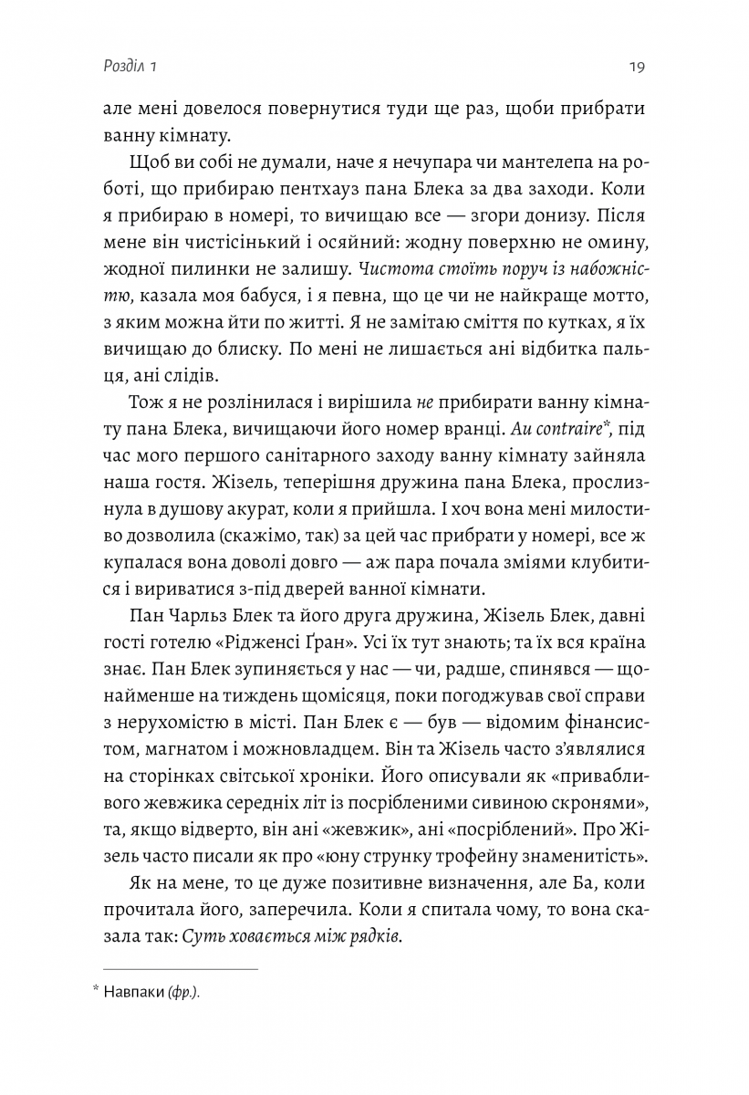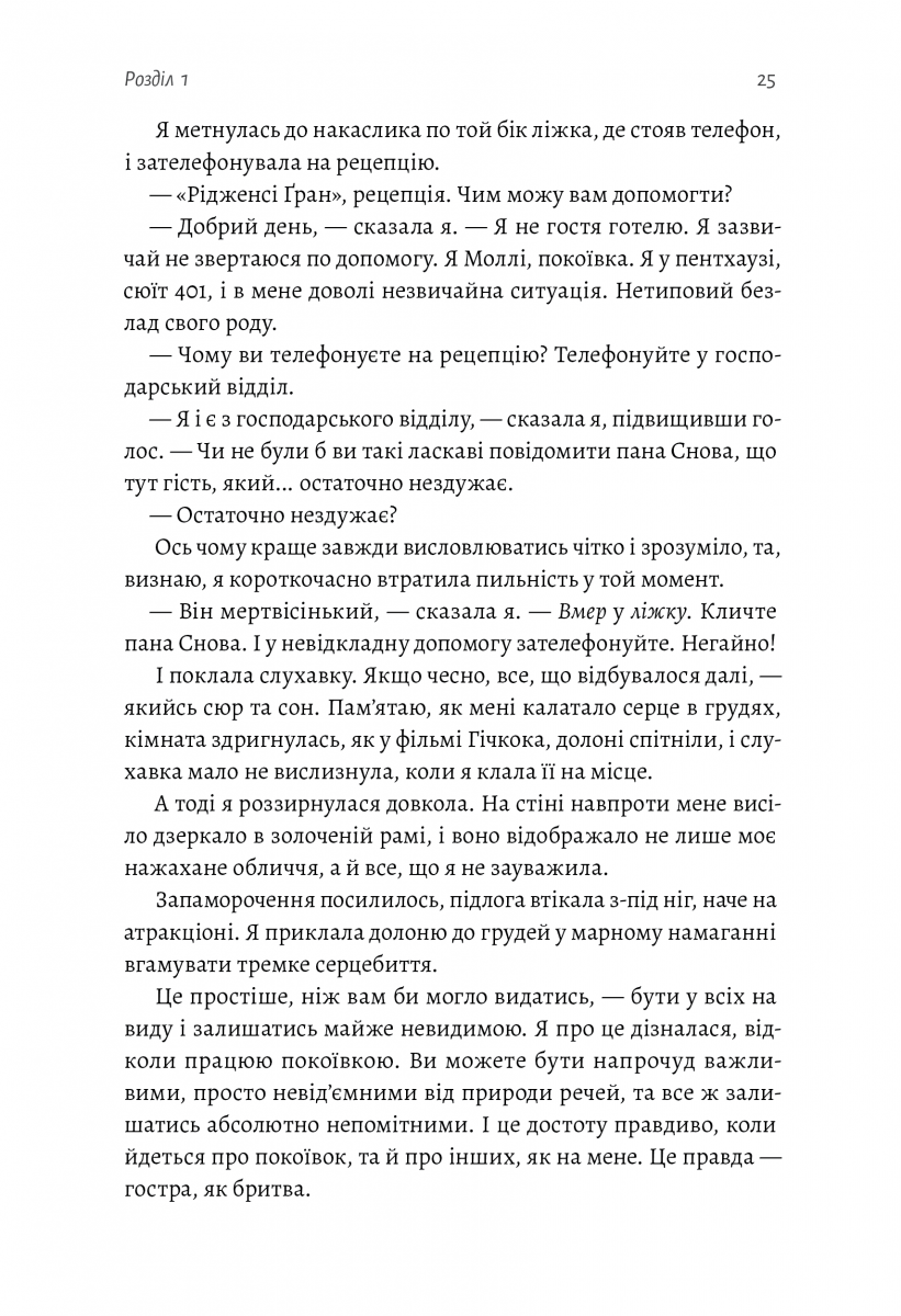 «Покоївка» — це роман, який крім захопливого детективного сюжету, пропонує поглянути глибше на життя людей, які не вписуються у соціальні стандарти. Чи вдасться усім нарешті побачити цю дивну невидиму покоївку? Чи зможе Моллі віднайти правду і довести свою невинність?
