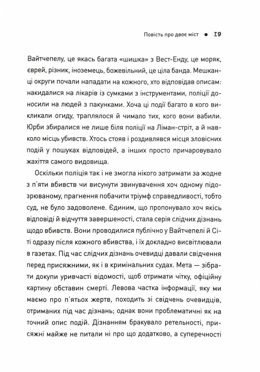 Поллі, Енні, Елізабет, Кетрін і Мері Джейн — п’ять імен, які загубилися в газетних хроніках та поліційних звітах 1888 року, затьмарені легендарним образом їхнього вбивці. П’ять непростих життів з однаковим кінцем. П’ять канонічних жертв Джека-Різника. У своєму ґрунтовному дослідженні в жанрі true crime Геллі Рубенголд повертає цим безмовним привидам голоси і розвінчує загальновідомий міф про те, що Різник полював лише на повій. Раніше не опубліковані або маловідомі факти, спогади очевидців, історичні замальовки, художні описи допомогли авторці відтворити портрети й трагічні долі п’ятьох жінок, яким випало жити в безжальних, похмурих умовах наприкінці ХІХ століття.