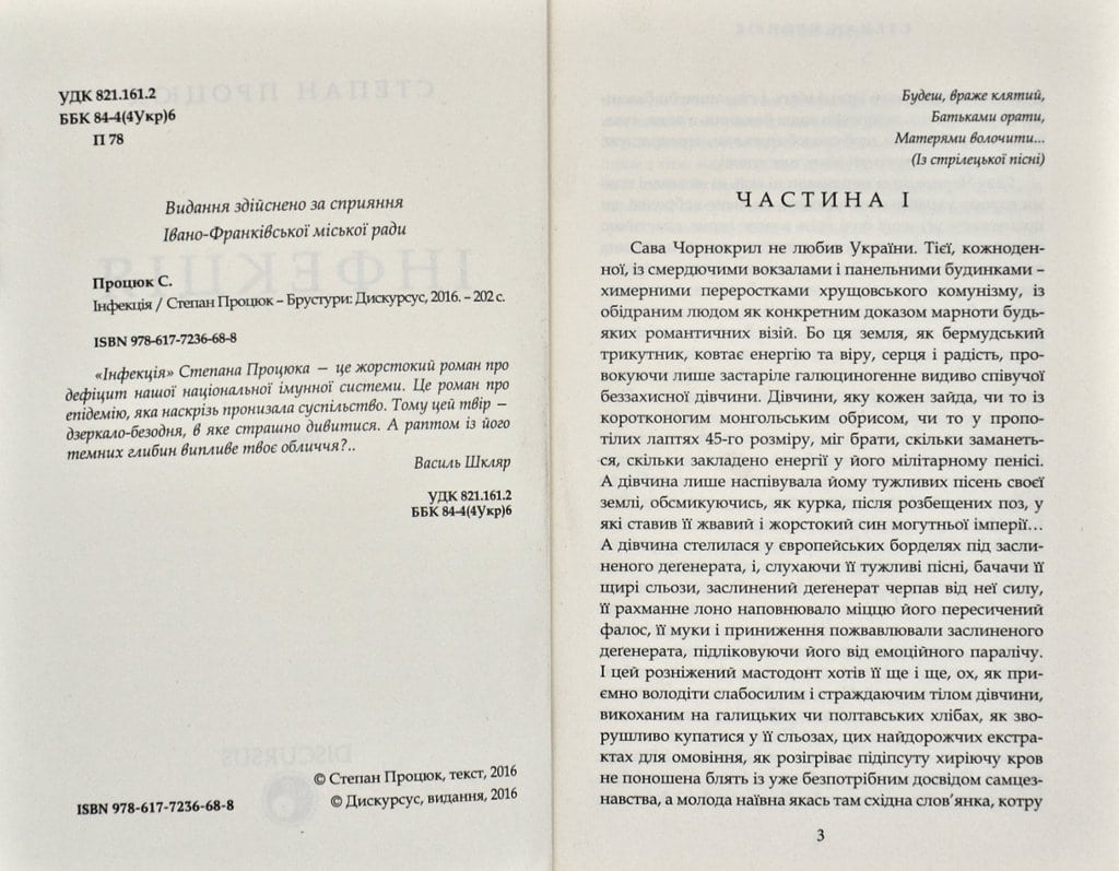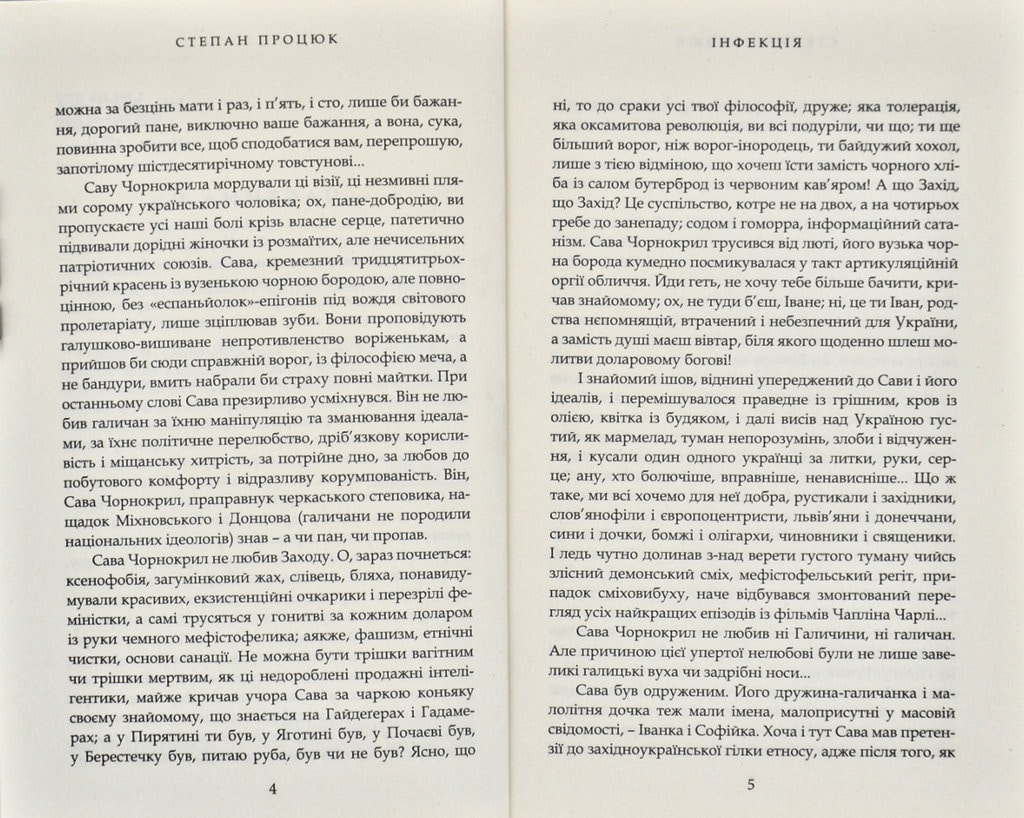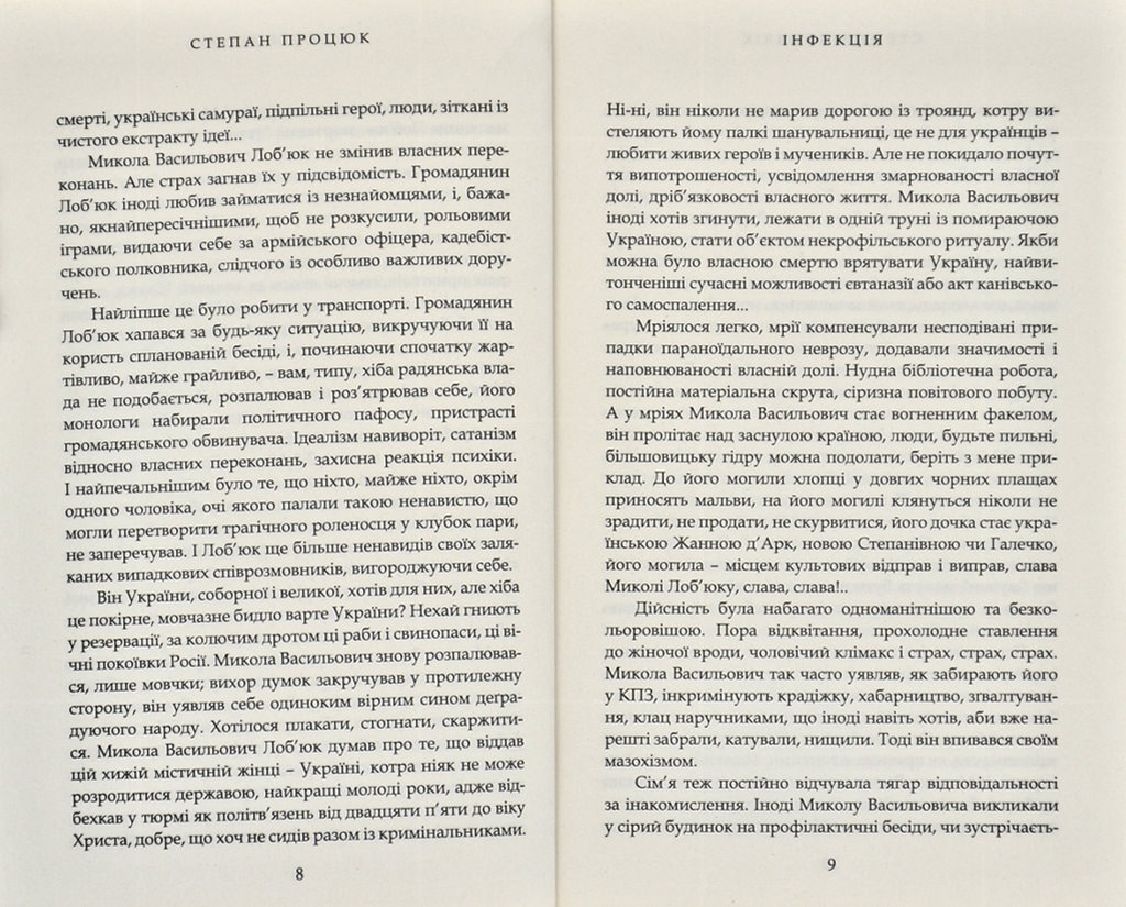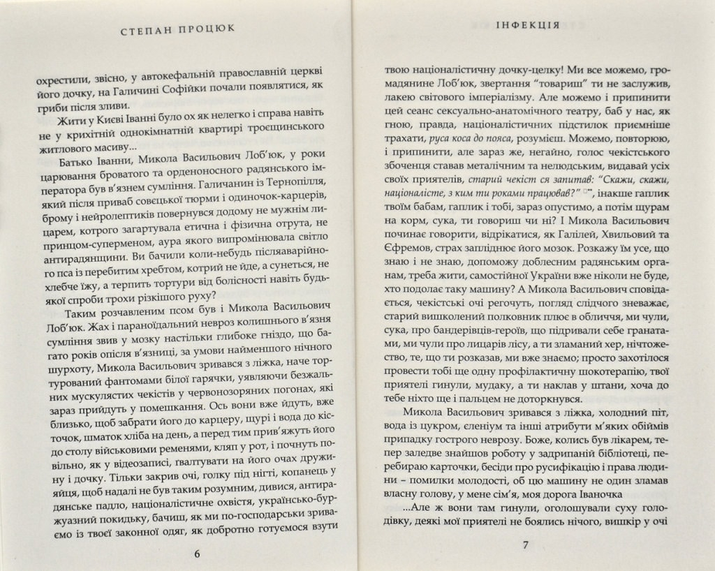 У центрі уваги творчості Степана Процюка загалом і роману "Інфекція" зокрема – людина з філософією так званого ущербного націоналізму, перемелена системою і обставинами життя.