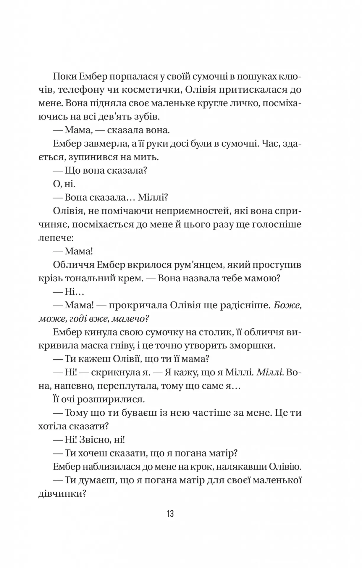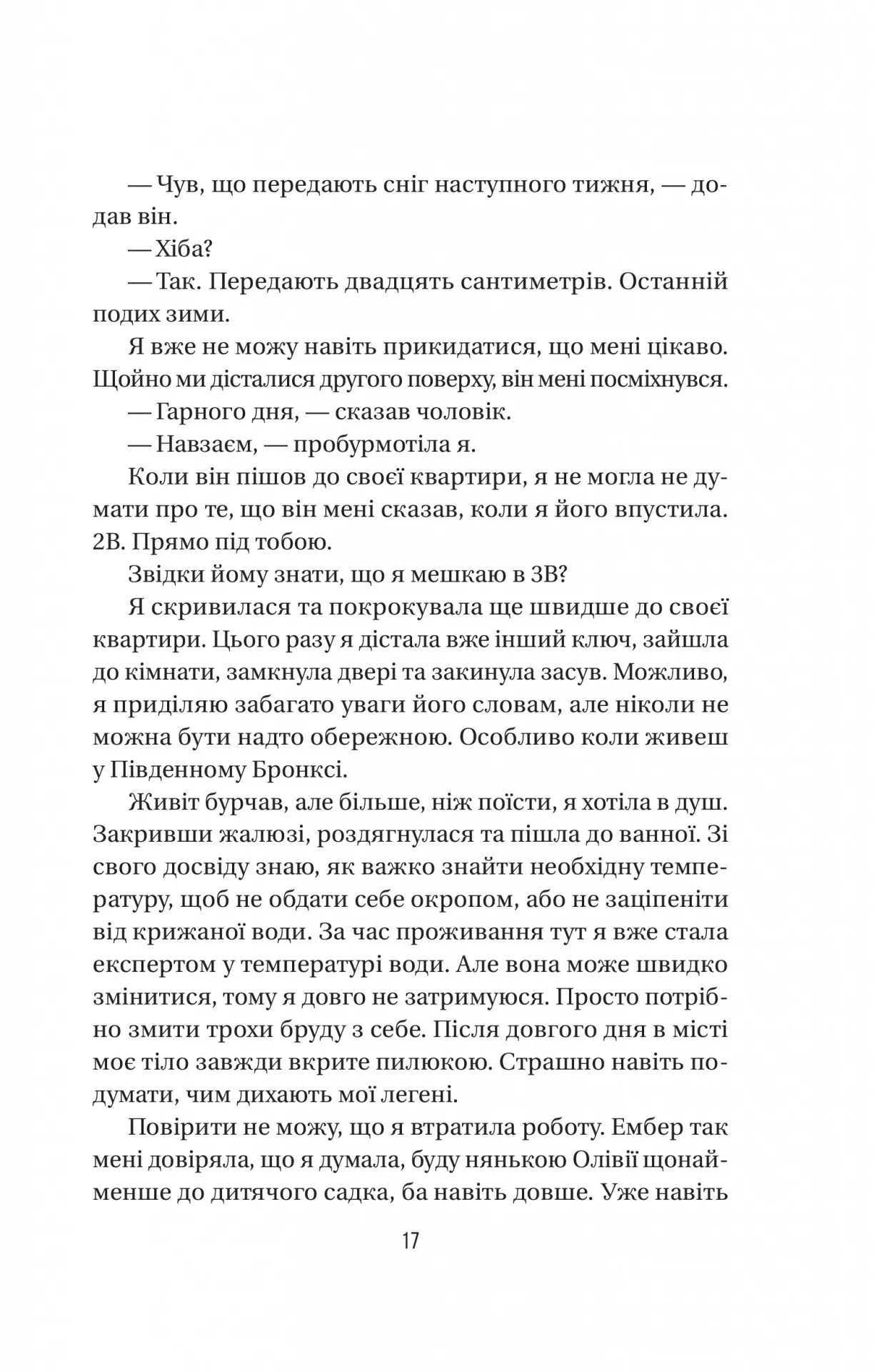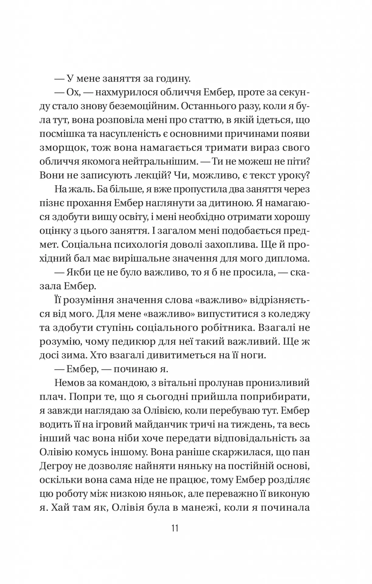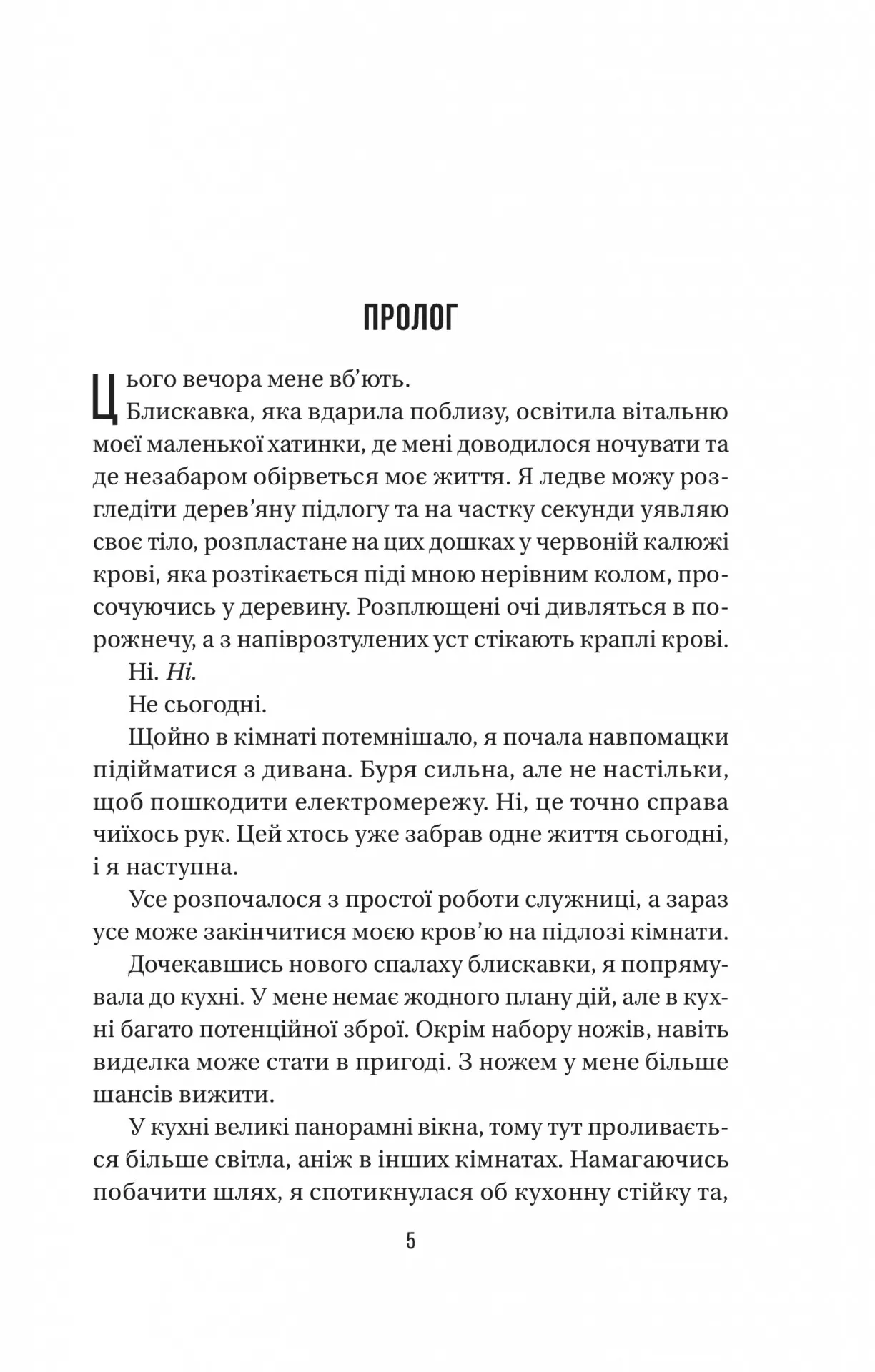 У цьому домі лише одне правило. Тримайтесь якомога далі від зачинених дверей… Міллі Келловей намагається знайти роботу. Це непросто. Адже наївно сподіватися, що прискіпливий роботодавець не поцікавиться минулим дівчини. Проте казкова вдача таки на боці Міллі. Нині вона — служниця у неймовірному пентхаусі багатіїв Дугласа та Венді Гарріків. Прибирання коштовних інтер’єрів та готування вишуканих страв майже не обтяжує. А господар не висуває зайвих умов. Крім однієї. Не турбувати місис Гаррік… Щось у цьому домі не так. Чому господиня не виходить зі спальні? Чому звідти долинає плач? Що це за кров?.. Запитань більше, ніж відповідей. Це штовхає Міллі до дії, спонукає допомогти…