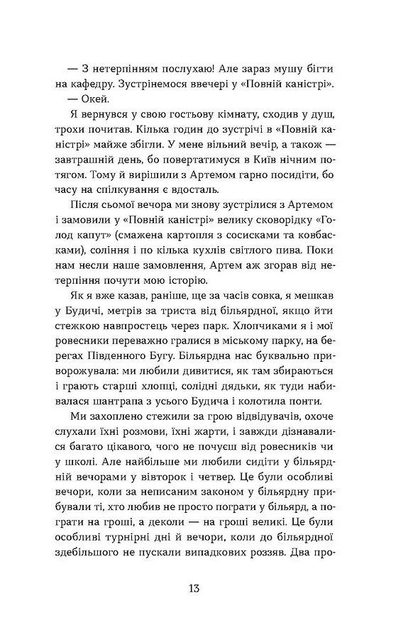 Новели й оповідання, які ввійшли до книжки «Перший кий Будича», продовжують розповідати історії Будича, їх часопростір триває із середини 1980-х до наших днів. Тут є бандитська більярдна та її відвідувачі кінця 1980-х, провінційні журналісти і школярі, дивакувата інтелігенція, пенсіонери-відлюдники…