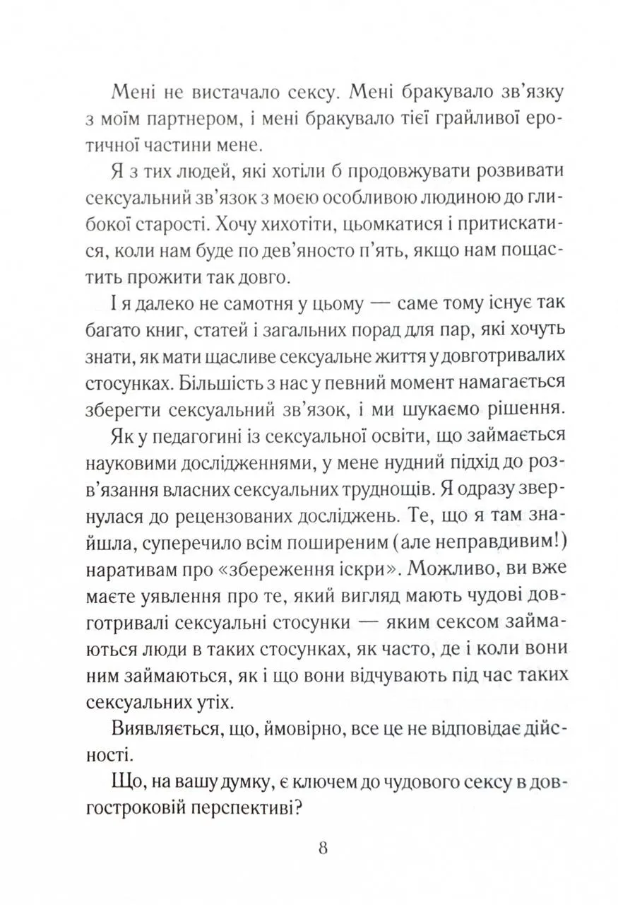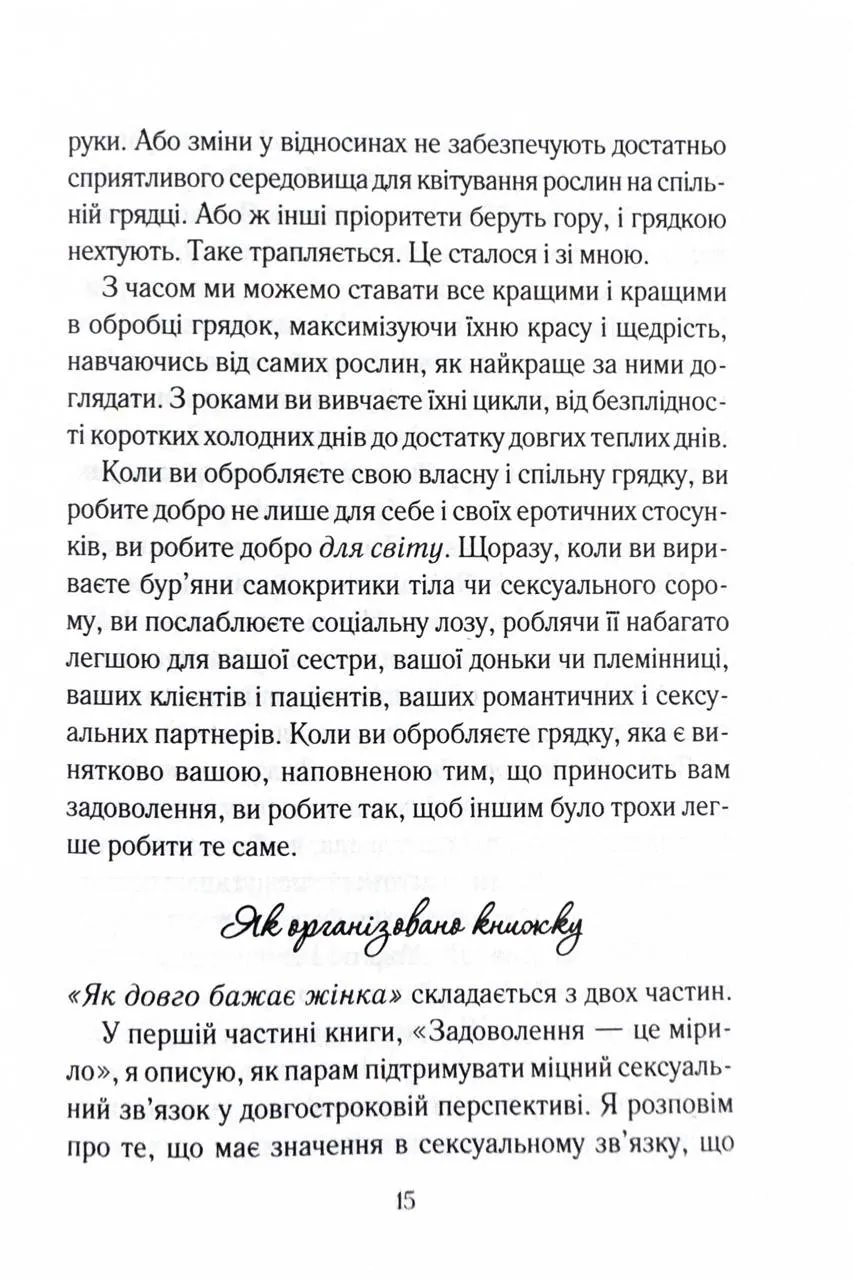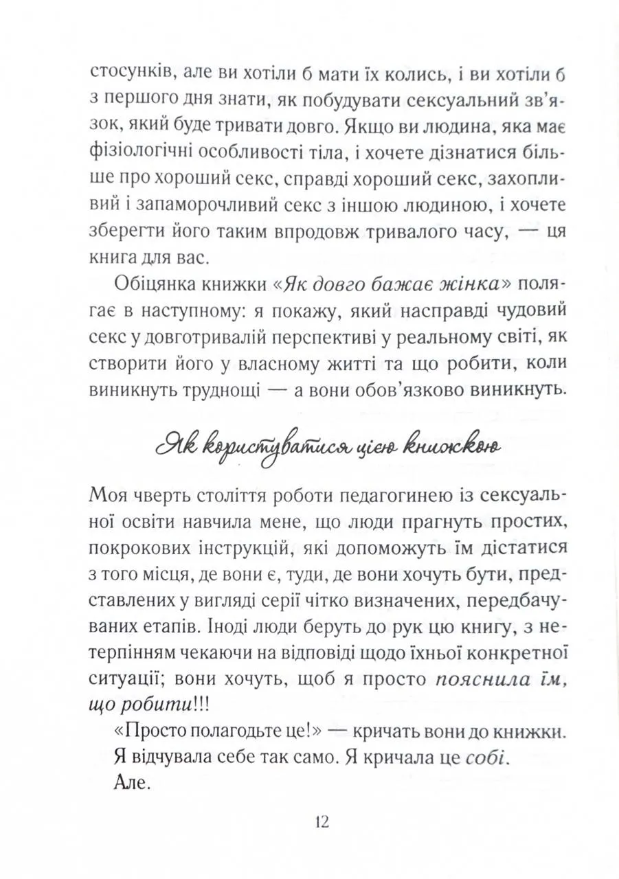«Як довго бажає жінка» - це всеохопна, доброзичлива та обнадійлива книжка. Кожна пара, яка має тривалі стосунки, знайде щось корисне для себе. Існує твердження, що у тривалих стосунках складно підтримувати щасливе інтимне життя. Мовляв, бажання та задоволення є найвищими на початку стосунків і неминуче знижуються з роками. Та невже подружжя або пари, які давно зустрічаються, із часом приречені на незадовільний секс? Емілі Наґоскі розвіює міфи про сексуальне життя з постійними партнерами та дає дієві поради, як отримувати задоволення від фізичної близькості тим, хто вже давно знає свою другу половинку.