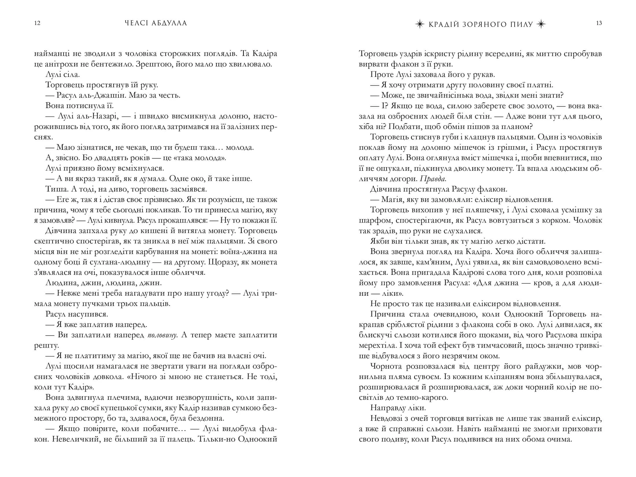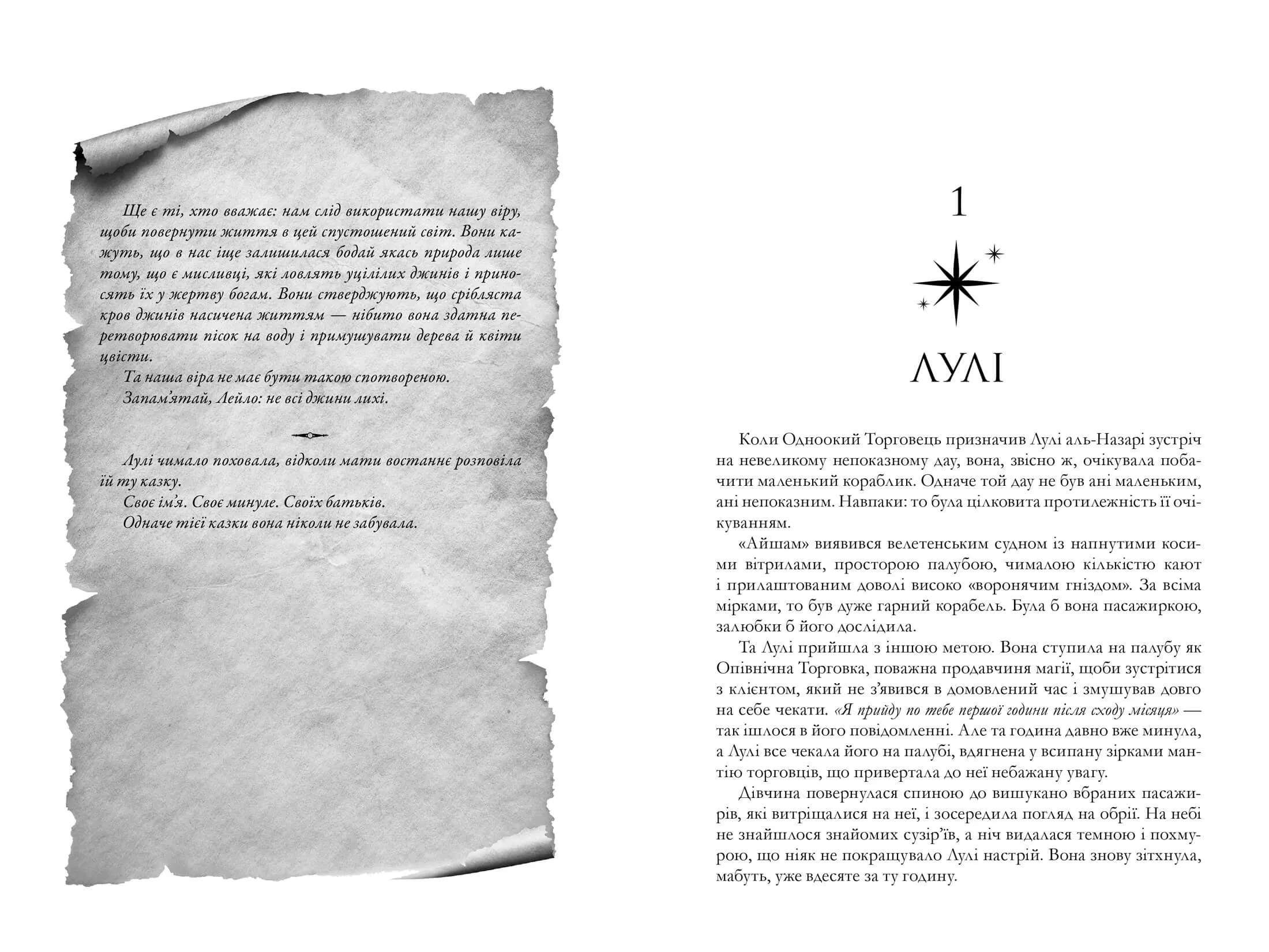 Ані тут, ані там, але давно-давно… Цей світ належав джинам. Лулі аль-Назарі — Опівнічна Торговка, злочинниця, яка з допомогою свого охоронця-джина вистежує і продає заборонену магію. Одного дня вона врятувала життя боягузливому принцу, а відтак привернула увагу його могутнього батька, султана, який шантажем змушує її знайти древню лампу, наділену могутньою силою. Змушена скоритися, щоб уникнути смерті, Лулі вирушає в мандри зі старшим султановим сином та його розбійницею — однією зі сумнозвісних сорока. Їм доведеться битися з гулями, перехитрити мстиву королеву джинів і зіткнутися з лихим убивцею, що переслідує Лулі в кошмарних спогадах.