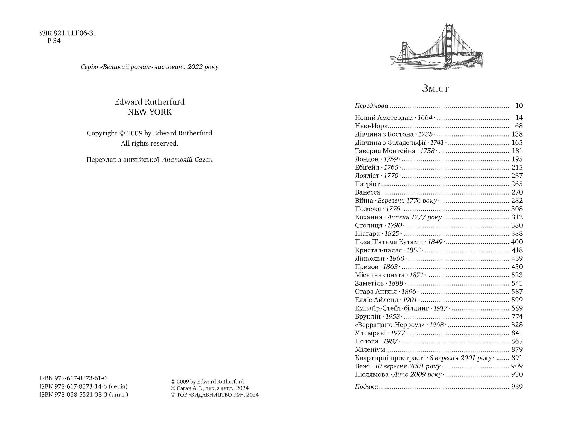 • Бестселер The New York Times • Лауреат премії Девіда Дж. Ланґама-старшого у категорії американська історична проза та номінант Goodreads Choice Award в категорії історична проза (2013) Майстер історичних романів-бестселерів створює грандіозну, масштабну драму Нью-Йорка від заснування міста до сьогодення. Як і у своїх попередніх романах-бестселерах, Едвард Резерфорд висвітлює культурні, соціальні та політичні зрушення через життя різних за походженням і достатком родин. Розповідаючи про переплетення доль персонажів, багатих і бідних, афроамериканців і білих, тубільців та іммігрантів, Резерфорд оживляє важливі події, які сформували Нью-Йорк та Америку: війну за незалежність, становлення міста як великого торговельного й фінансового центру, ексцеси позолоченого віку, вибух імміграції наприкінці XIX та на початку XX століття, випробування Другої світової війни, майже крах Нью-Йорка в 1970-х і його бурхливе відродження в 1990-х, атаки на Всесвітній торговий центр… Усюди вкраплені захопливі епізодичні ролі видатних діячів від Джорджа Вашингтона та Авраама Лінкольна до Бейба Рута.