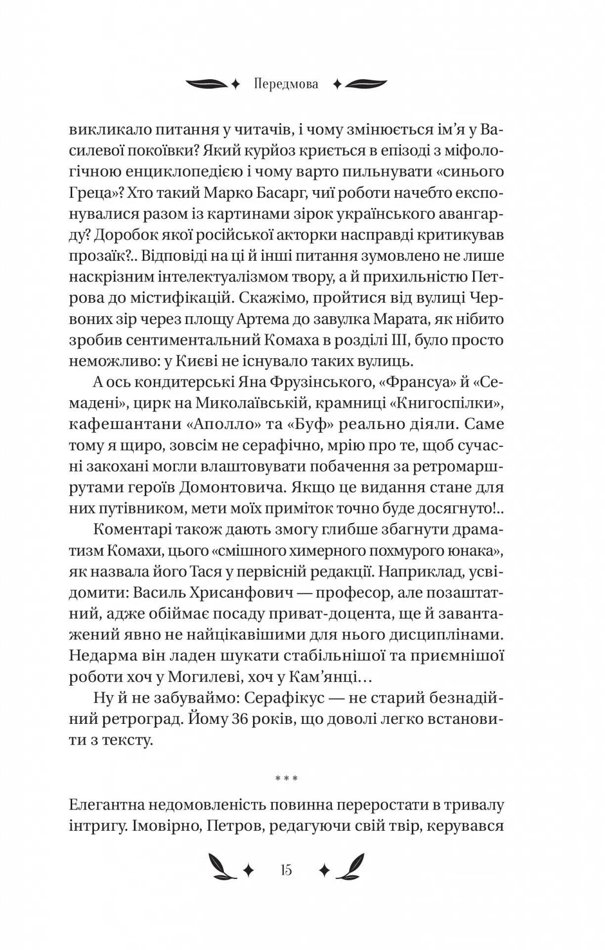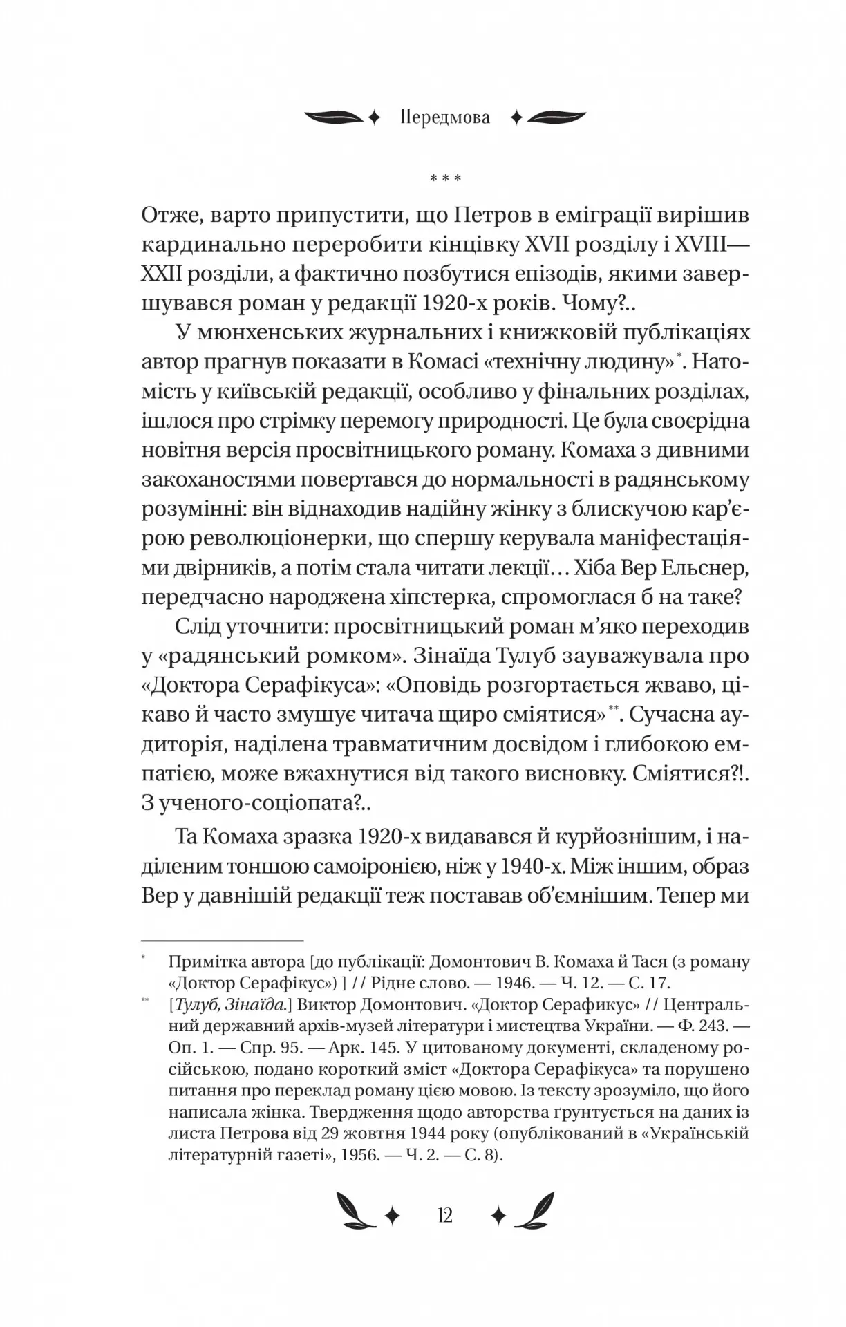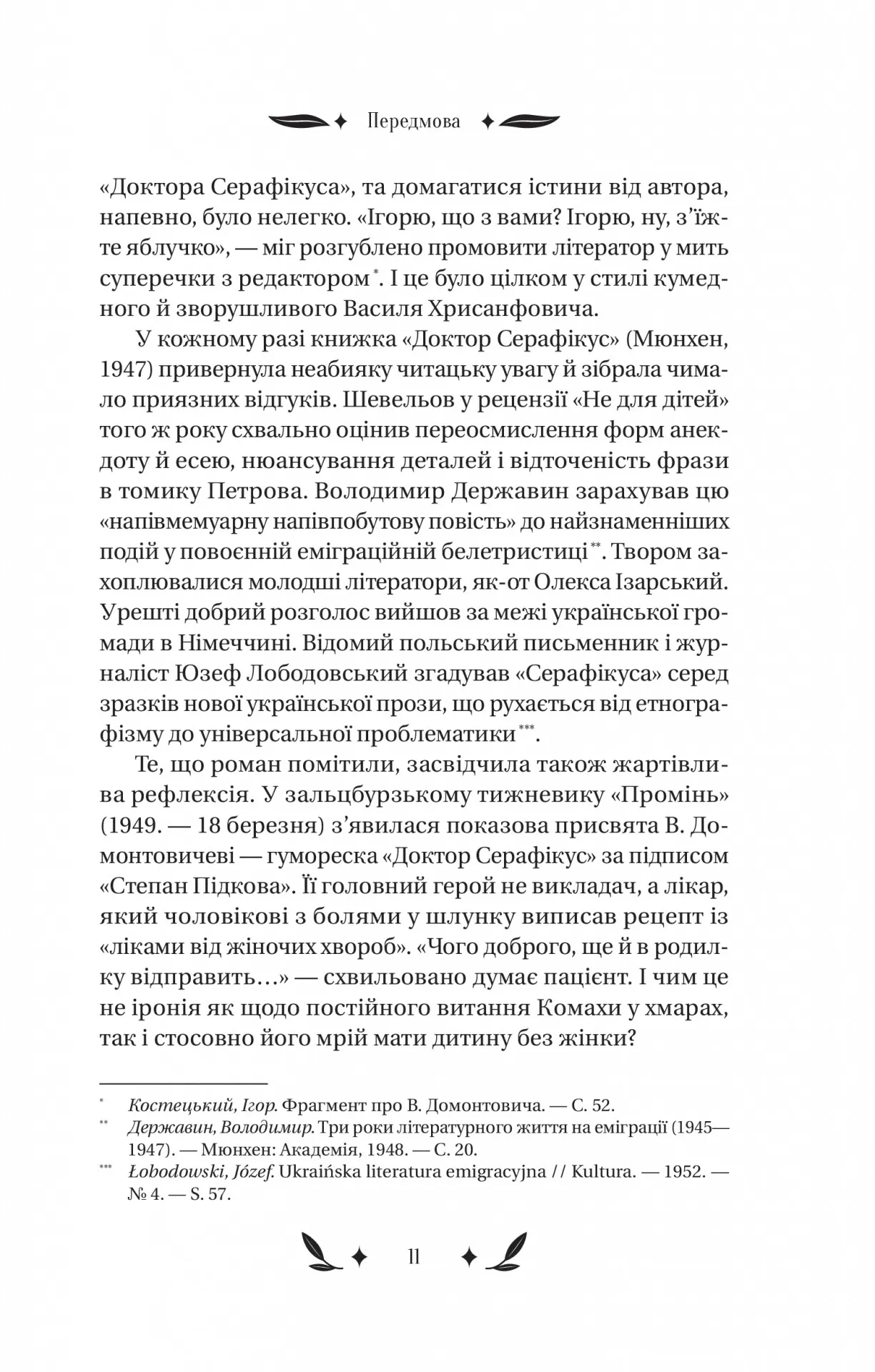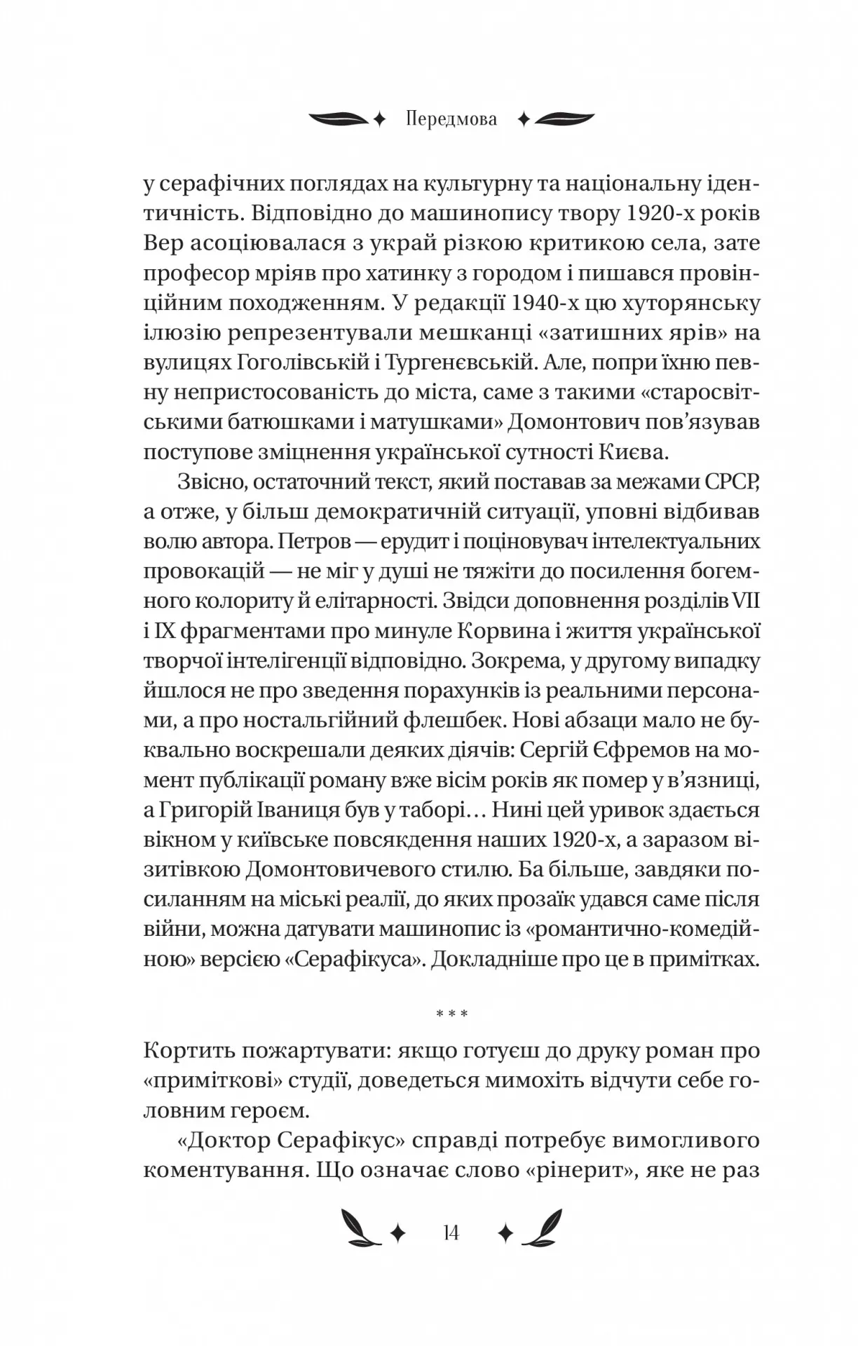 Серце професора — це енциклопедія пристрастей, прихованих за списками літератури й примітками. У «Докторі Серафікусі» воно пульсує в унісон із вибуховими хвилями історії. Воно поривається до аудиторій і бібліотек, але не може уникнути парків і модних кав’ярень, затишних ярів і диких завулків. Чи важко натрапити на хіпстерку у 1920-х роках? Що простіше — закохатися в таку дівчину чи в місто? Як залишатися українськими інтелектуалами після навали «хороших росіян»?.. Відповіді знають В. Домонтович і його химерні, зате переконливі персонажі. Один із найзагадковіших українських романів уперше друкується з розділами й фрагментами, які дивом уціліли в архіві.