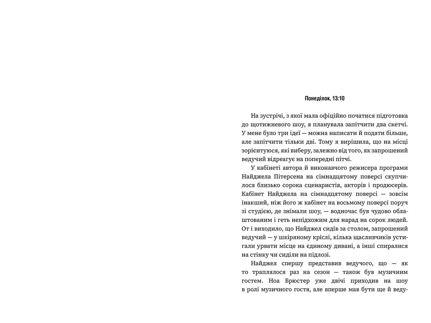 • Бестселер The New York Times • Вибір книжкового клубу Різ Візерспун • Роман року за версією The Washington Post, NPR, USA Today, BuzzFeed, PopSugar, Harper’s Bazaar, Real Simple, She Reads, New York Post Комедійна сценаристка думає, що велике кохання їй не судилося, але чарівний попспівак діє всупереч її припущенням! Саллі Мілз — сценаристка «Нічних сов», вечірнього комедійного шоу, яке щосуботи виходить у прямому ефірі. Маючи за плечима не один досвід нещасливих стосунків, вона давно припинила шукати кохання — натомість для задоволення в житті вибрала випадкові зв’язки, кар’єрний успіх і хороші стосунки з вітчимом. І ось до шоу в ролі ведучого й музичного гостя на тиждень приєднується Ноа Брюстер, зірковий попспівак, про якого кажуть, що він любить зустрічатися з моделями. Саллі починає захоплюватися чарівливим чоловіком, а в процесі роботи над скетчами в неї з’являються думки, чи не пробігла між ними іскра. Але це ж не романтична комедія, а реальне життя. А в реальному житті такий чоловік, як він, нізащо б не зустрічався з такою жінкою, як вона... правда ж?