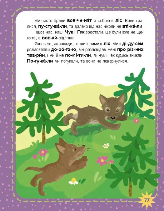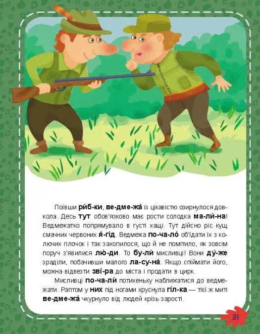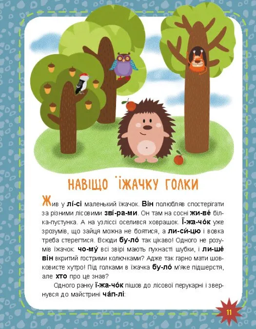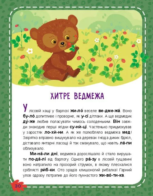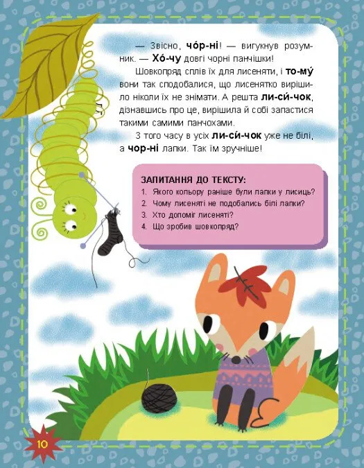 Книжка містить слова, виділені шрифтом і поділені на склади, до того ж у них проставлені наголоси. Ці слова призначені для читання малюками. Книжки включають оповідання різного ступеня складності. Вирішуйте самі, який рівень у змозі подолати ваша дитина. Наприкінці кожної оповідки подано кілька запитань, що дає можливість перевірити, наскільки добре зрозумів малюк історію, які висновки він зробив.