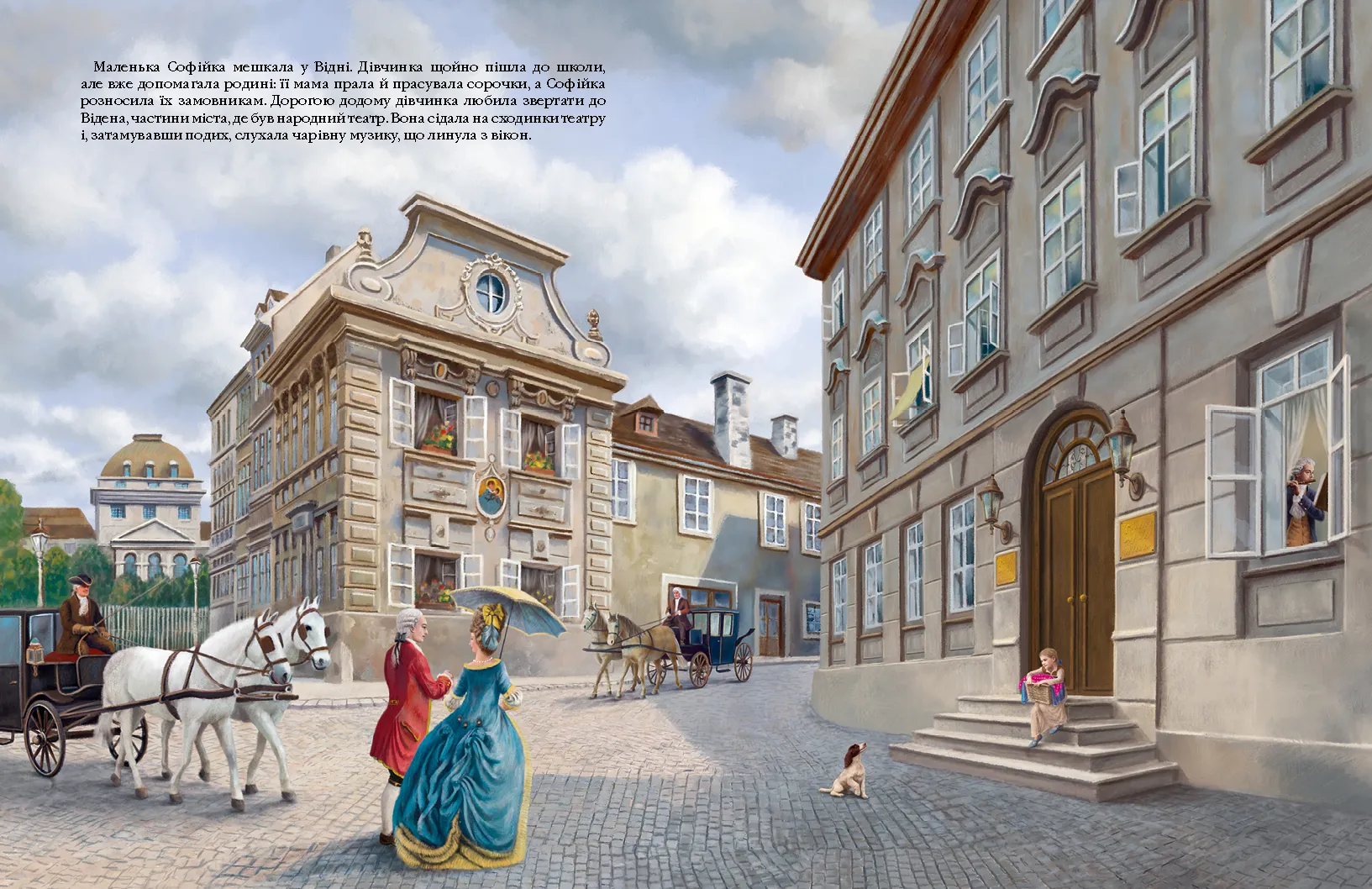 Маленька Софійка щойно пішла до школи у Відні, і вже допомагає своїй мамі — розносить замовникам попрані й випрасувані сорочки. Дорогою вона мало не щодня зупиняється біля театру, щоб послухати музику, яка ллється з вікон... Щасливим випадком дівчинка знайомиться з Моцартом і потрапляє на прем‘єру найчарівнішої і найзагадковішої його опери «Чарівна флейта»... А далі — чи не вперше в історії дитячої книжки — коротко, доступно і з неймовірно барвистими ілюстраціями — подається сюжет самої опери.