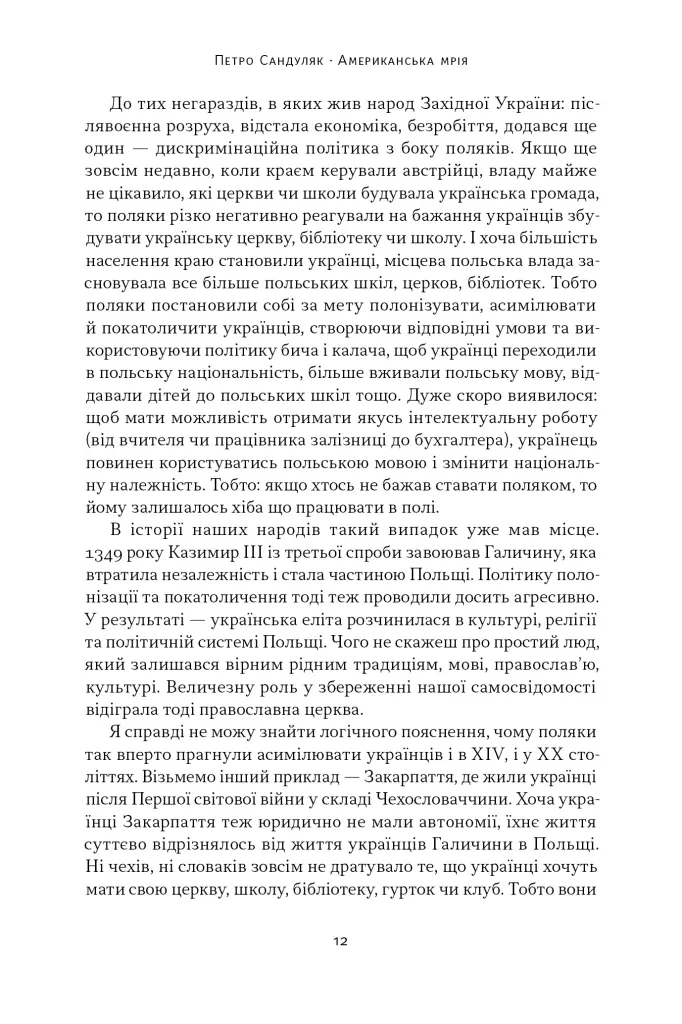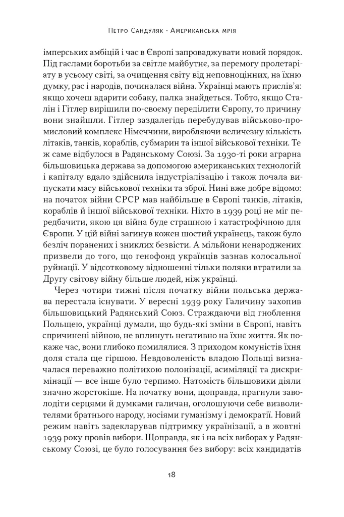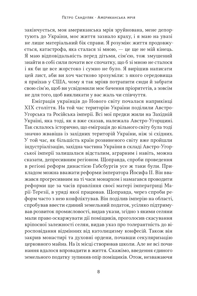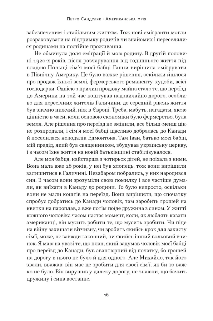 Український іммігрант без знання англійської прибуває у США, де починає зі звичайного озеленювача і нічного прибиральника. Уже за півтора року він засновує власний бізнес, а ще за кілька років стає власником компанії з мільйонним обігом, у якій працює понад двісті людей. Утім, це не історія з хрестоматійним хепіендом: благословенна Америка, що надала герою можливість досягти захмарних вершин, в одну мить спустила його на грішну землю. Але зрештою зробила сильнішим. Із цієї книжки читач отримає багато інсайтів про життя і роботу в США. На досвіді своєї сім’ї автор показує красу Нового світу, радість від перемог і звершень на шляху до здійснення «американської мрії». І водночас — переосмислює її крихкість, жорстокість та підводні камені. Книжка Петра Сандуляка — це корисний путівник з іммігрантського життя та реалій бізнесу в іншій країні, чесна розповідь про «обітовану» для тисяч українців землю.