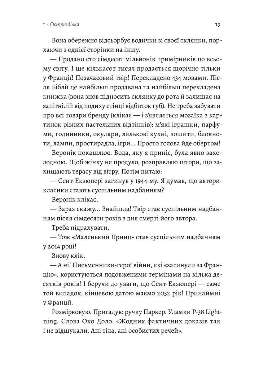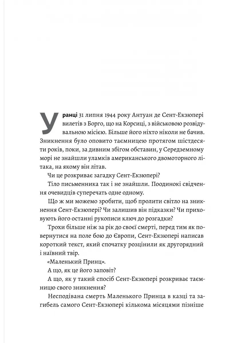 Автор висуває низку ідей, які стосуються смерті Екзюпері, заснованих на реальних подіях, місцях і текстах. Захопливе читання, побудоване за всіма законами трилера, адже Мішель Бюссі веде нас у пошуках вбивці Маленького Принца, а також його автора Антуана де Сент-Екзюпері.