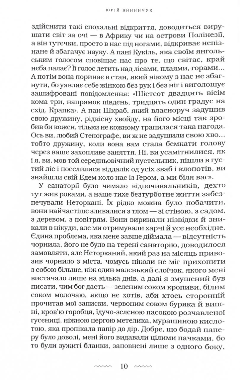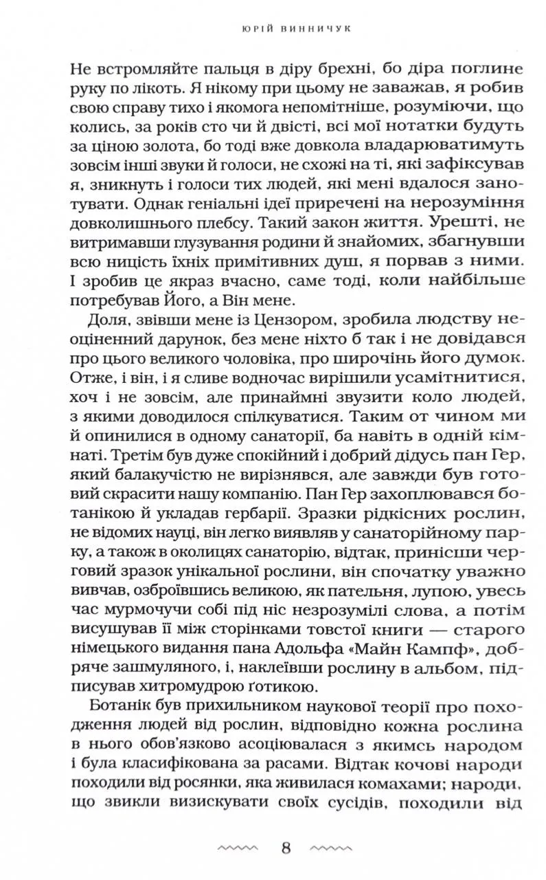 І знову Юрій Винничук вибудовує перед читачем захопливий сюжет, у якому герої, поринаючи в лабіринти пам’яті, лише в несподіваному фіналі розкриваються повною мірою. Вони озираються на своє життя, яке припало на добу тоталітарних режимів, і звіряються у різних способах виживання — від цинічного до шляхетного. Водночас така карколомна мандрівка в минуле приносить багато несподіванок.