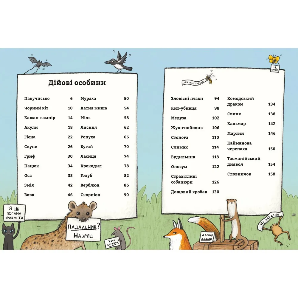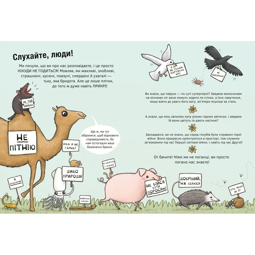Ця книга створена для того, щоб розвіяти ці фальшиві міфи раз і назавжди! Смішними ілюстраціями та цікавими фактами вона допоможе дітям розкрити правду про цих тварин і дізнатися все про те, яку важливу роль відіграє у світі кожна істота. Це видання — приємне та кумедне знайомство з понад 30 тваринами, великими та малими, які насправді зовсім не такі вже й погані!