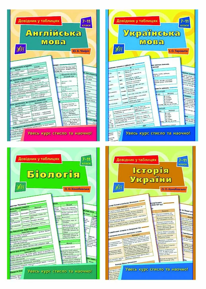 Довідник у таблицях 7-11 класи. Комплект із 4 шт: Українська мова, Англійська мова, Біологія, Історія України