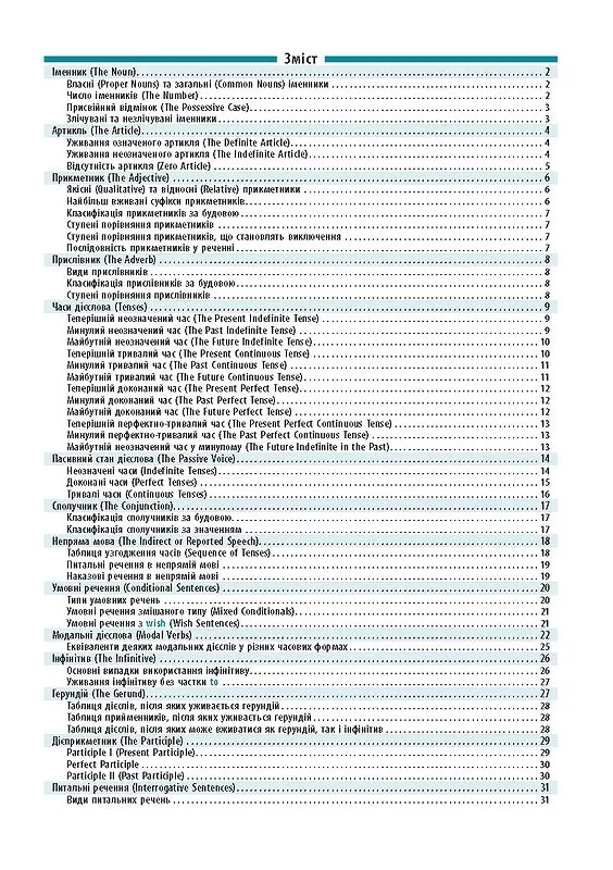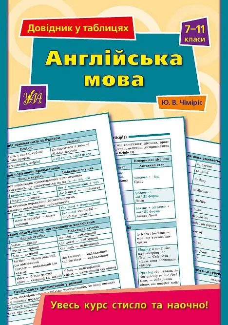 Довідник з англійської мови допоможе учням 7-11 класів покращити свої знання та підготуватися до самостійних чи контрольних робіт, а також незалежного оцінювання. Інформація подана стисло та чітко у вигляді таблиць, що спрощує пошук потрібної інформації — правил граматики, визначень чи схем побудови граматичних конструкцій. Працювати з довідником зручно та швидко!