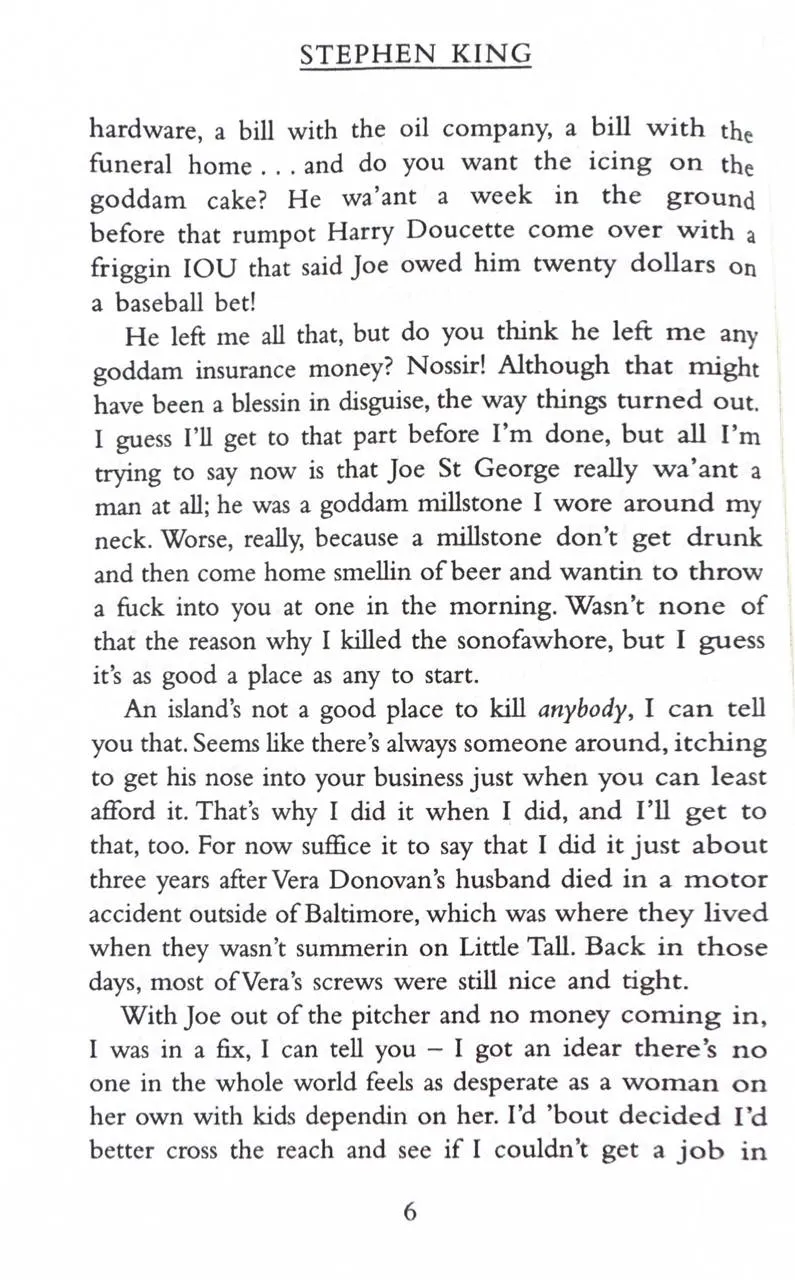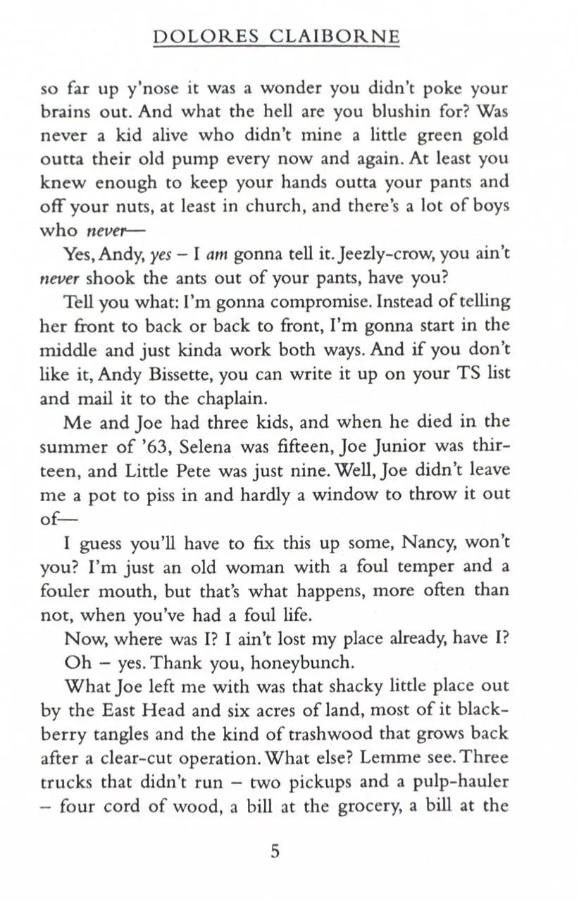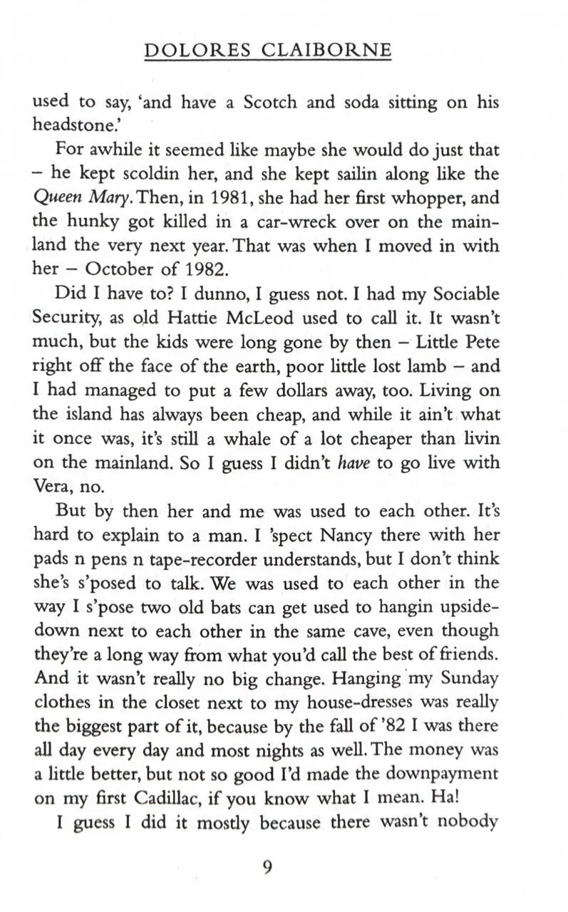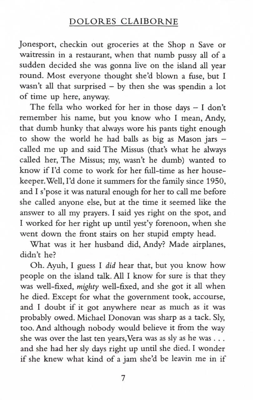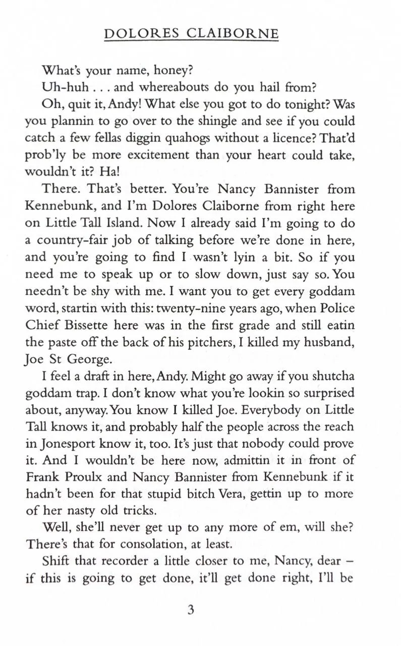 When Vera Donovan is found dead at the bottom of the stairs, the police want to question her housekeeper Dolores Claiborne. And Dolores does have a confession to make. But it's not what the police are expecting to hear as they listen to her life story - a story which hearkens back to her abusive marriage and the suspicious death of her husband in the small Maine community of Little Tall Island. Dolores Claiborne has a story to tell. And you'd better pay attention or else.