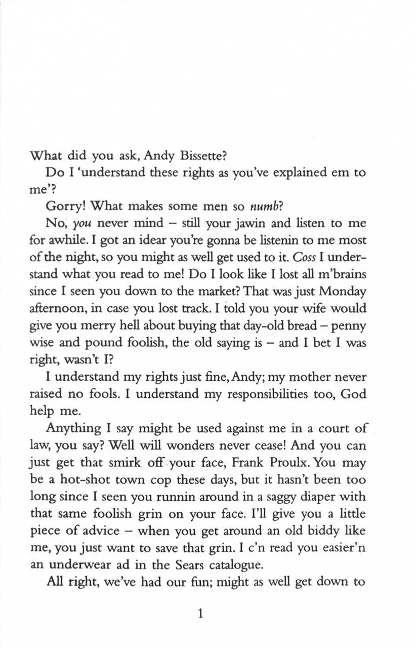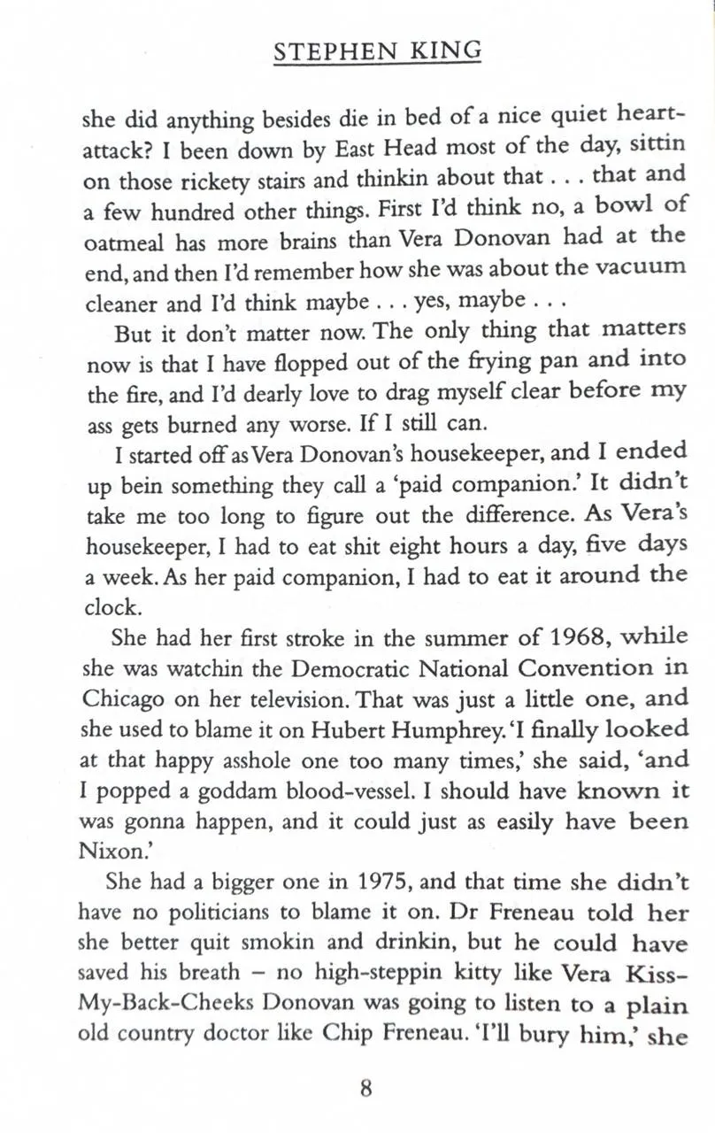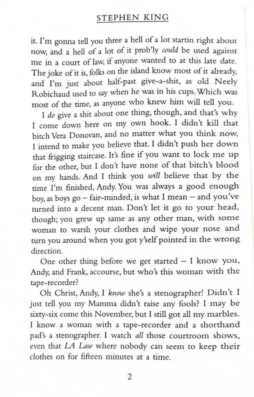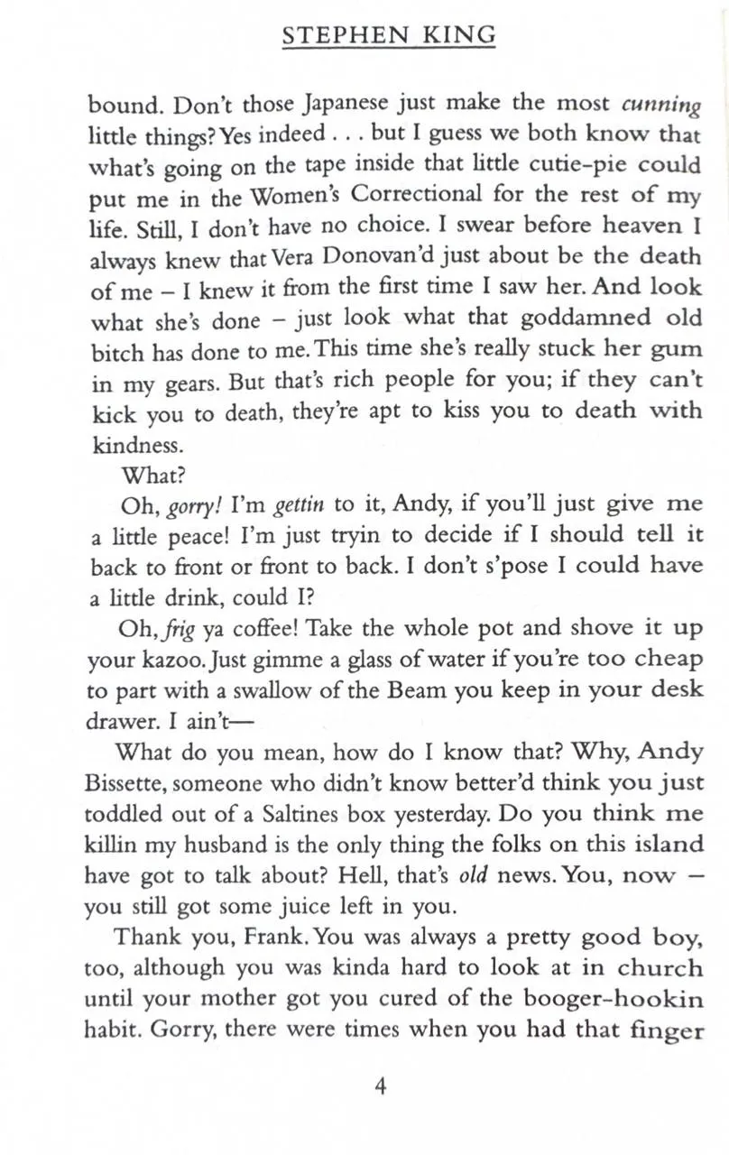 When Vera Donovan is found dead at the bottom of the stairs, the police want to question her housekeeper Dolores Claiborne. And Dolores does have a confession to make. But it's not what the police are expecting to hear as they listen to her life story - a story which hearkens back to her abusive marriage and the suspicious death of her husband in the small Maine community of Little Tall Island. Dolores Claiborne has a story to tell. And you'd better pay attention or else.