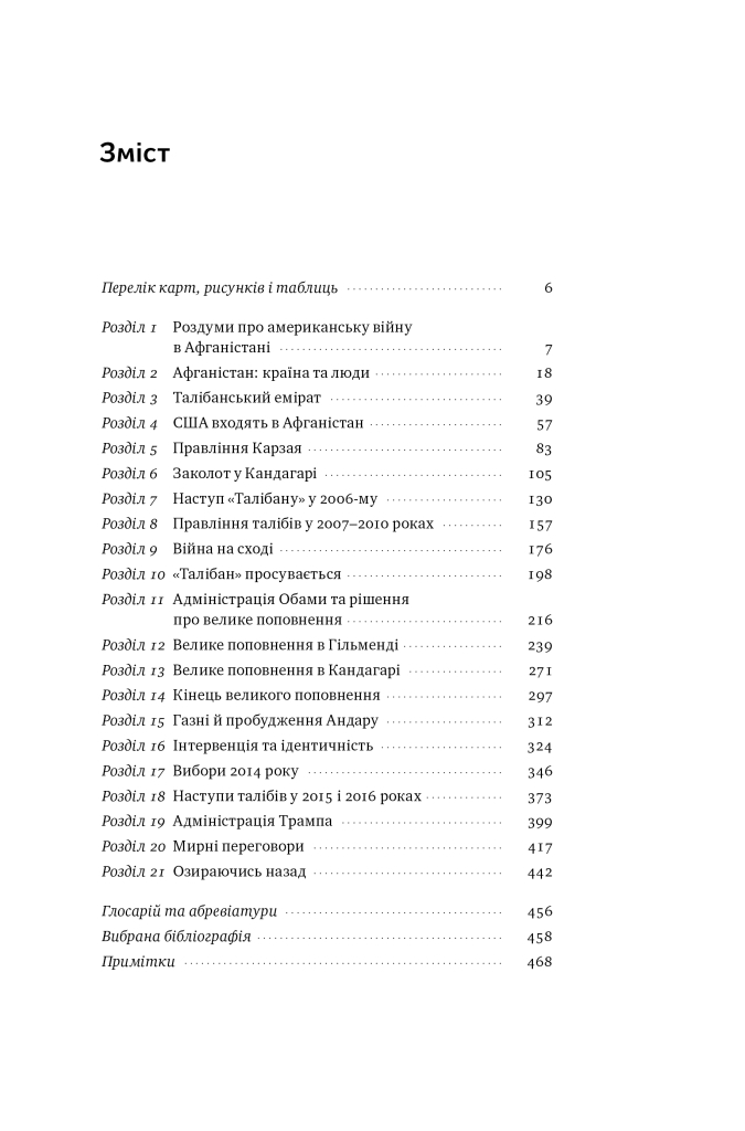 Спираючись на власний досвід, глибокі знання і багатий масив першоджерел, автор проходить через кілька етапів війни: вторгнення 2001 року; відродження талібів у 2006 році; «велике поповнення» епохи Обами; перезавантаження стратегії після 2011 року, наслідки ліквідації лідера «Аль-Каїди» Усами бен Ладена та вплив на війну «Ісламської Держави»; трагічна кульмінація поразки США після виходу з Афганістану у 2021 році та швидкого повернення «Талібану» до влади в країні.