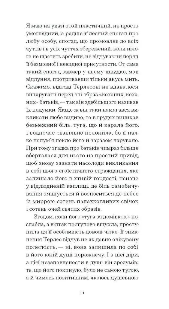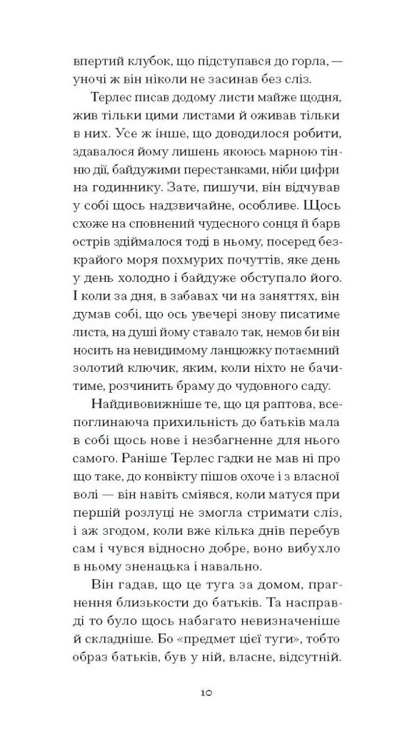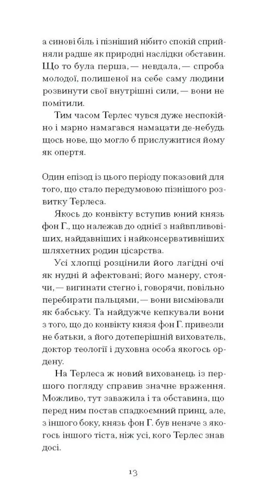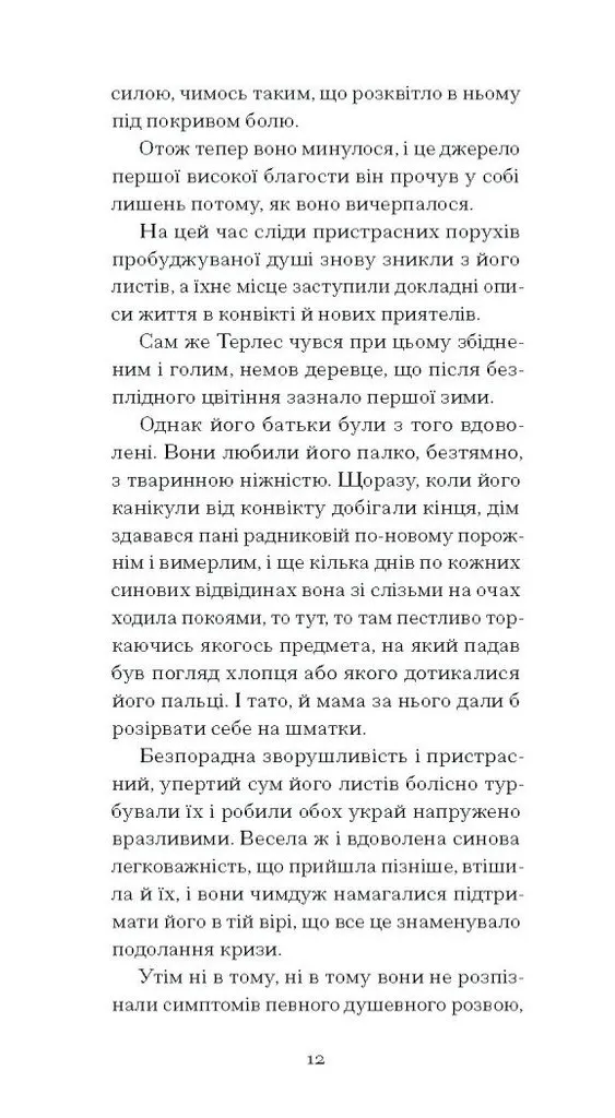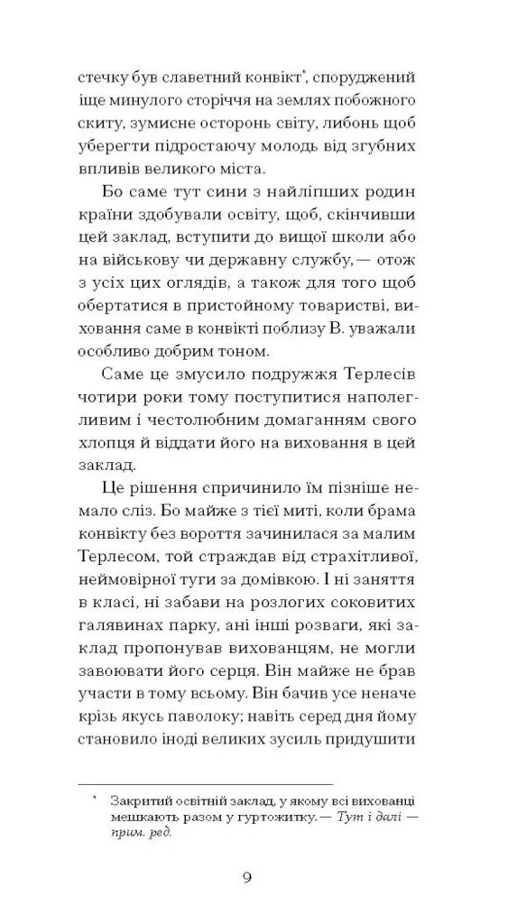 «Трапляється всяке — от і вся мудрість», — фраза, якою юний Терлес підсумовує болючий досвід пізнання себе і світу — тілесного, чуттєвого, химерного, жорстокого й імморального. Саме такого — який перебуває поза поділом на добро і зло, високе й нице, дозволене й заборонене. В освітньому закладі для хлопців життя рухається за певним порядком, і змінити його зовсім непросто. Одного вихованця ловлять на крадіжці, та замість відкрити це керівництву школи, однокласники самотужки беруться до перевиховання юного злодія. Ґвалтовно накидаються на нього, чинять наругу, принукують до прислужування, по-менторськи моралізують Та чи самі вони гідні бути світочами в напучуванні на добро, якщо заступають на ковзьке, випускаючи на привілля звірячу ницість, яка в них нуртує? Який бік обере юний Терлес? Чи заступиться за крадія, а чи під острахом загроженості його участю стане на бік «хибного правосуддя»? Чи випустить він на волю свою хтивість, чи піднесеться до світлого чуття справедливості? Хто ж відає, де пролягає межа між істинним і хибним у кожному з нас? І хіба не раз якийсь досвід ми підсумовували так: «Трапляється всяке — от і вся мудрість»? Австрієць Роберт Музіль створив цей експресіоністичний шедевр ще 1906 року, та заторкнуті теми — ці «вічні питання буття» — безсумнівно актуальні й нині.