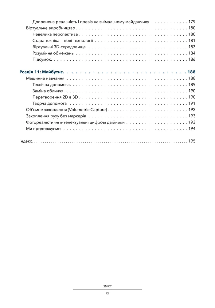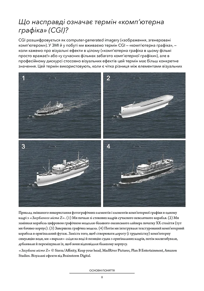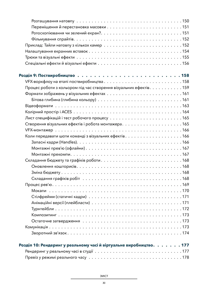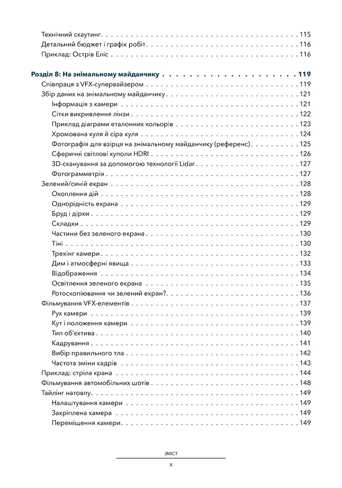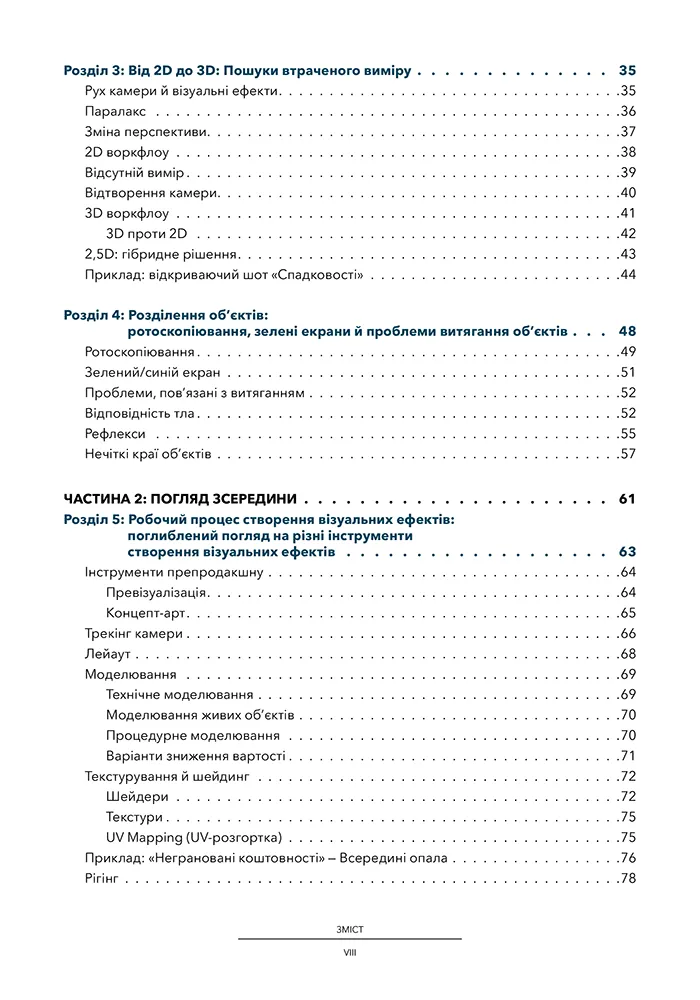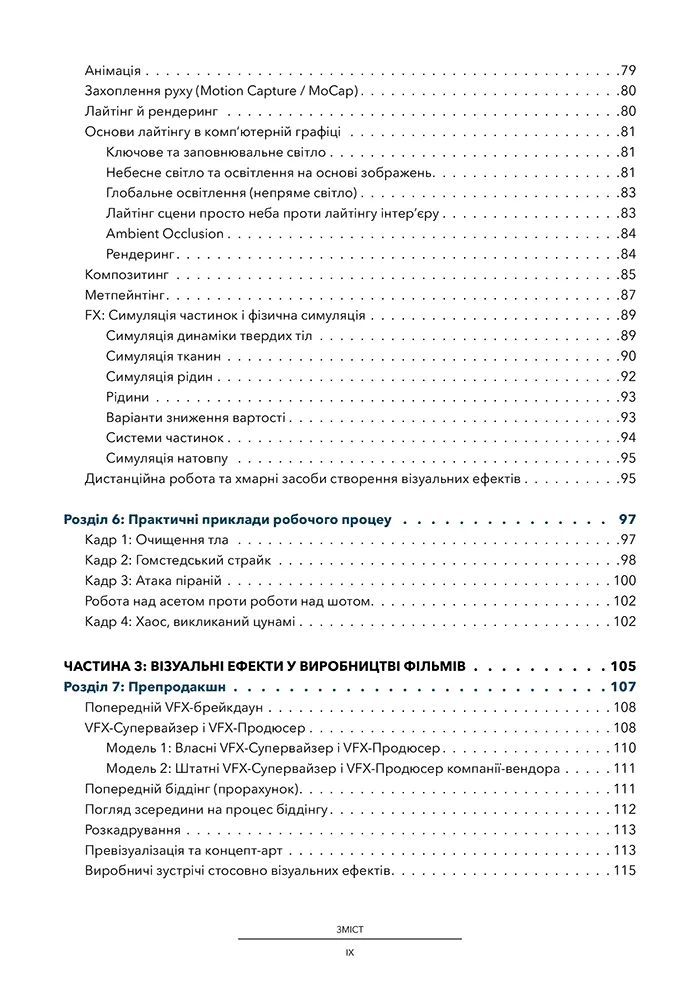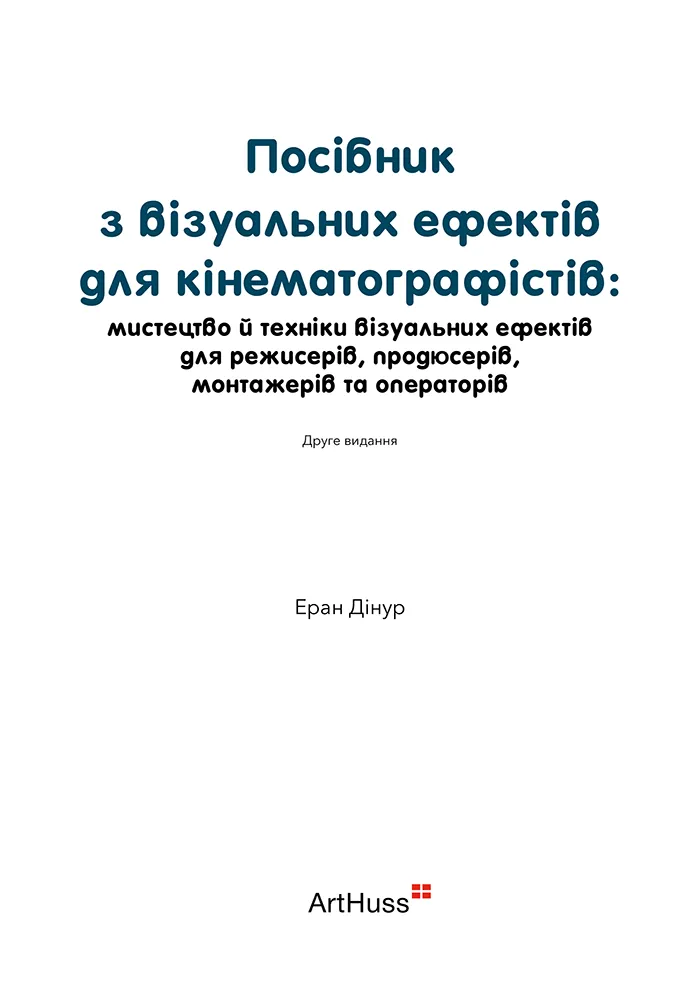 Посібник з візуальних ефектів для кінематографістів пропонує практичні детальні поради працівникам кіно й телебачення, які не спеціалізуються на візуальних ефектах. Для багатьох режисерів, продюсерів, режисерів монтажу та кінооператорів візуальні ефекти часто залишаються недостатньо зрозумілим аспектом медіавиробництва.У цій книжці Еран Дінур, визнаний спеціаліст у цій галузі, знайомить читачів із візуальними ефектами з погляду режисера. Він надає вичерпні настанови зі створення задуму, проєктування, складання бюджету, планування, фільмування й огляду візуальних ефектів від початкового й до завершального етапів виробництва. Книжка допоможе глибше зрозуміти робочі процеси 3D, 2D й 2,5D; різні інструменти створення візуальних ефектів від техніки матчмув до композитингу; такі важливі поняття, як фотореалізм, паралакс, ротоскопіювання й витягання об’єктів з кадру.