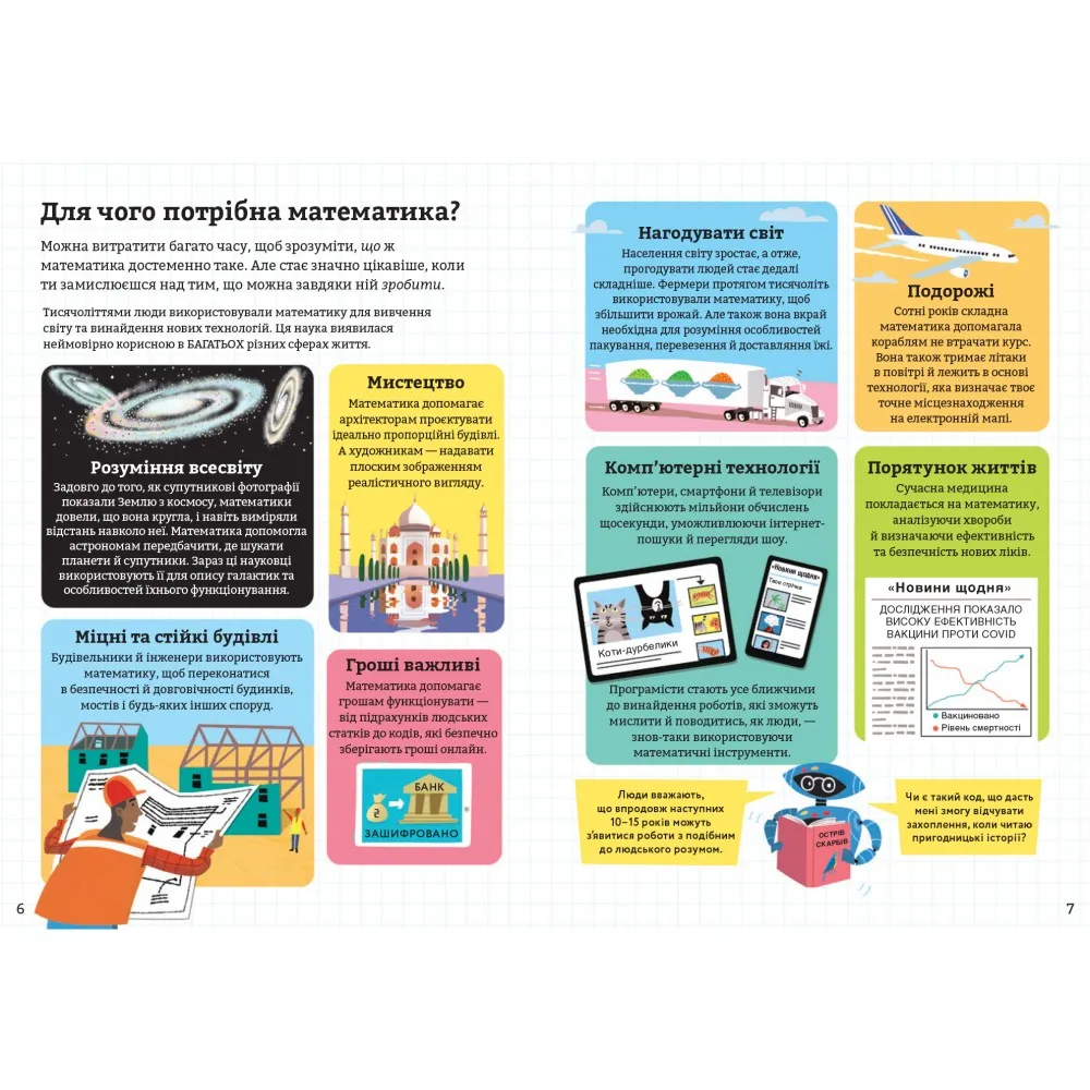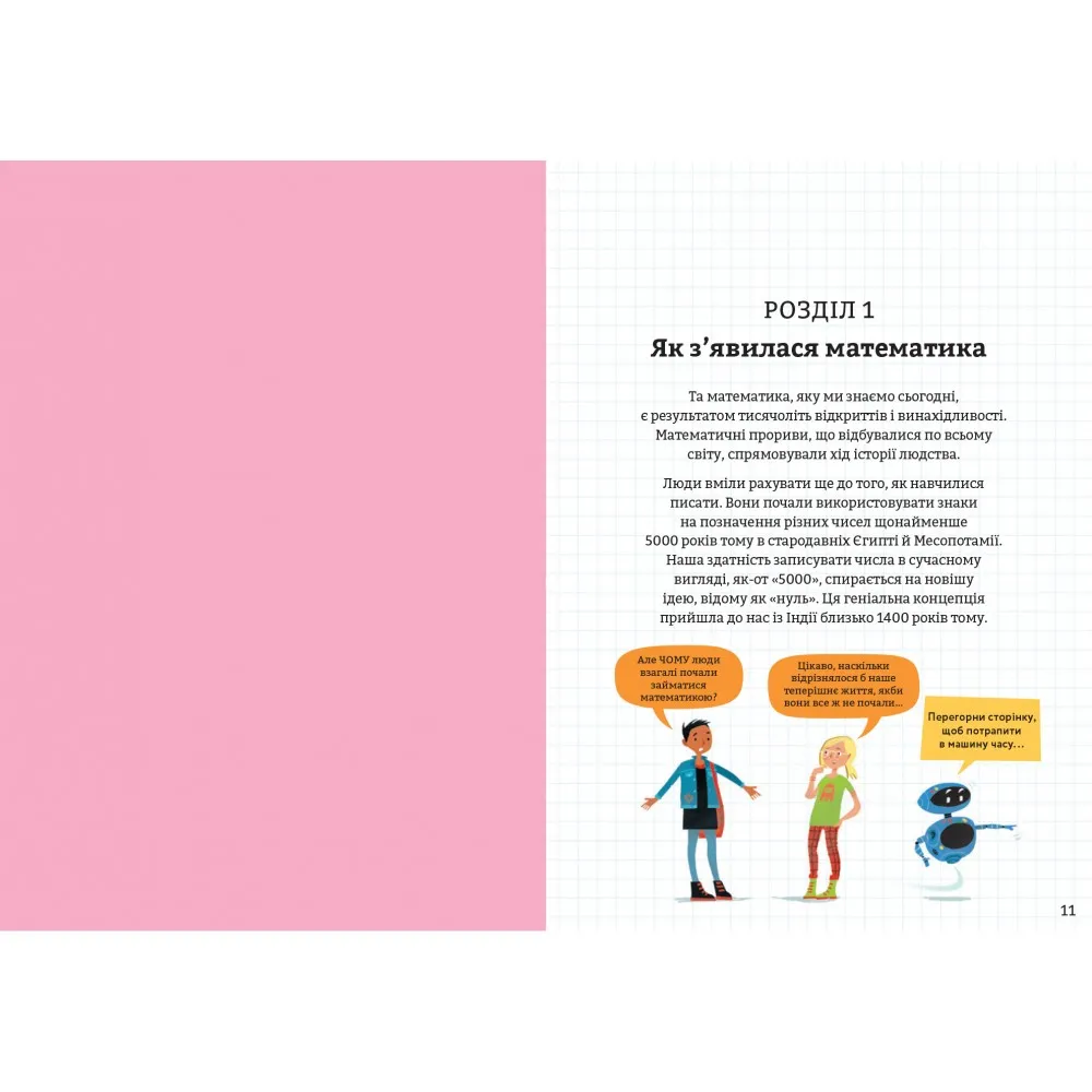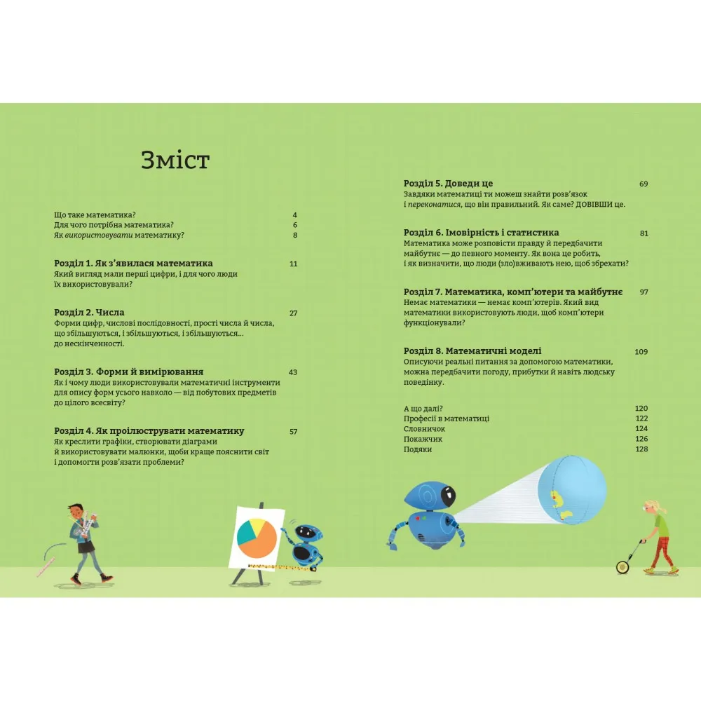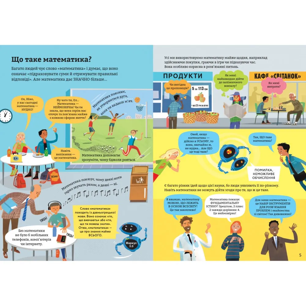 Книжка «Математика для початківців» стане в нагоді не лише дітям, а й дорослим, адже вона у зрозумілій формі розповість все, що потрібно знати про математику. У книзі автори досліджують та пояснюють, як математичні інструменти допомагають людям зрозуміти навколишній світ, передбачити майбутнє і навіть те, як математика робить життя кращим.Окрім пояснень та цікавих діалогів, у книжці є окремий словник із найпоширенішими визначеннями.Чи може математика зробити людей багатшими? Чи можна за допомогою формул передбачити, які спортивні команди виграють більше ігор? Чи можуть рівняння пояснити таємниці Всесвіту? Відповіді на всі ці та багато інших запитань шукайте у книжці.