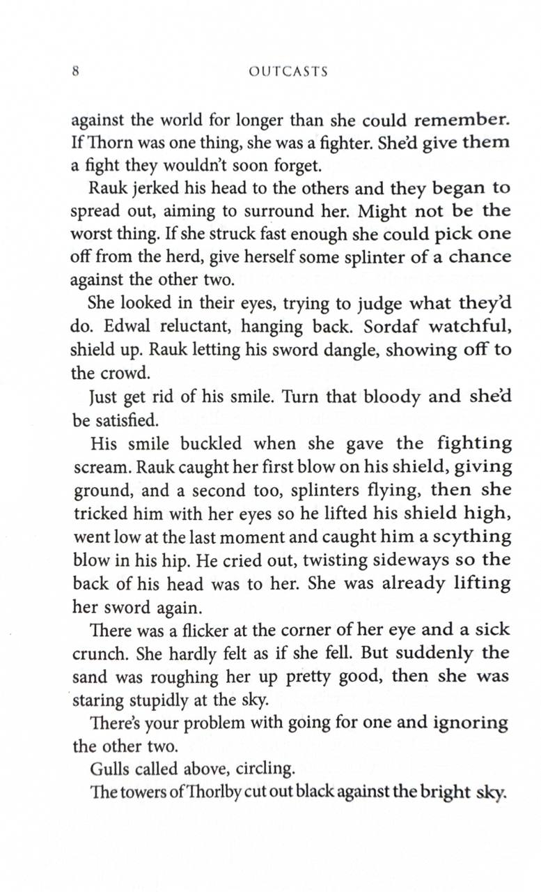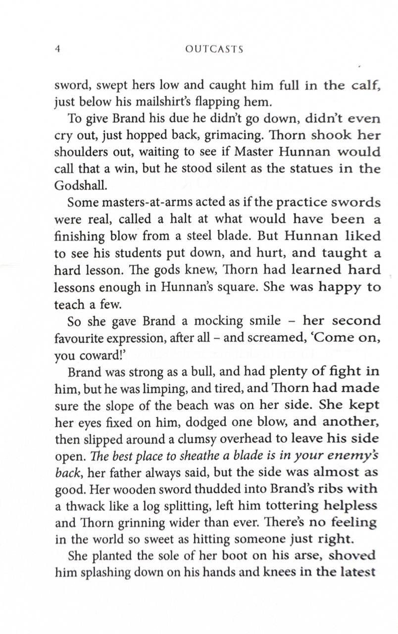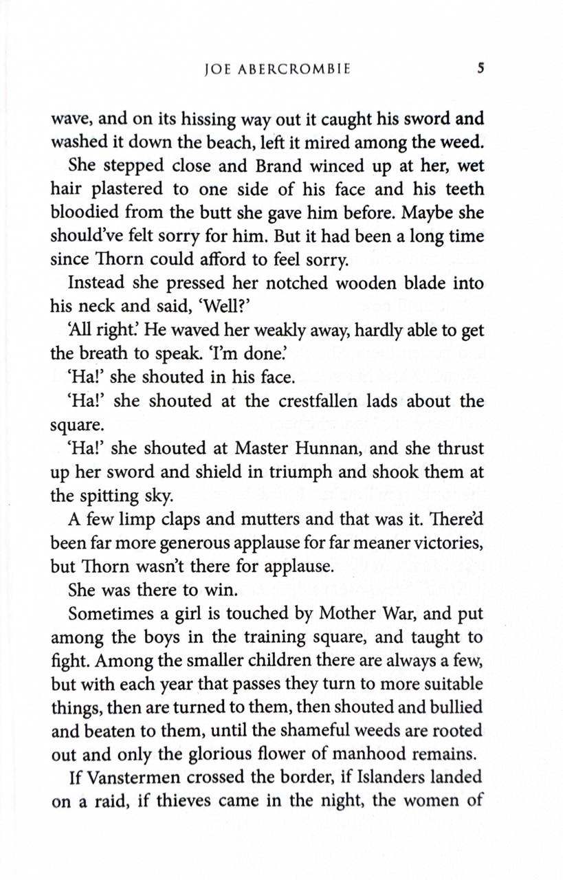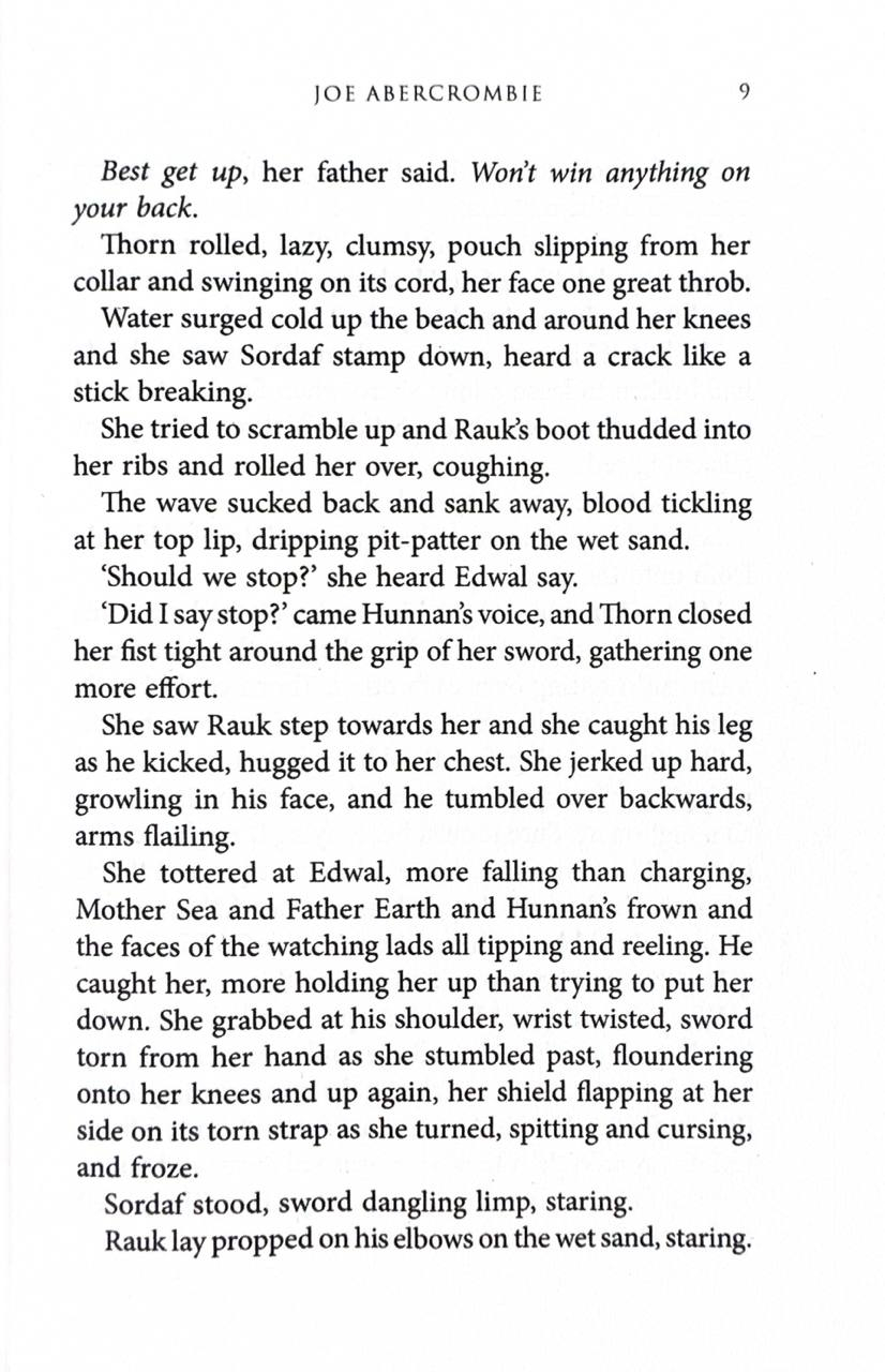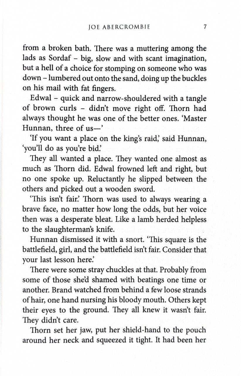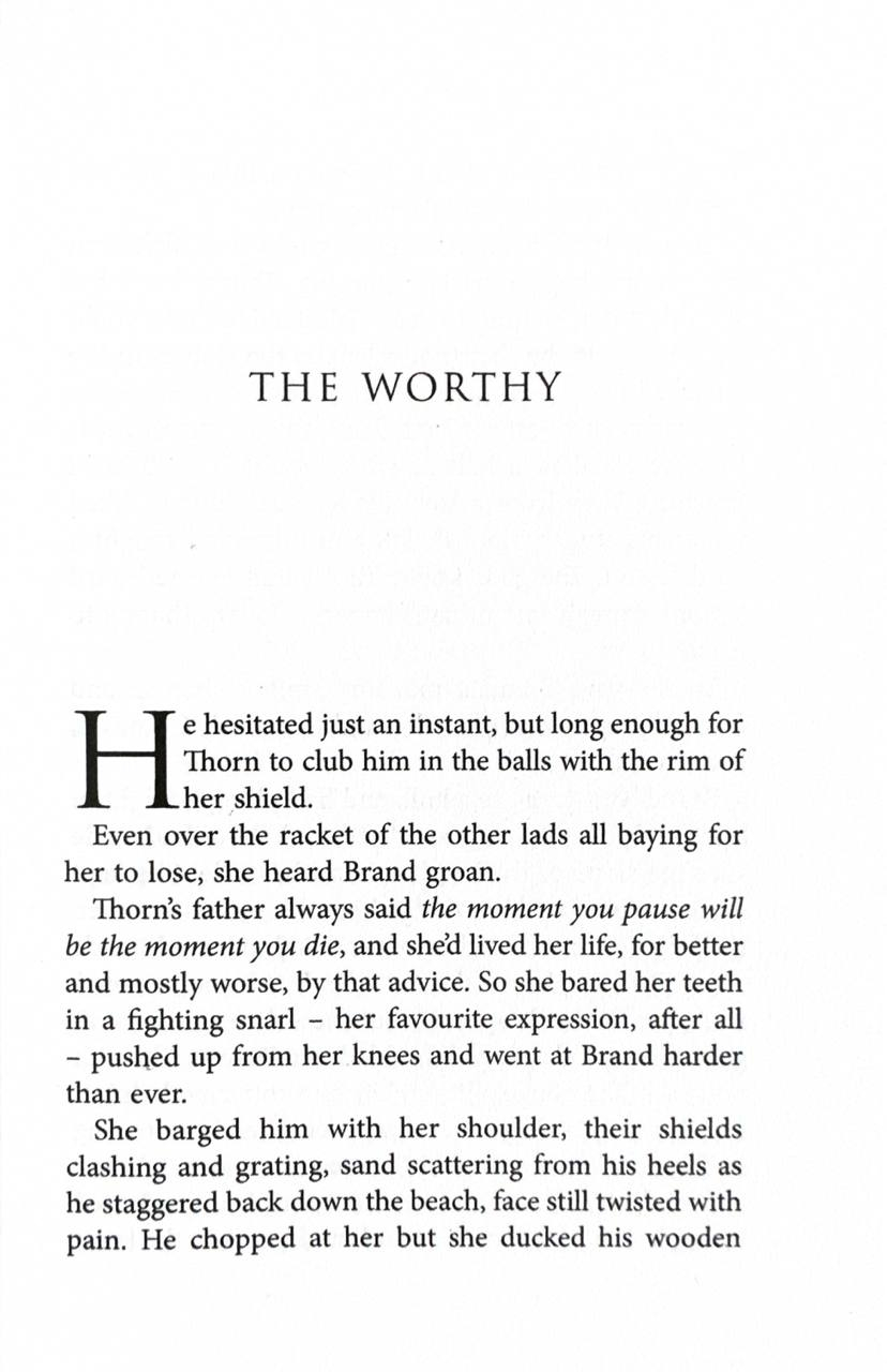 Thorn Bathu was born to fight. But when she kills a boy in the training square she finds herself named a murderer. Fate places her life in the hands of the deep-cunning Father Yarvi as he sets out to cross half the world in search of allies against the ruthless High King. Beside her is Brand, a young warrior who hates to kill. A failure in her eyes and his own, the voyage is his last chance at redemption. But warriors can be weapons, and weapons are made for one purpose. Will Thorn always be a tool in the hands of the powerful, or can she carve her own path? Is there a place outside of legend for a woman with a blade?