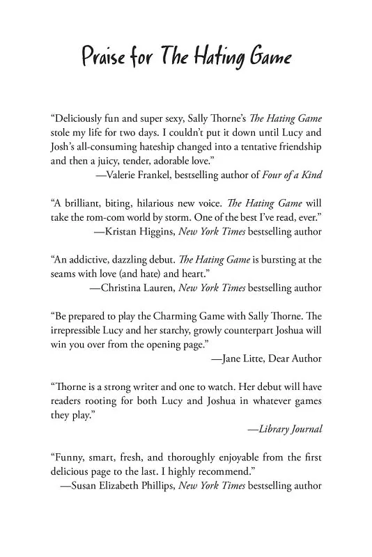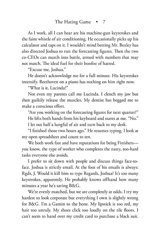 Lucy Hutton and Joshua Templeman sit across from each other every day . . . and they hate each other.Not dislike. Not begrudgingly tolerate. HATE. Lucy can't understand Joshua's joyless, uptight approach to his job and refusal to smile. Joshua is clearly baffled by Lucy's overly bright clothes, quirkiness, and desire to be liked.Now they're up for the same promotion and Lucy, usually a determined people-pleaser, has had enough: it's time to take him down. But as the tension between Lucy and Joshua reaches its boiling point, it's clear that the real battle has only just begun...