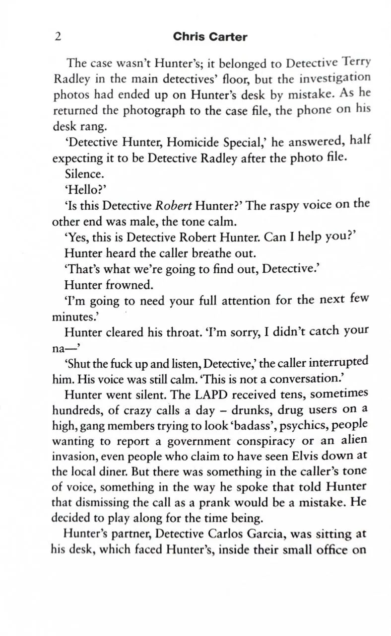 Detective Robert Hunter of the LAPD's Homicide Special Section receives an anonymous call asking him to go to a specific web address - a private broadcast. Hunter logs on and a horrific show devised for his eyes only immediately begins. The LAPD, together with the FBI, use everything at their disposal to electronically trace the transmission down, but this killer is no amateur, and he has covered his tracks from start to finish. And before Hunter and his partner Garcia are even able to get their investigation going, Hunter receives a new phone call. A new website address. A new victim. But this time the killer has upgraded his game so that anyone can take part . . .