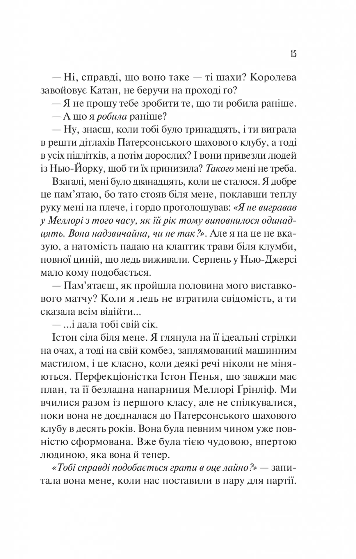 Меллорі Ґрінліф була покінчила з шахами. Чотири роки тому гра зруйнувала її родину, відтак Меллорі зосередилася на мамі, сестрах і роботі, що давала змогу утримувати сім’ю. Заради подруги вона погодилася востаннє зіграти на благодійному турнірі, і по той бік шахівниці опинився не абихто, а чемпіон світу Нолан Соєр. Усі в шоці від того, що сумнозвісного Вбивцю Королів перемогло невідоме дівчисько. Меллорі годилося б забрати виграш і піти геть. Але перемога повертає її до шахів і прочиняє двері у світ великих грошових призів. І чомусь Меллорі тягне до цього золотого хлопчика-шахіста, який промовляє до неї: «Торкнулася — ходи». Здається, навіть Нолан Соєр, знаний своїми красивими, блискучими стратегіями, не може передбачити результат їхньої партії у щось більше за великі шахи…