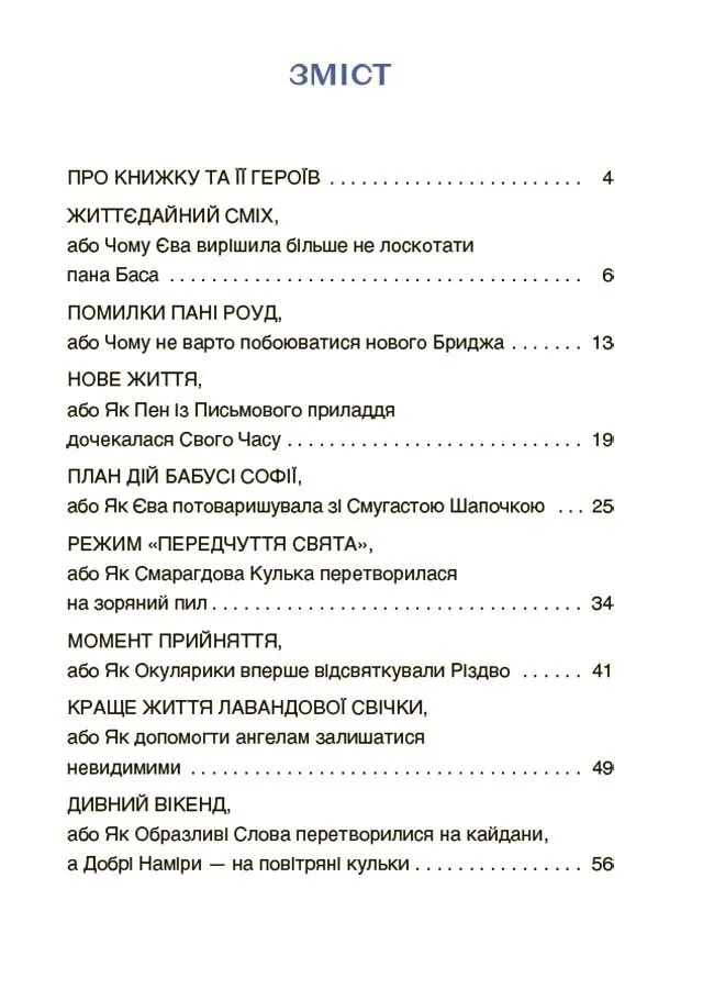 Знайомтеся, це — Єва, допитлива й непосидюча героїня серії читанок. На сторінках книжок на читачів чекають оповідання про захопливі пригоди дівчинки та її друзів, поруч з якими живуть, діють, спілкуються, подорожують, ображаються і радіють персонажі з паралельного Світу Речей: юні Окулярики, Смугаста Шапочка, Лавандова Свічка та інші герої. Кожна з трьох читанок містить 8 захопливих історій, які можна читати в довільному порядку. Наприкінці кожної історії дібрано цікаві запитання і творчі завдання для вдумливих читачів і читачок.