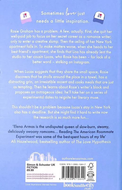 Rosie Graham has a problem. A few, actually. She just quit her well paid job to focus on her secret career as a romance writer. She hasn't told her family and now has terrible writer's block. Then, the ceiling of her New York apartment literally crumbles on her. Luckily she has her best friend Lina's spare key while she's out of town. But Rosie doesn't know that Lina has already lent her apartment to her cousin Lucas, who Rosie has been stalking-for lack of a better word-on Instagram for the last few months. Lucas seems intent on coming to her rescue like a Spanish knight in shining armour. Only this one strolls around the place in a towel, has a distracting grin, and an irresistible accent. Oh, and he cooks.Lucas offers to let Rosie stay with him, at least until she can find some affordable temporary housing. And then he proposes an outrageous experiment to bring back her literary muse and meet her deadline: He'll take her on a series of experimental dates meant to jump-start her romantic inspiration. Rosie has nothing to lose. Her silly, online crush is totally under control-but Lucas's time in New York has an expiration date, and six weeks may not be enough, for either her or her deadline.