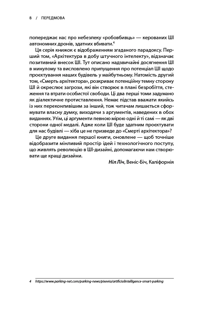 Уперше опублікована 2022 року, ця книжка Ніла Ліча зараз готується до другого видання, запланованого на 2025 рік. Але оновлена версія «Архітектури в добу штучного інтелекту» українською мовою побачить світ раніше — вже влітку 2024 року! Автор люб’язно запропонував урахувати в українському перекладі зміни, які він зробив для другого видання, «щоб точніше відобразити мінливий простір ідей і технологічного поступу, які живлять революцію в ШІ-дизайні».