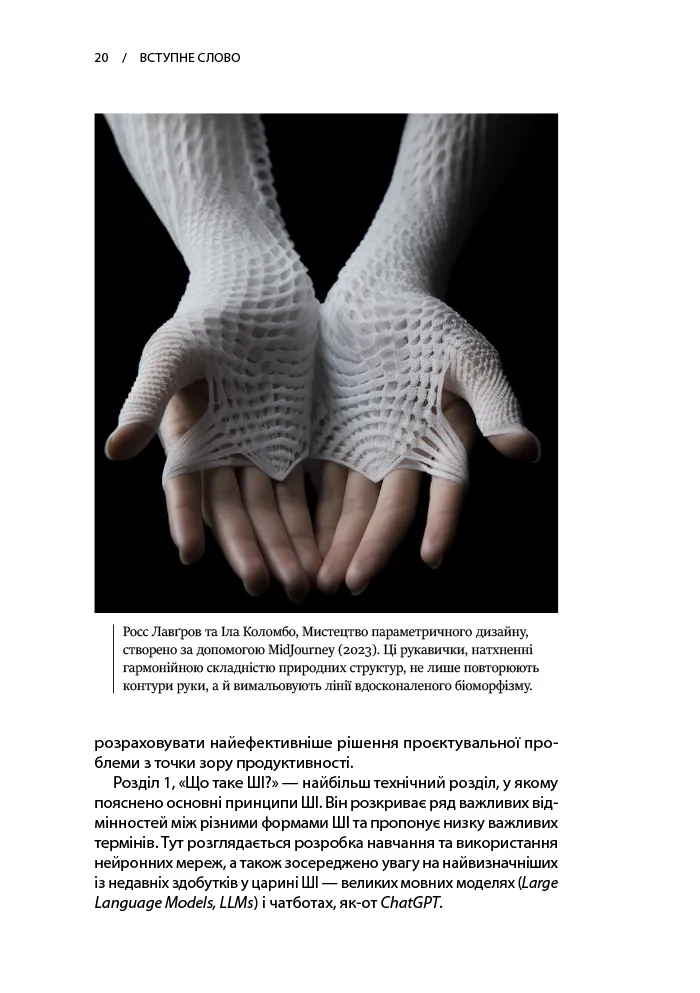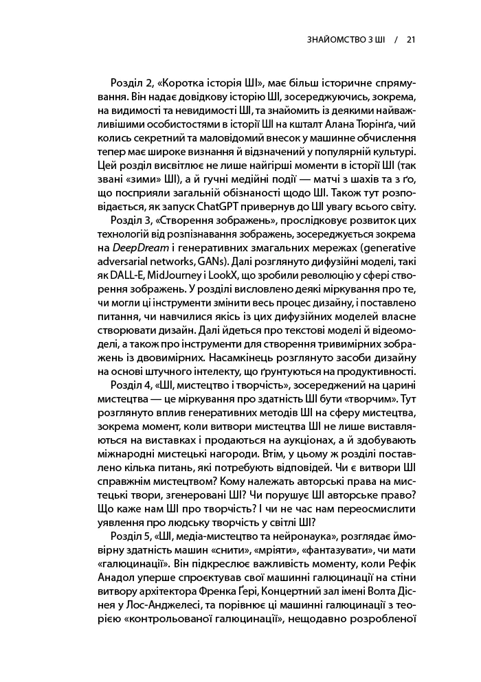 Ніл Ліч пише про застосування штучного інтелекту в архітектурі та «місто-мозок» майбутнього в дуже широкому контексті — після стислого огляду історії розвитку ШІ він ділиться міркуваннями на радше філософські теми, як-от здатність ШІ до творчості чи переосмислення мистецтва і взагалі процесів людського мислення в дзеркалі ШІ. Утім, йому йдеться також про багато цілком практичних речей — від проблем авторського права до конкретних програм, що їх уже сьогодні з різною метою використовують архітектори. Крім украй насиченого інформативно тексту, ця книжка також забезпечить Вам величезний список до читання й безліч лінків для подальших розвідок: у ній приблизно сімсот приміток.