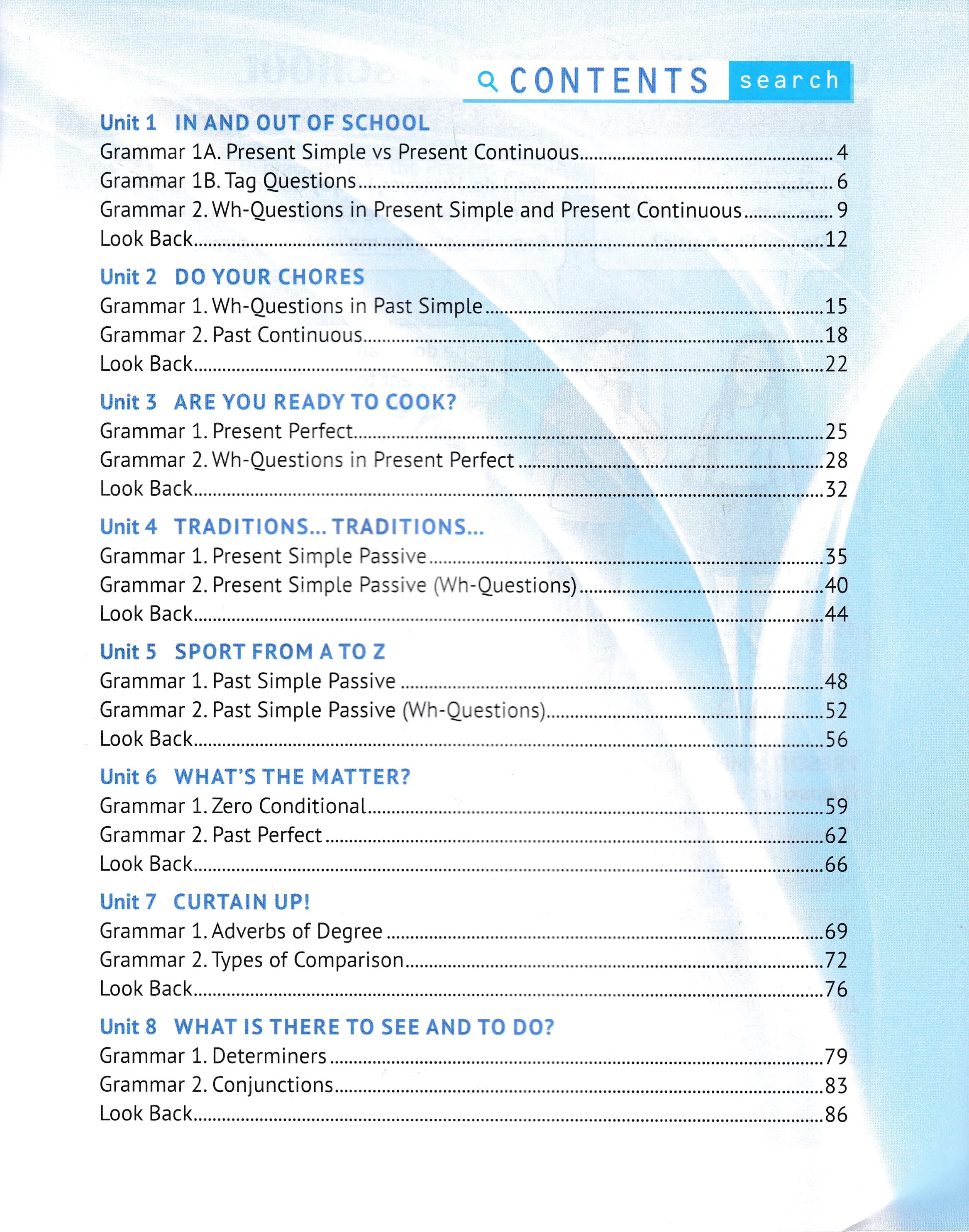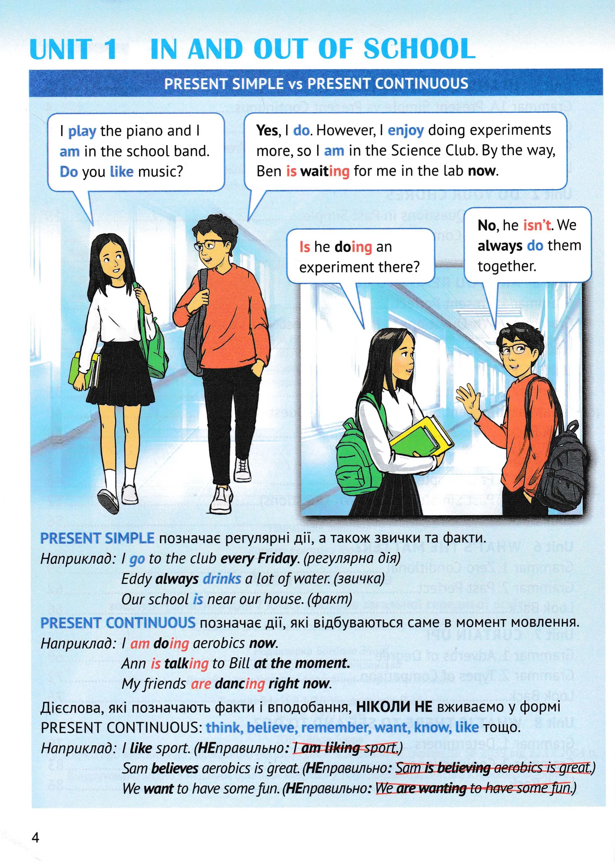 Розуміння граматичних явищ відбувається через ілюстровану презентацію комунікативної ситуації, правила, викладені українською мовою, пояснення про формоутворення та зразки. У посібнику чимало вправ для кращого засвоєння граматики та закріплення у мовленнєвих завданнях.