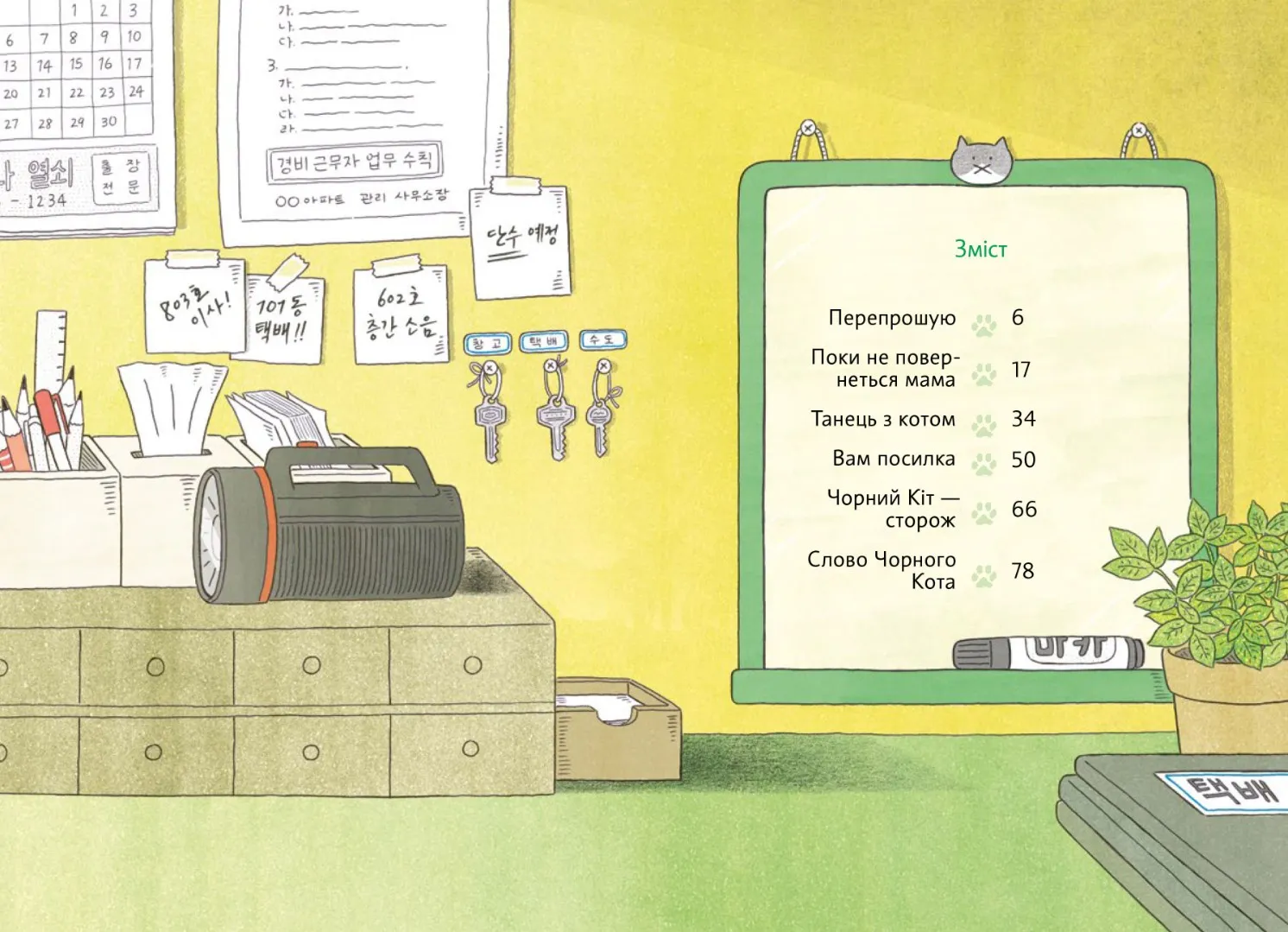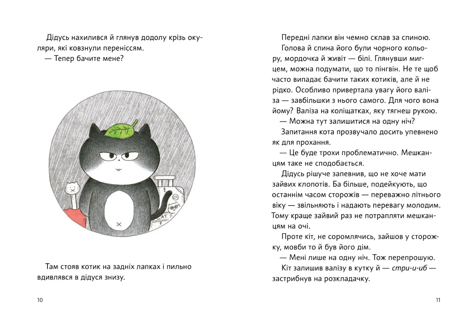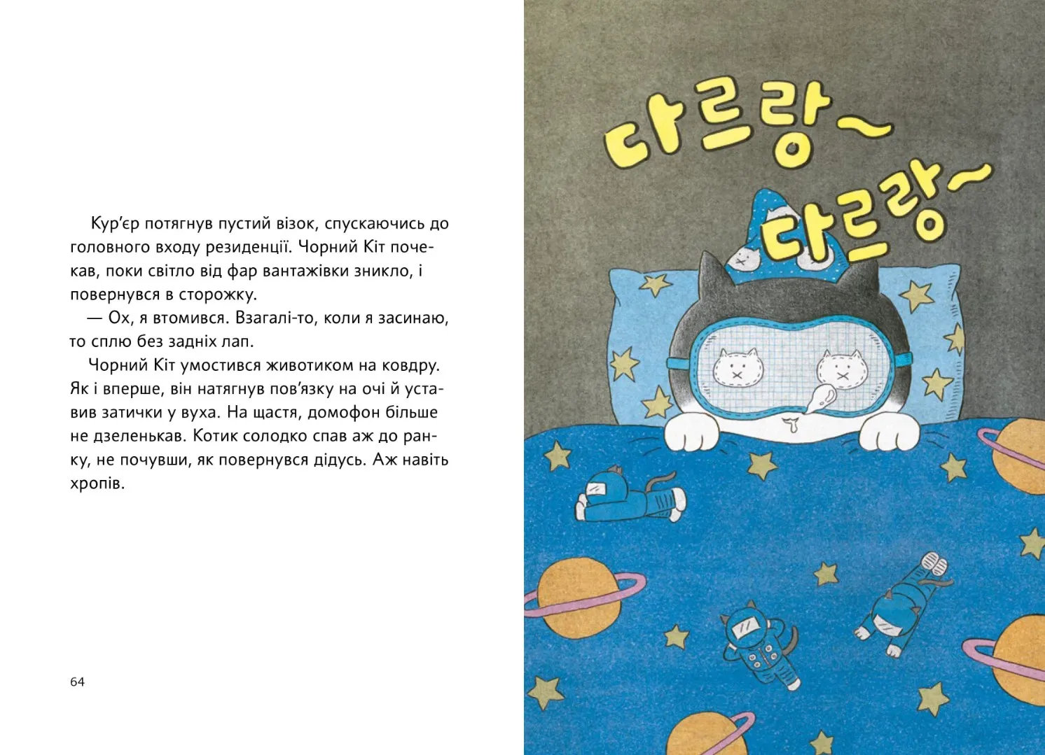 Одного дощового вечора до сторожки постукав… Чорний Кіт. Дідусь-охоронець впустив переночувати незвичайного гостя, однак виспатися Чорному Коту не вдалося. Адже в резиденції повсякчас щось відбувається! Хтось галасує, голосно тупотить, грається з домофоном, ще й кур’єр з посилками приїхав. І вирішувати те все доводиться Чорному Коту.